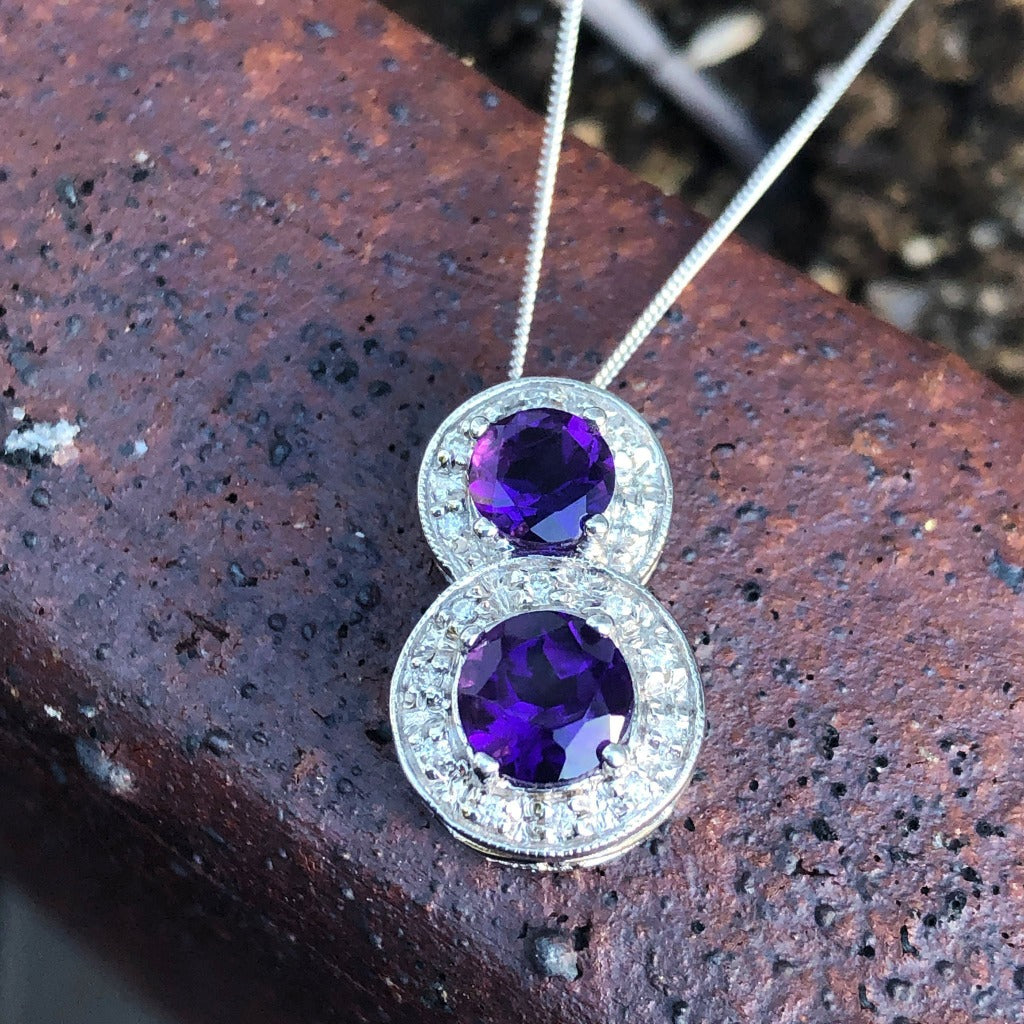 The design of this pendant is doubly arresting, featuring two round cut amethysts set in circular diamond encrusted white gold surrounds raised on a contemporary filigree cage.