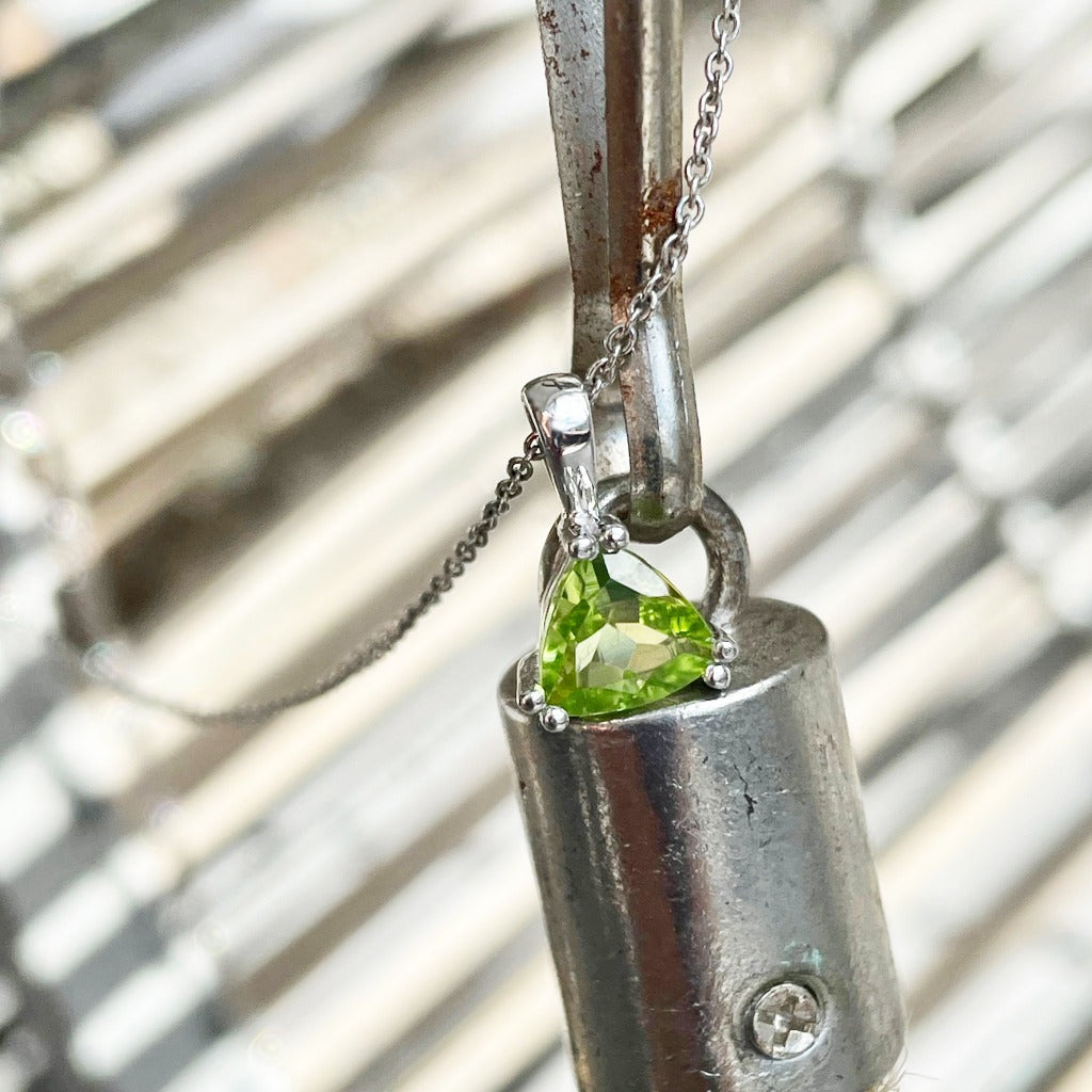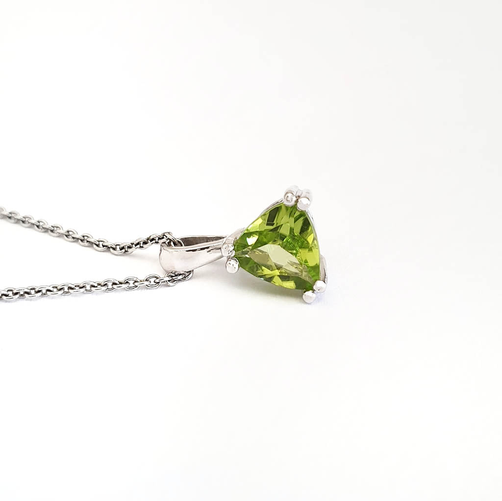 Lustrous white gold and peridot blend in this radiant pendant to create a beautiful colour palette of springtime hues. The longing to shrug off winter and bloom with all the romance and renewal is encapsulated in the verdant tones of the peridot, reminiscent of the first new leaves. An exquisitely crafted double claw setting adds fine detailing and opulence to the delicate pendant, which comes suspended on a light white gold anchor chain.