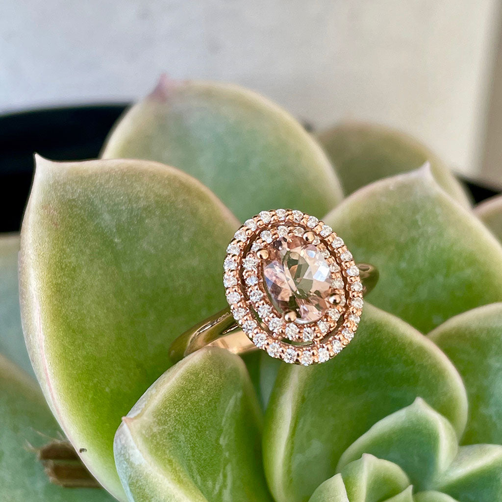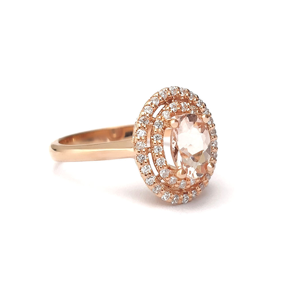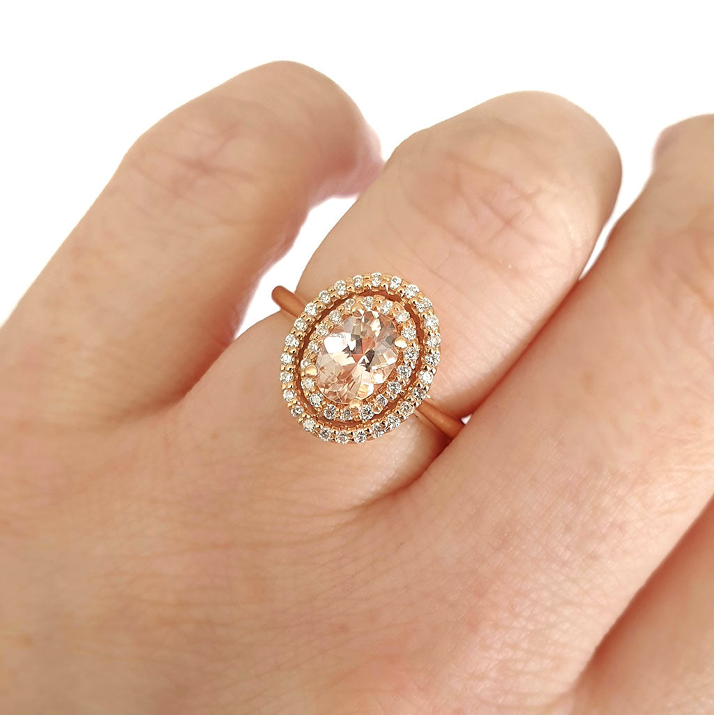 Glamorous Oval Morganite and Double Diamond Halo Rose Gold Ring