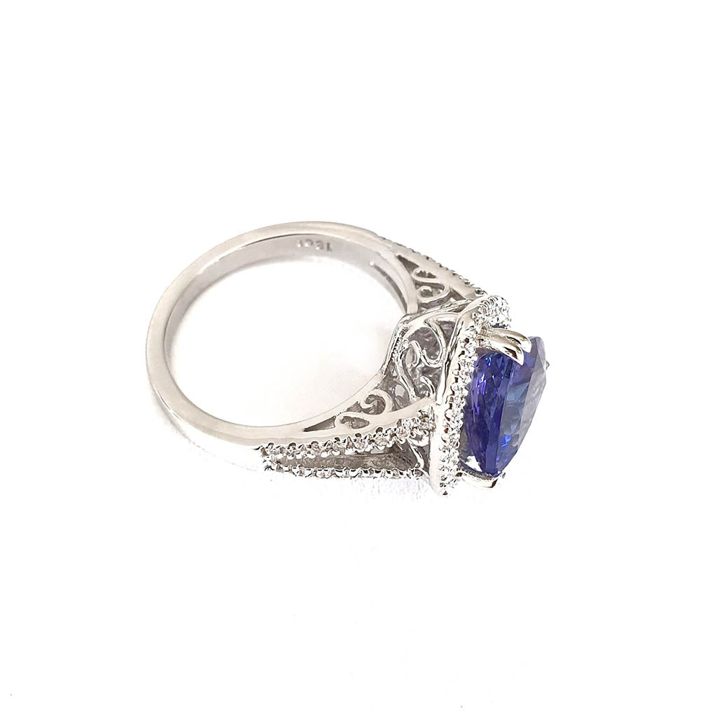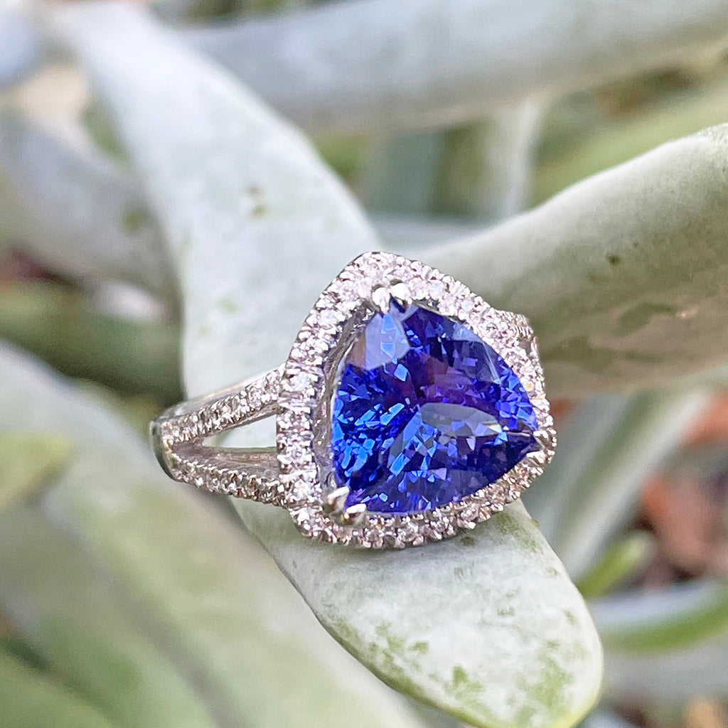 An elevated trilliant tanzanite sits above a diamond halo on diamond encrusted open shoulders in a ring so stunning it will leave you breathless. A filigree basket at the base adds a decorative touch that adds to the light penetration of the stone, enhancing tanzanite's incredible  pleochroism* as the light hits it from all directions.