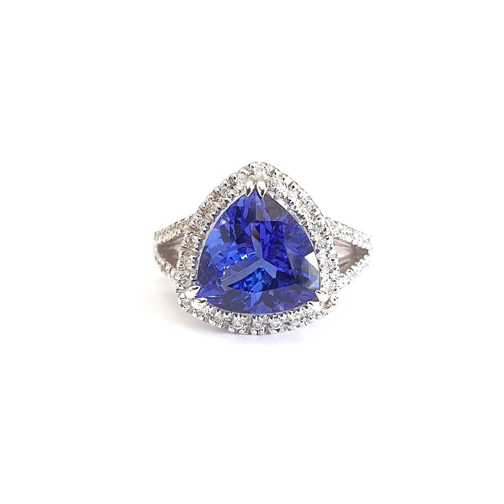 Centre stone: Tanzanite; weight: 3.56ct; cut: trilliant; colour:blue/VIOLET; saturation: Vivid+; clarity: Eye Clean