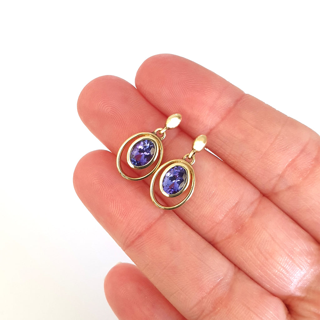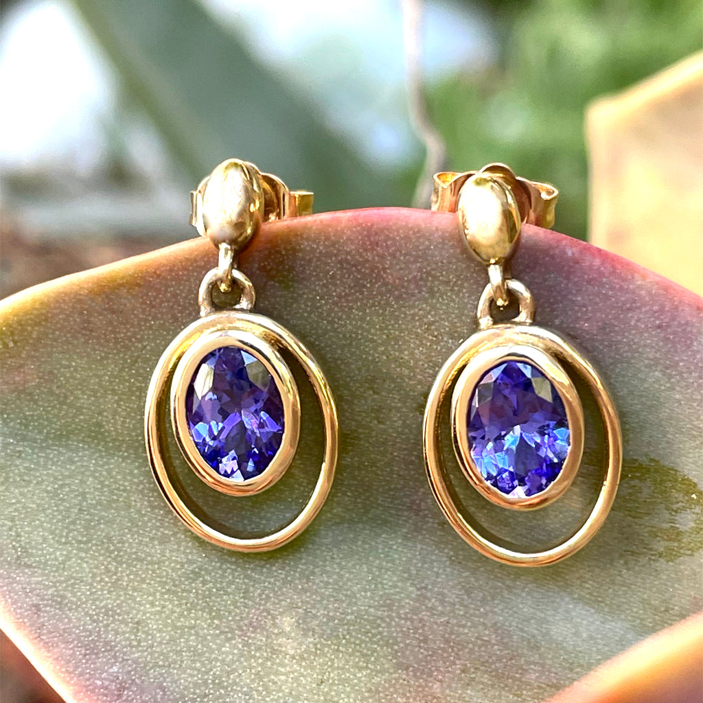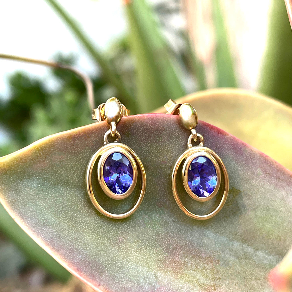 Double Hoop Oval Cut Bezel Set Tanzanite Drop Earrings