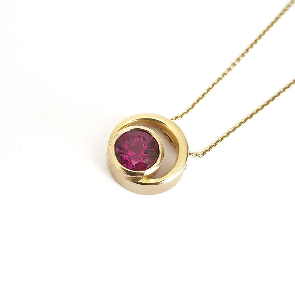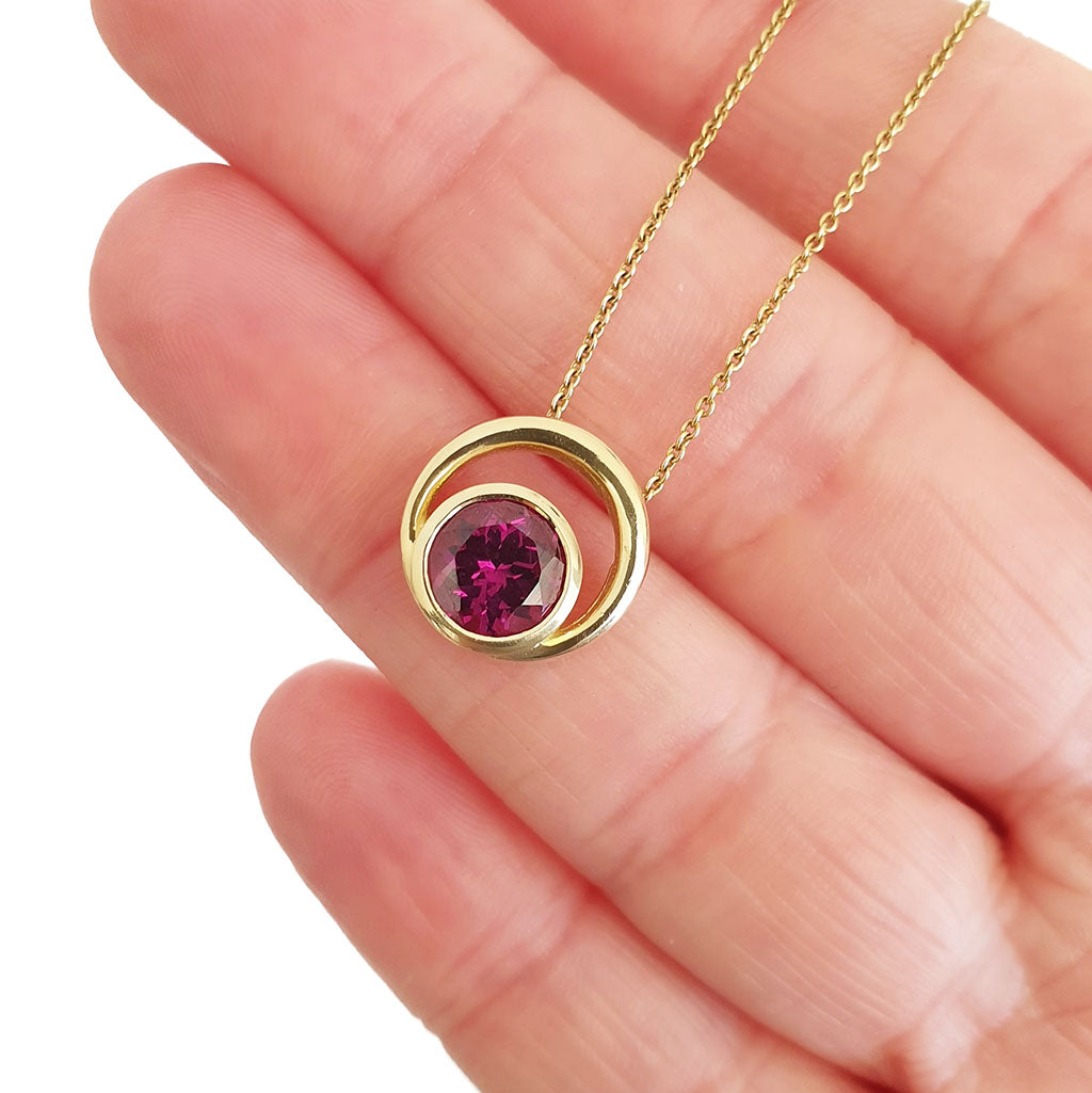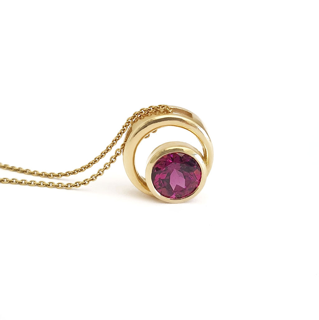 The delectable purple-magenta hues of grape garnet is complemented by the warm tones of the double round yellow gold setting. It's empire of the sun, but with a pop twist.