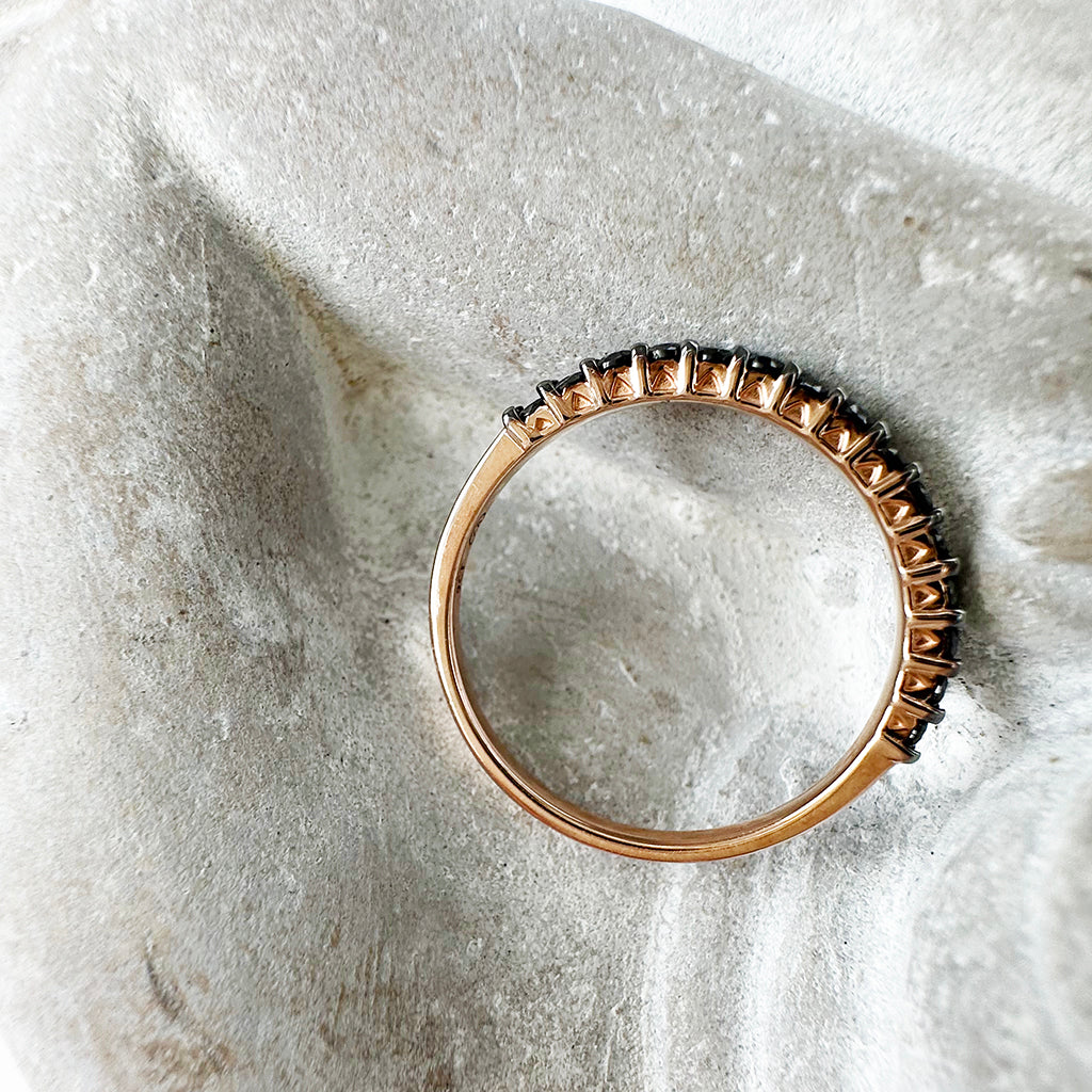 Crafted from incandescent rose gold, this ring exudes sophistication with a seemingly never-ending row of meticulously set black diamonds. The monochrome styling is enhanced with black plating across the claws cradling each diamond for a dramatic graphic impact. The refined design offers a comfort fit that effortlessly complements any ensemble, making it a versatile and enduring symbol of love and commitment.