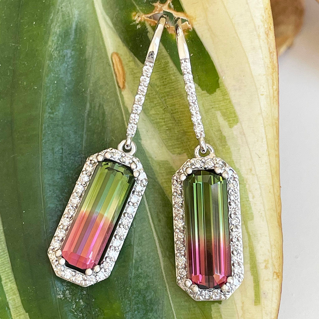 Each baguette-cut watermelon tourmaline fades from fresh green to ripe pink. Framed in sparkling diamond halos and dangling from a delicate pavé diamond ladder, they sway with the kind of confidence that turns heads across manicured lawns and moonlit ballrooms.