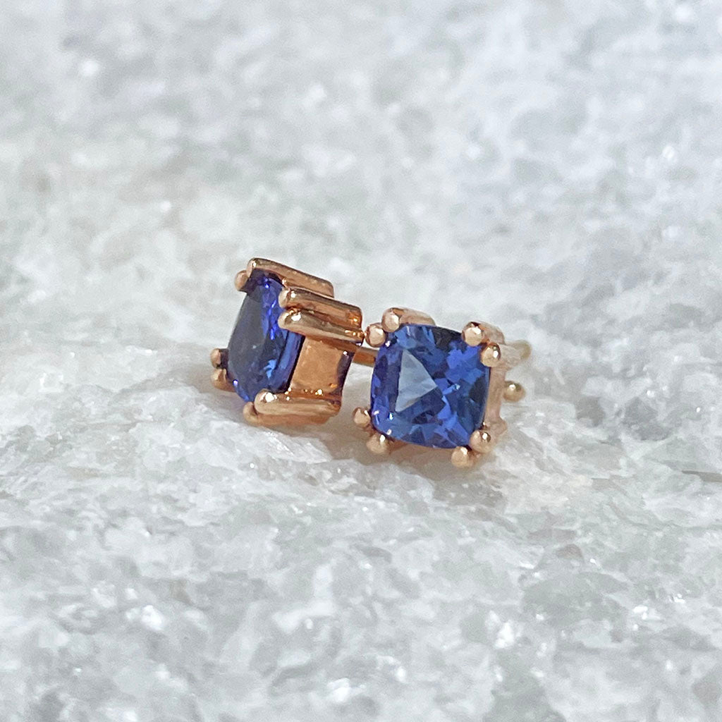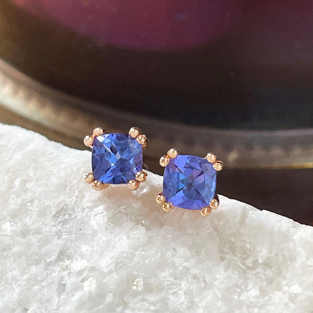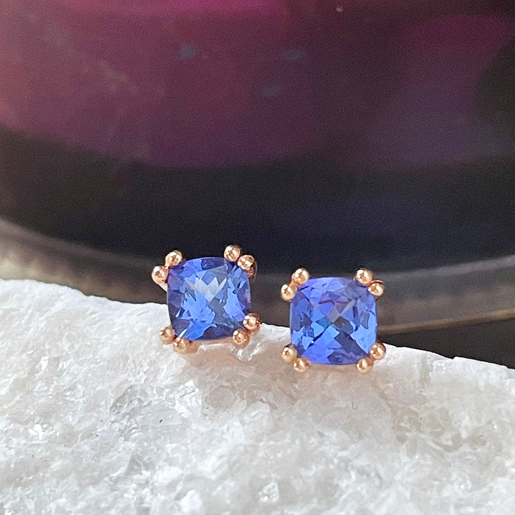 Elegant Double Claw Cushion Cut Rose Gold Tanzanite Studs