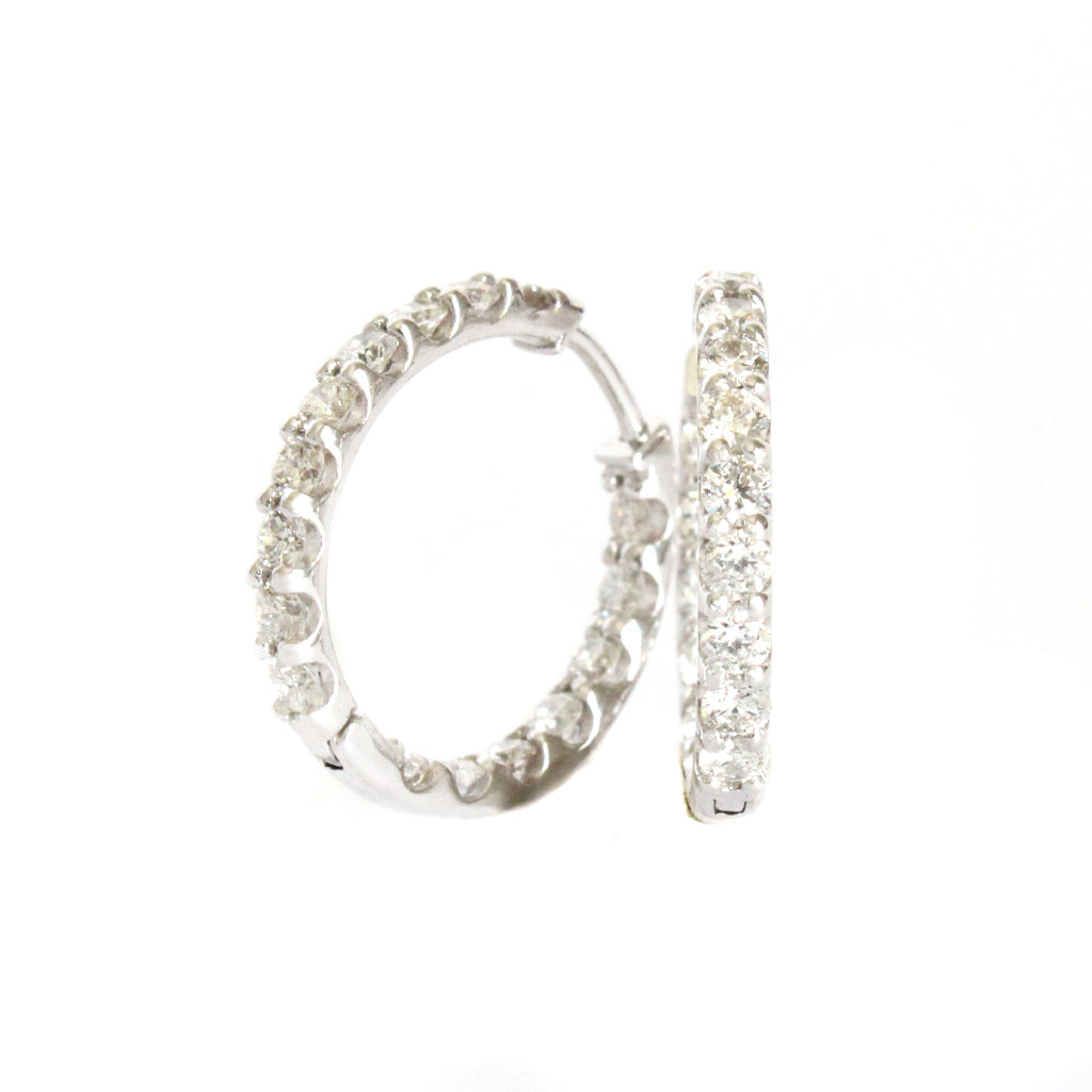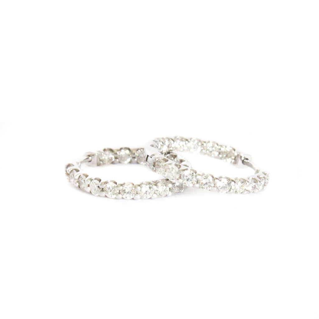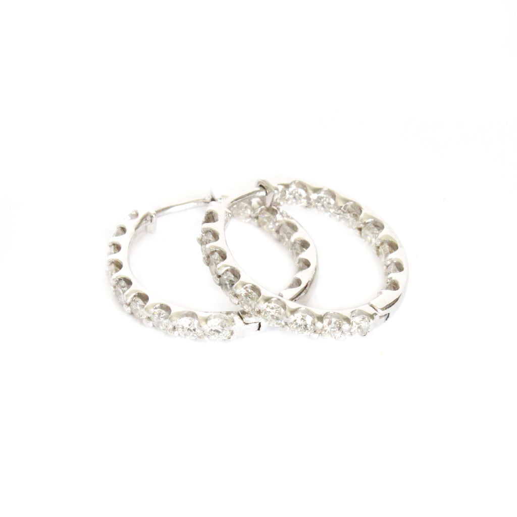 There are times when you want to be bold, and times when the art of subtlety is far more effective. This elegant pair of diamond and white gold hoop earrings, masterfully crafted to exhibit the beauty of each individual diamond, are an artful way to display your luxurious sense of style with elegance and grace.