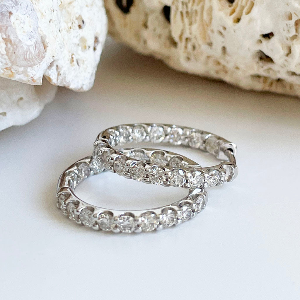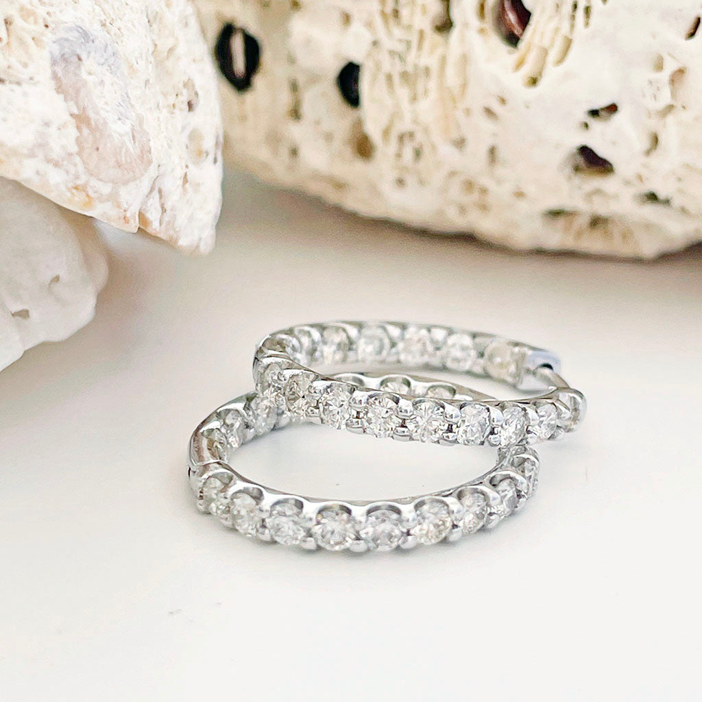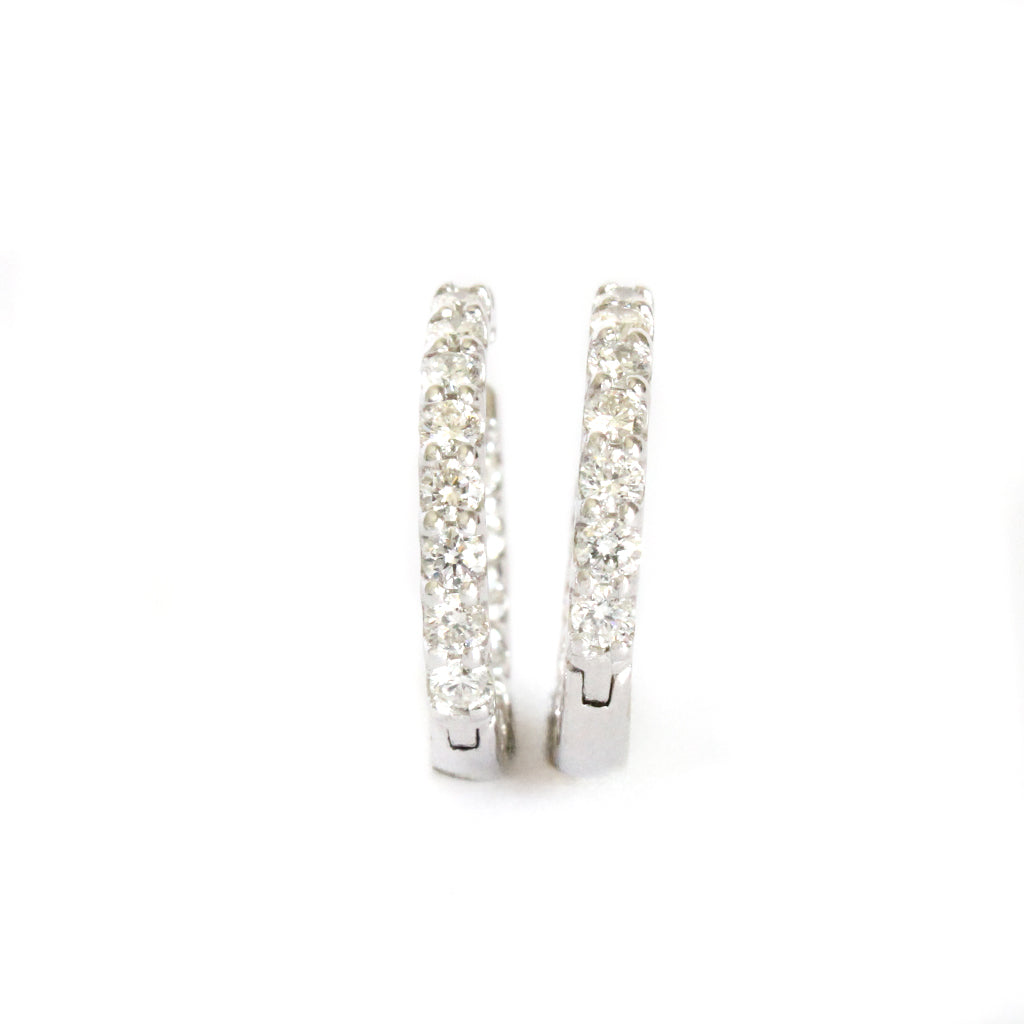 There are times when you want to be bold, and times when the art of subtlety is far more effective. This elegant pair of diamond and white gold hoop earrings, masterfully crafted to exhibit the beauty of each individual diamond, are an artful way to display your luxurious sense of style with elegance and grace.