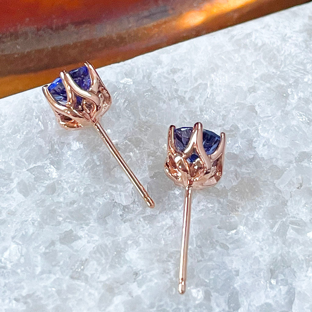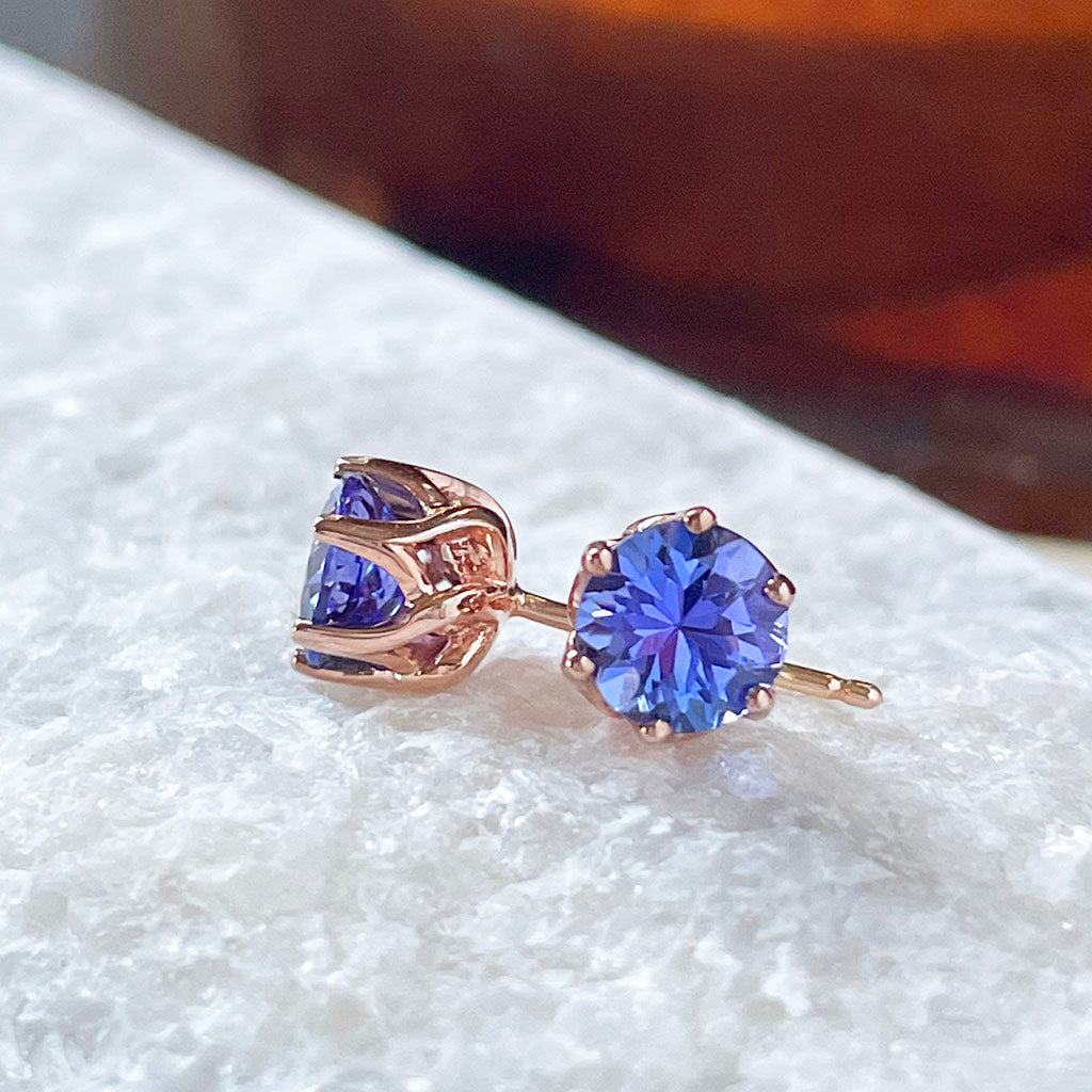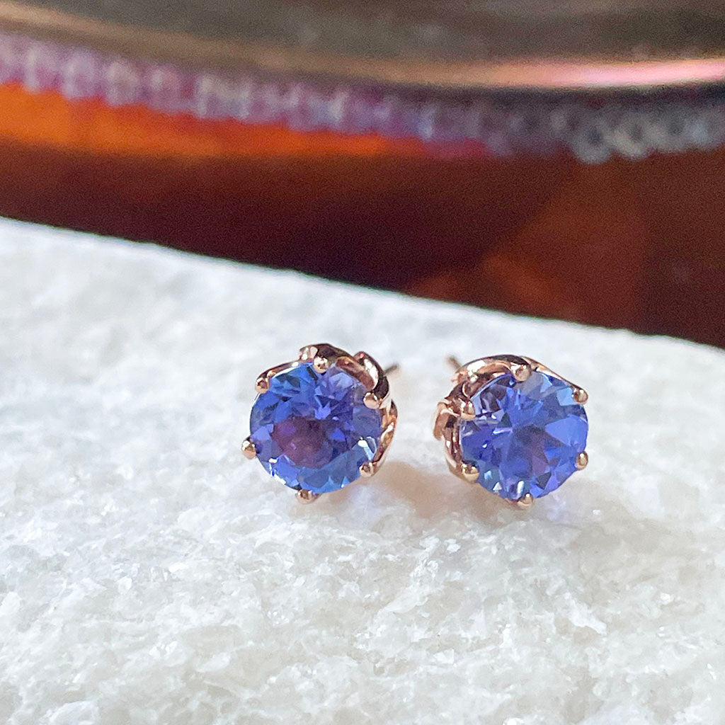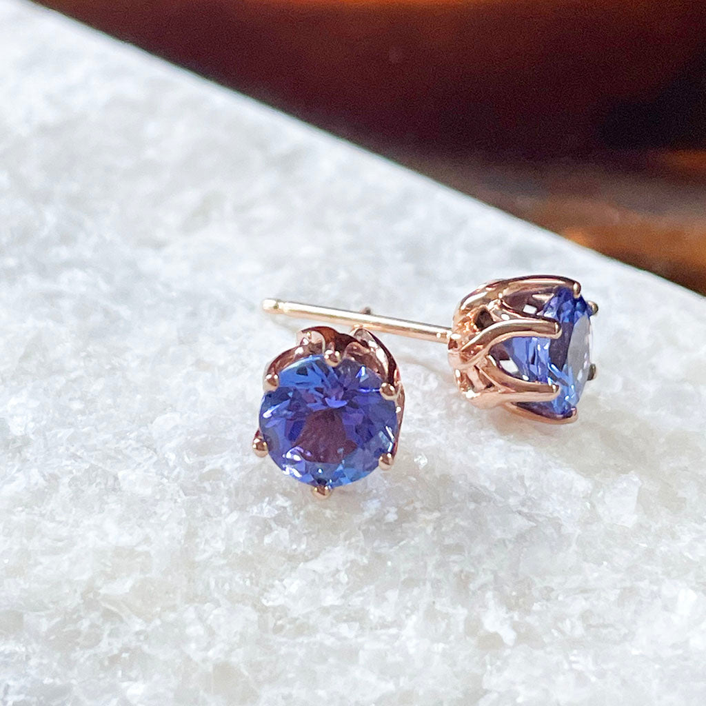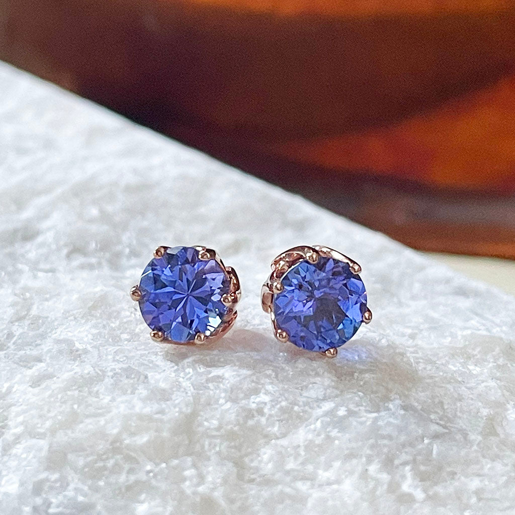 Elegant Floral Six Claw Round Cut Tanzanite Rose Gold Studs