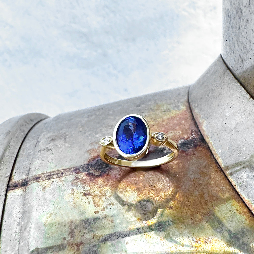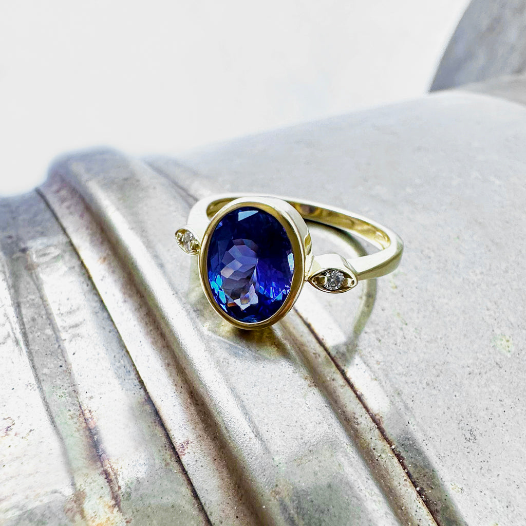 Elegant Oval Bezel Set Tanzanite with Petite Diamond Highlight Yellow Gold Ring