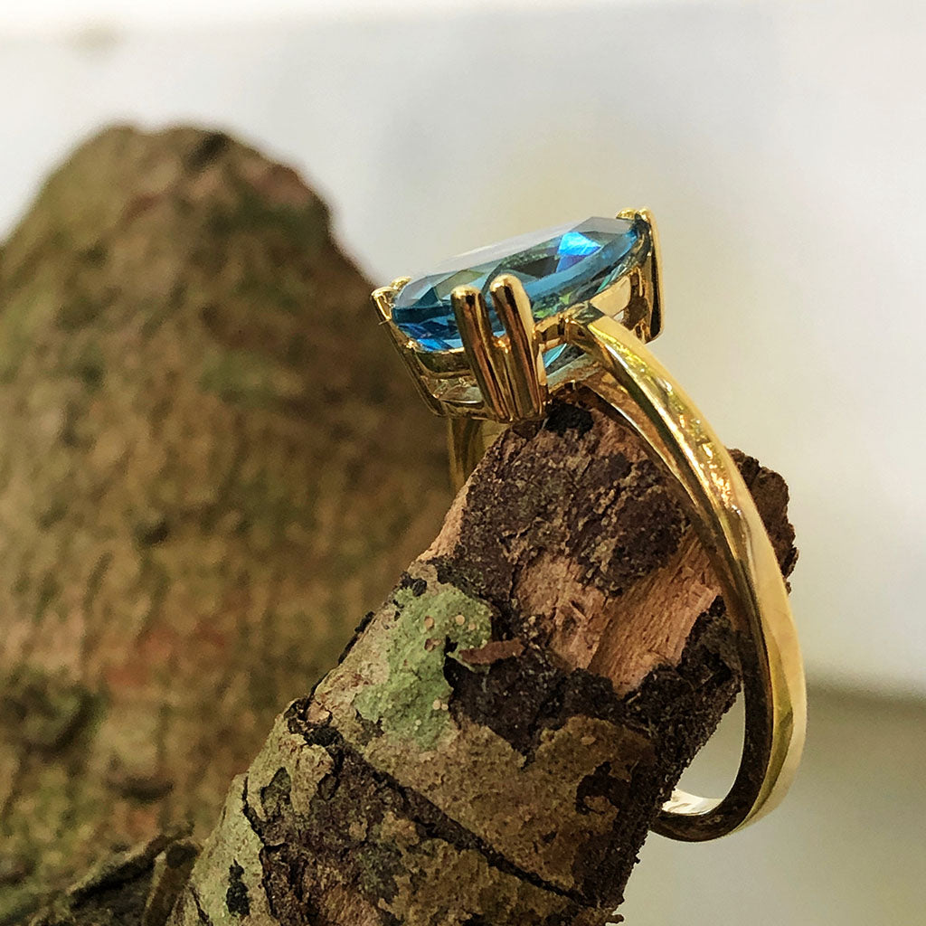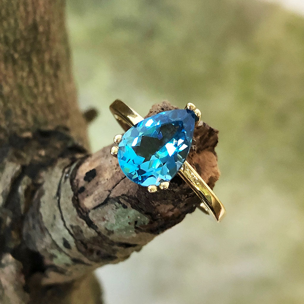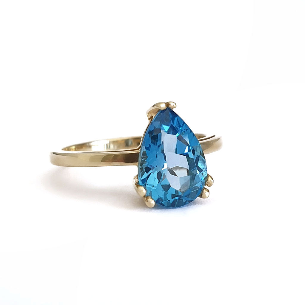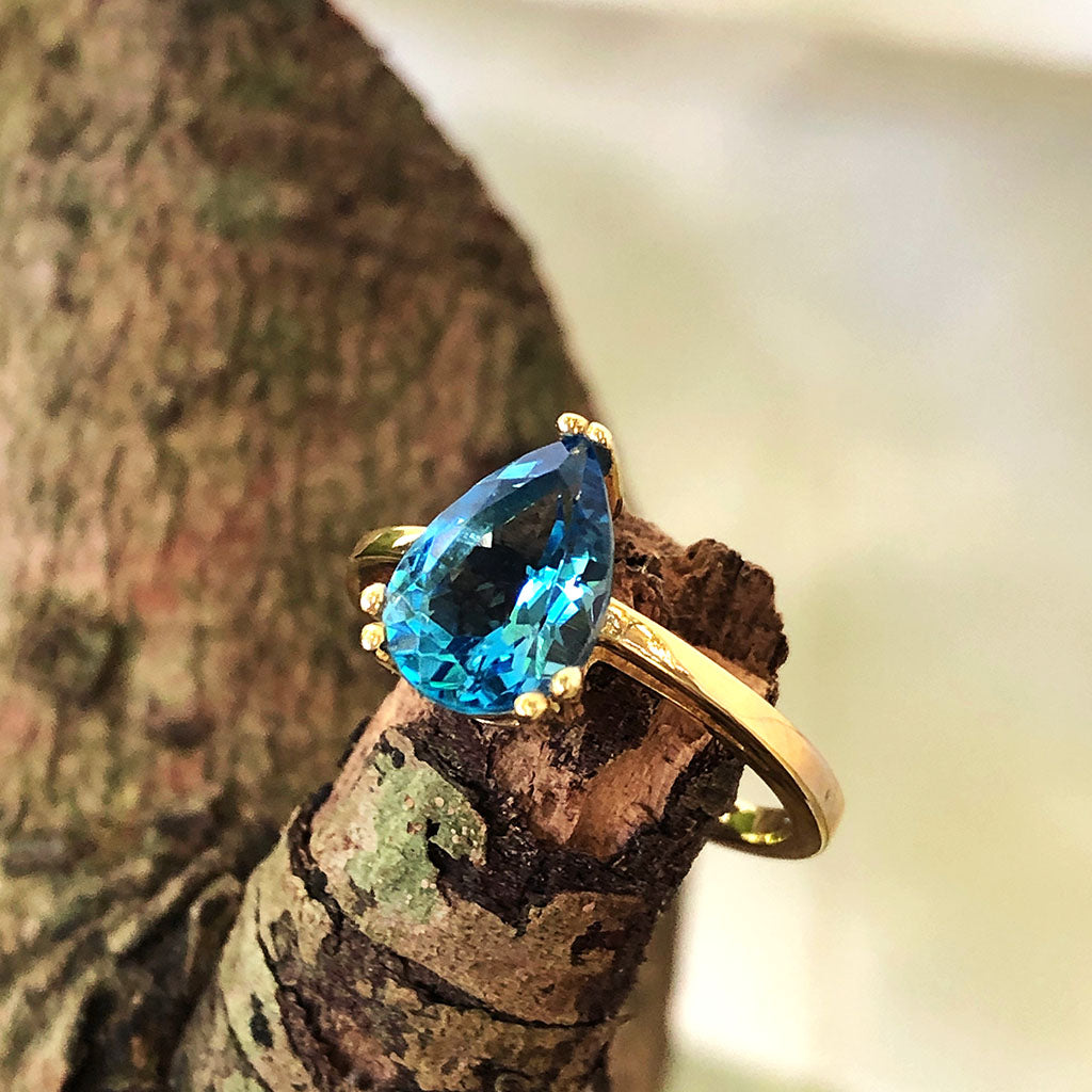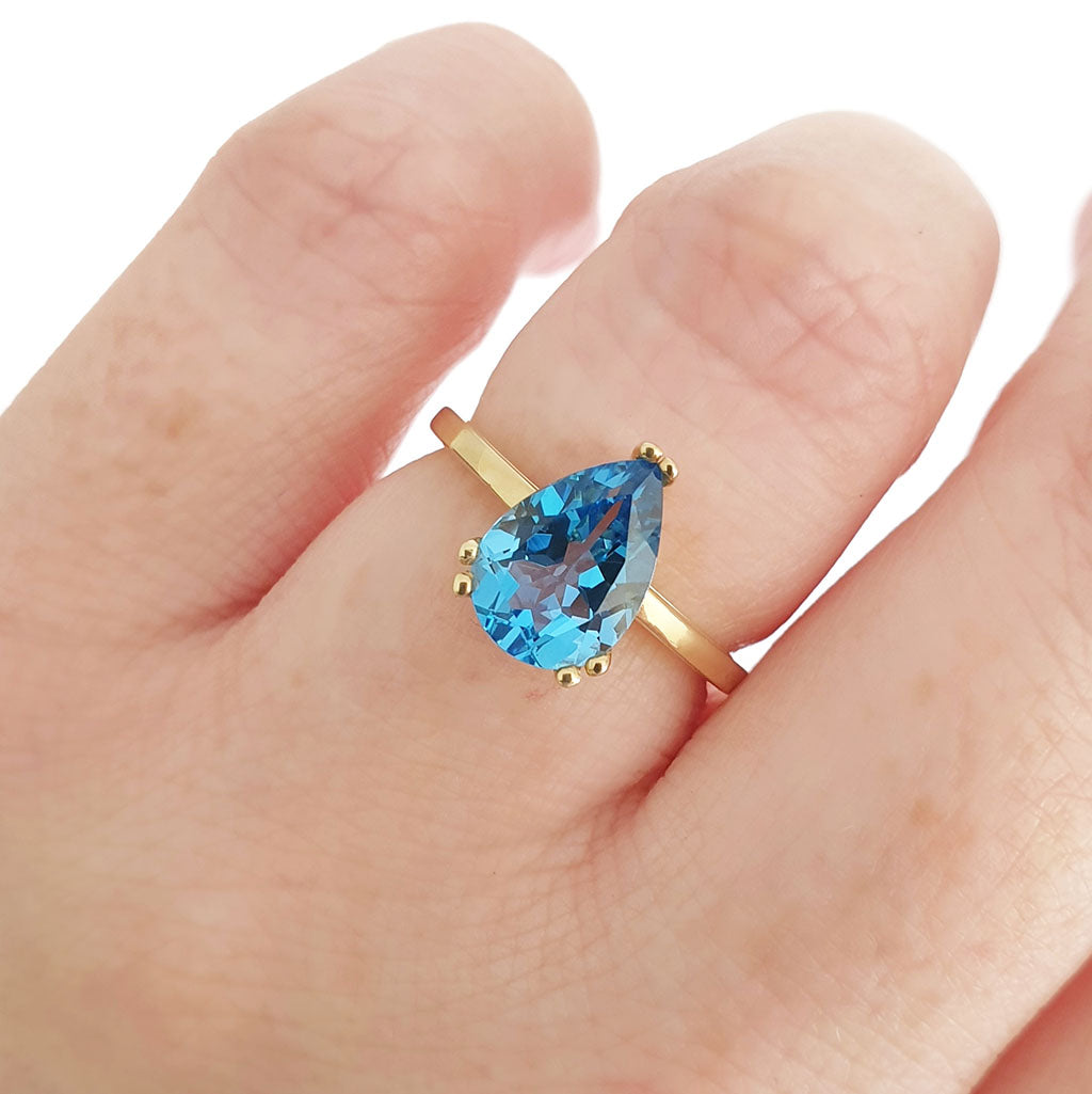 Elegant Solitaire Pear Cut London Blue Topaz Yellow Gold Ring