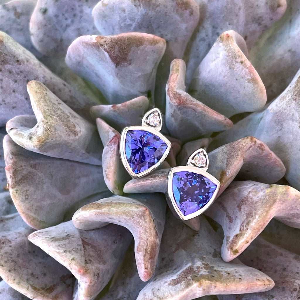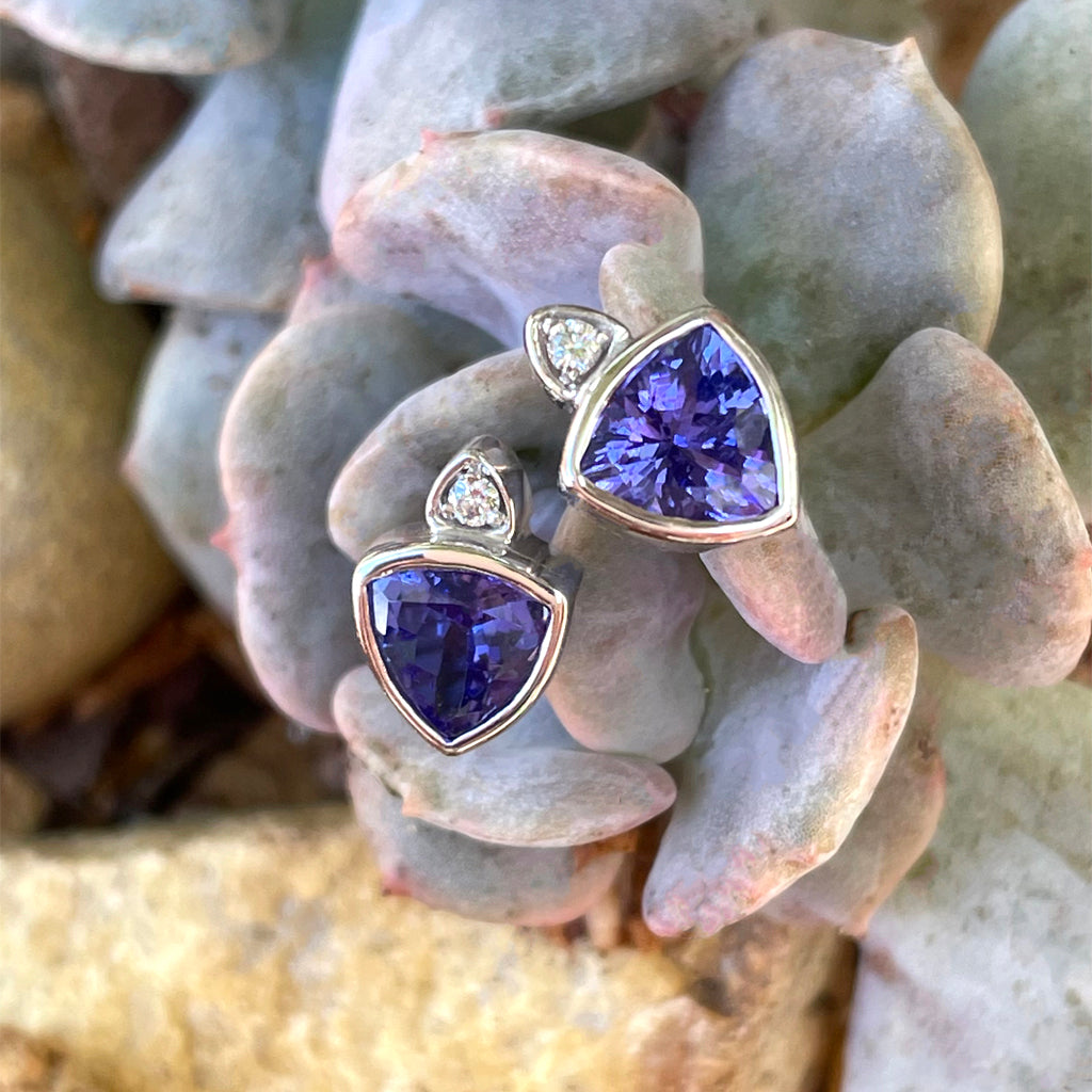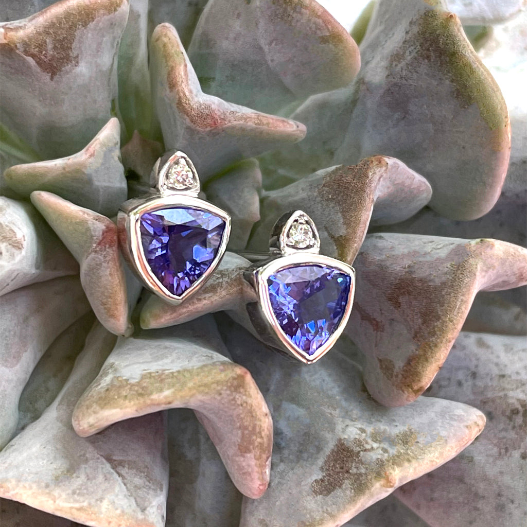 Elegant Trilliant Bezel Set Tanzanite and White Diamond Studs