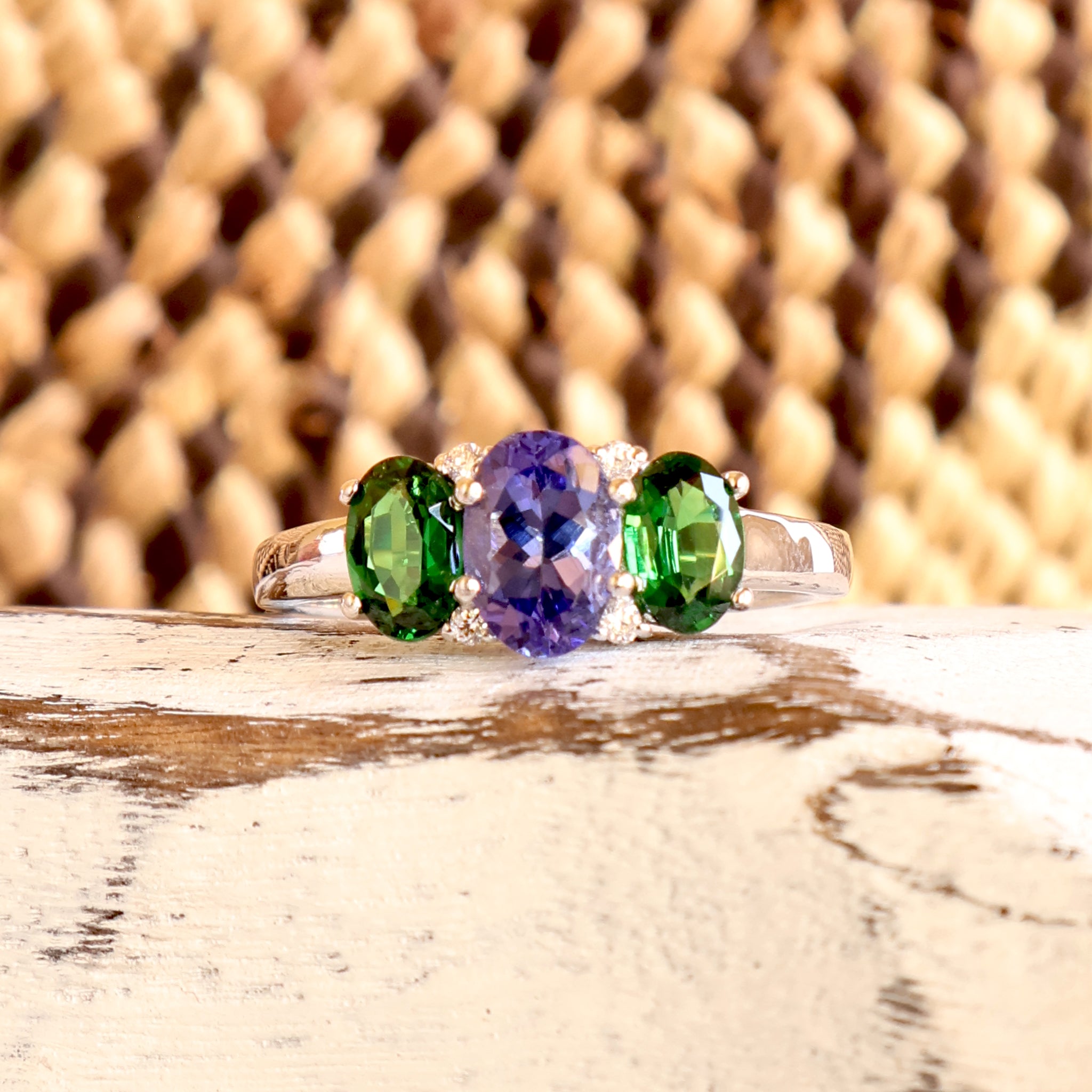 Elegant Trilogy Tanzanite and Tsavorite Diamond Ring White Gold Ring