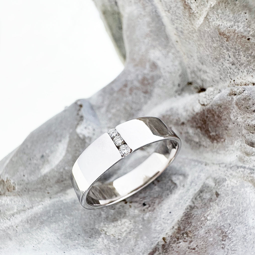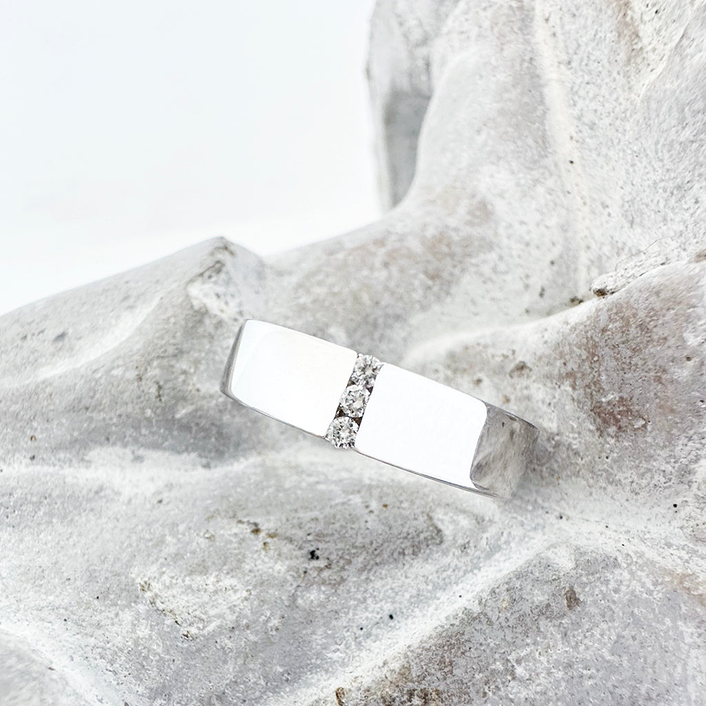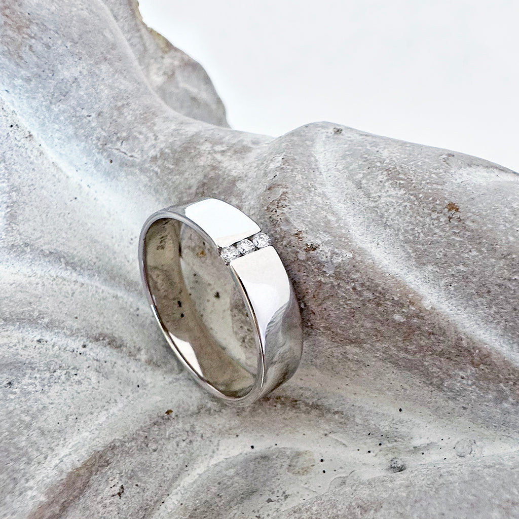 Celebrate everlasting love with the timeless elegance of an exquisite white gold band. Meticulously polished to a radiant gleam, the band is detailed with three channel-set diamonds, creating a harmonious balance of brilliance, sophistication and grace. Elevate your most special moment with this stunning piece, crafted to marry beauty and the essence of enduring love in its subtle perfection.