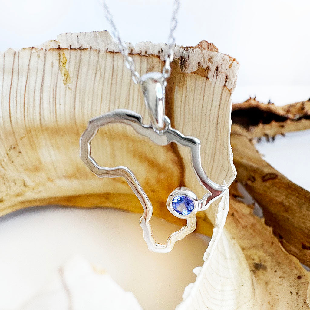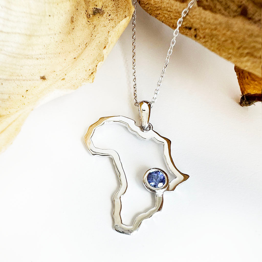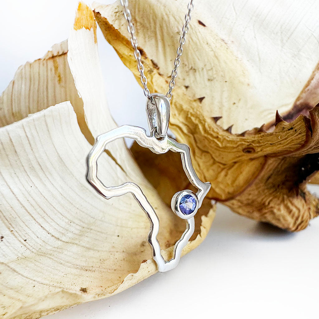 Elegantly Styled White Gold Africa Map pendant with Bezel Set Tanzanite Highlight Pendant