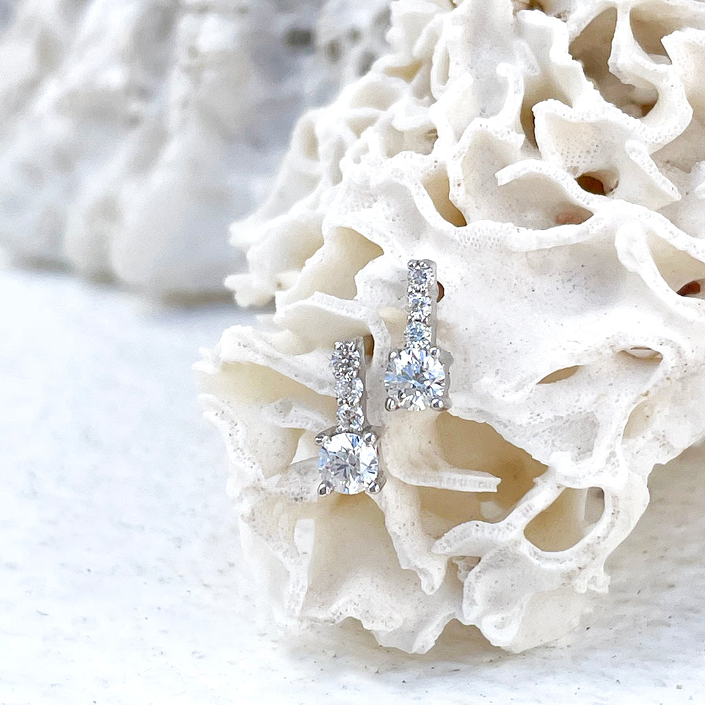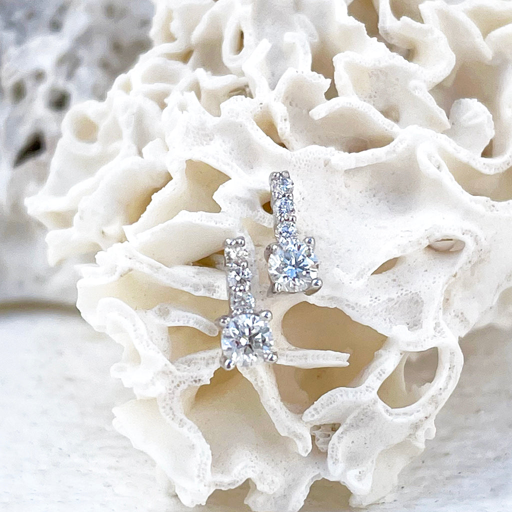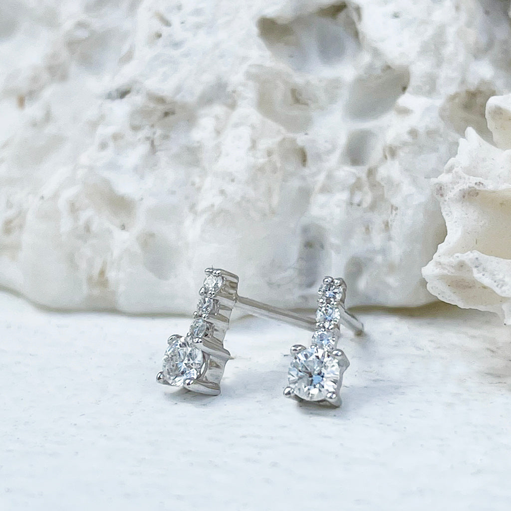 These delightful studs feature sparkling white diamonds and bright white gold. The stack of three smaller diamonds situates the feature diamond at the edge of the earlobe, giving these studs a unique charm that sets them apart from single stone studs.