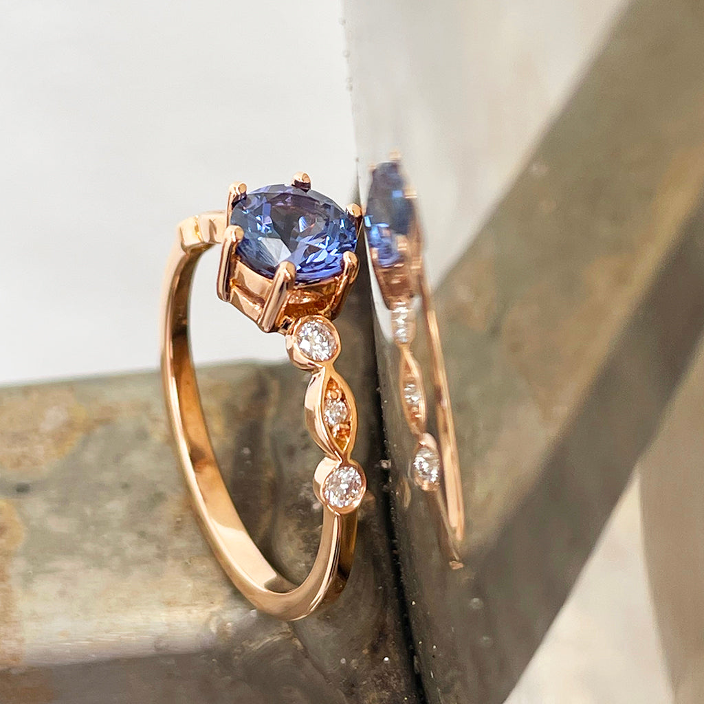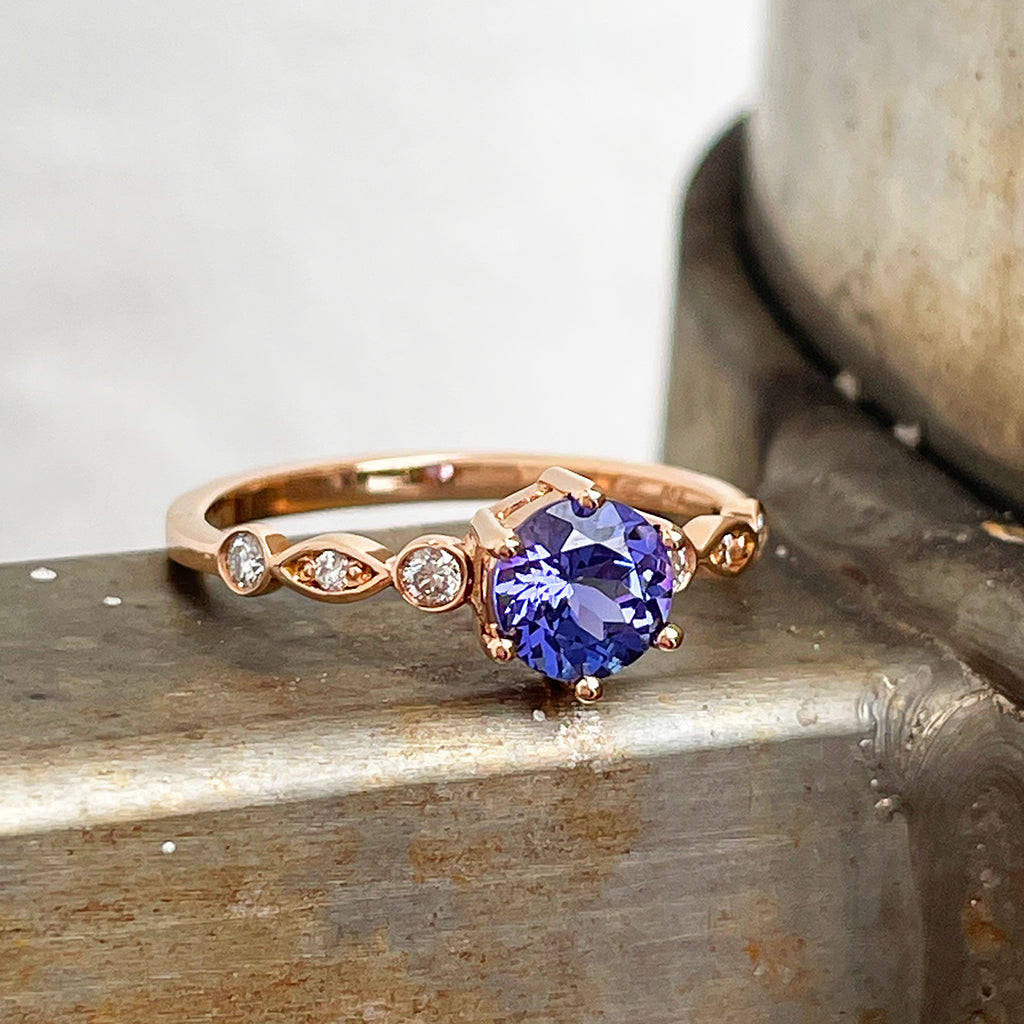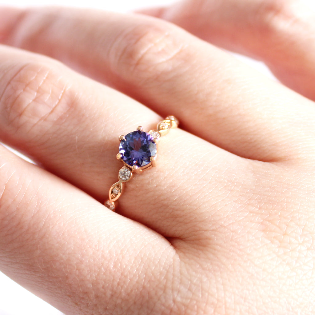 Ethereal Diamond Crimped Band Round Cut Tanzanite Rose Gold Ring