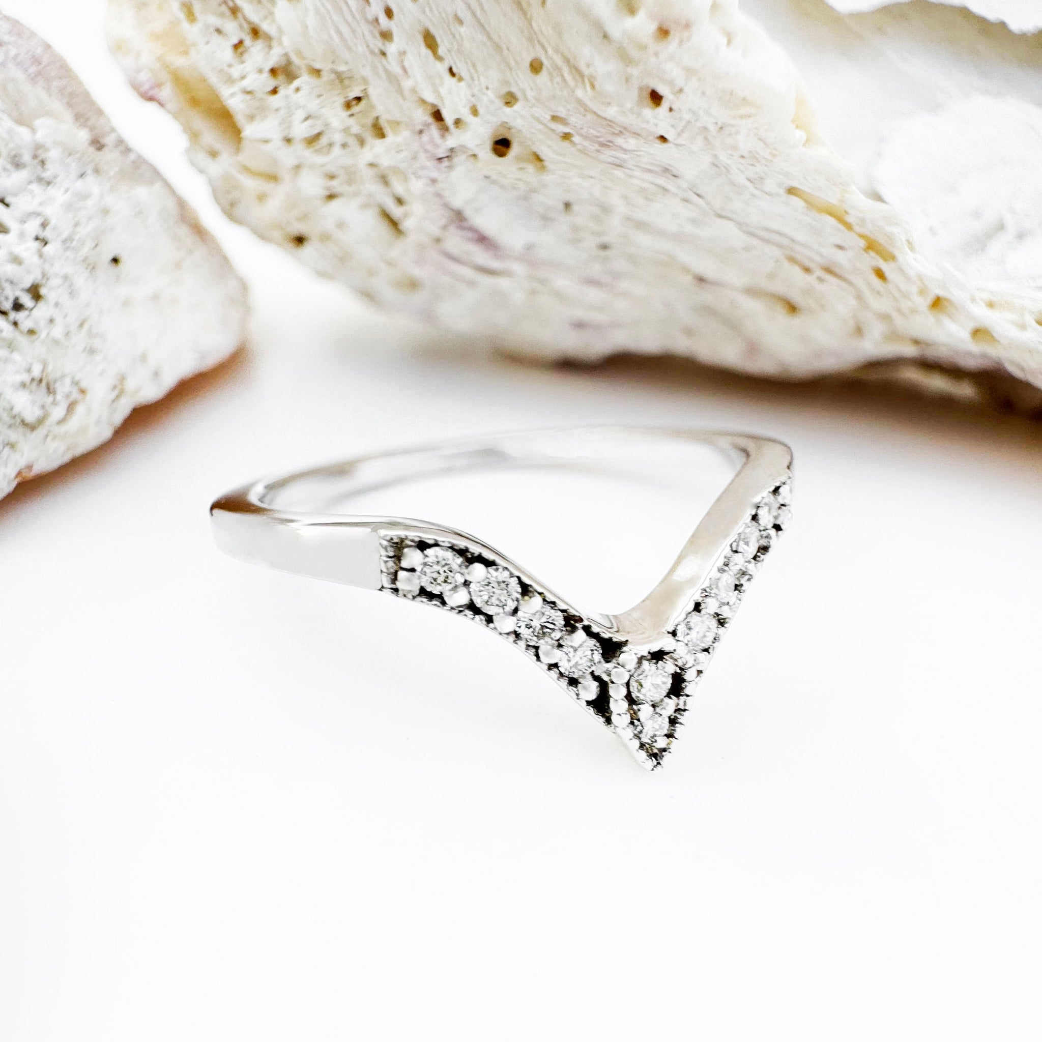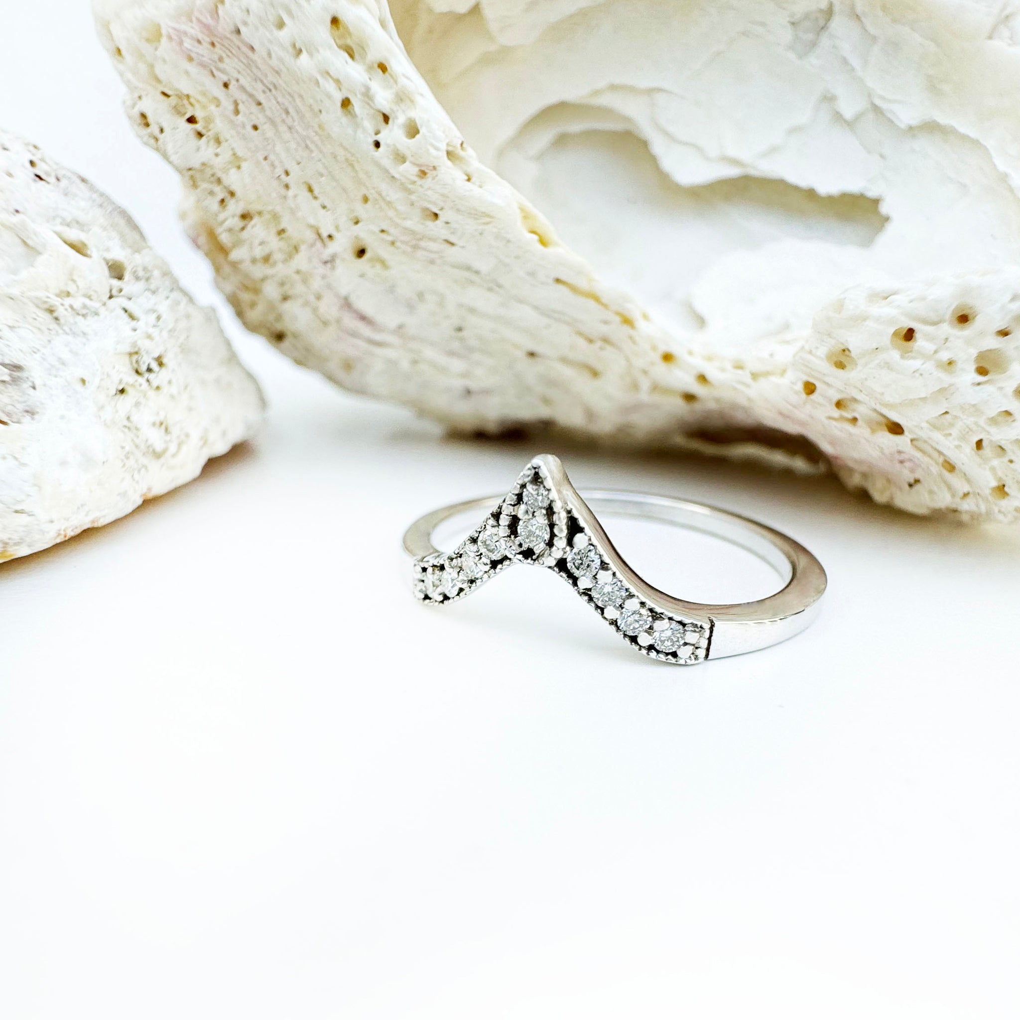 Elegant yet idiosyncratic, this beautiful seven diamond crown ring fits beautifully around any solitaire, perfect for stacking.