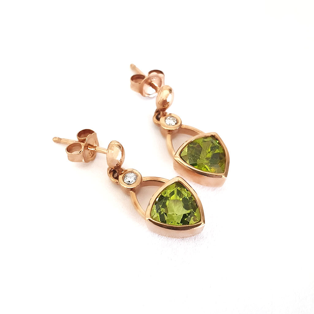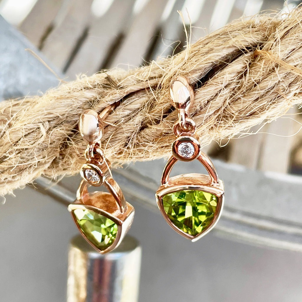 The lush clarity of peridot, emphasised with flair, comes from the expert trilliant cut of the stones. A rose gold bezel plays with light and shadow, creating exquisite dimensions in each viridescent peridot. Bezel set diamonds sit at the apex of an open design, which mirrors the cut of the stones. The elegant artistry of these earrings has all the show-stopping power of a baroque opera without being OTT.