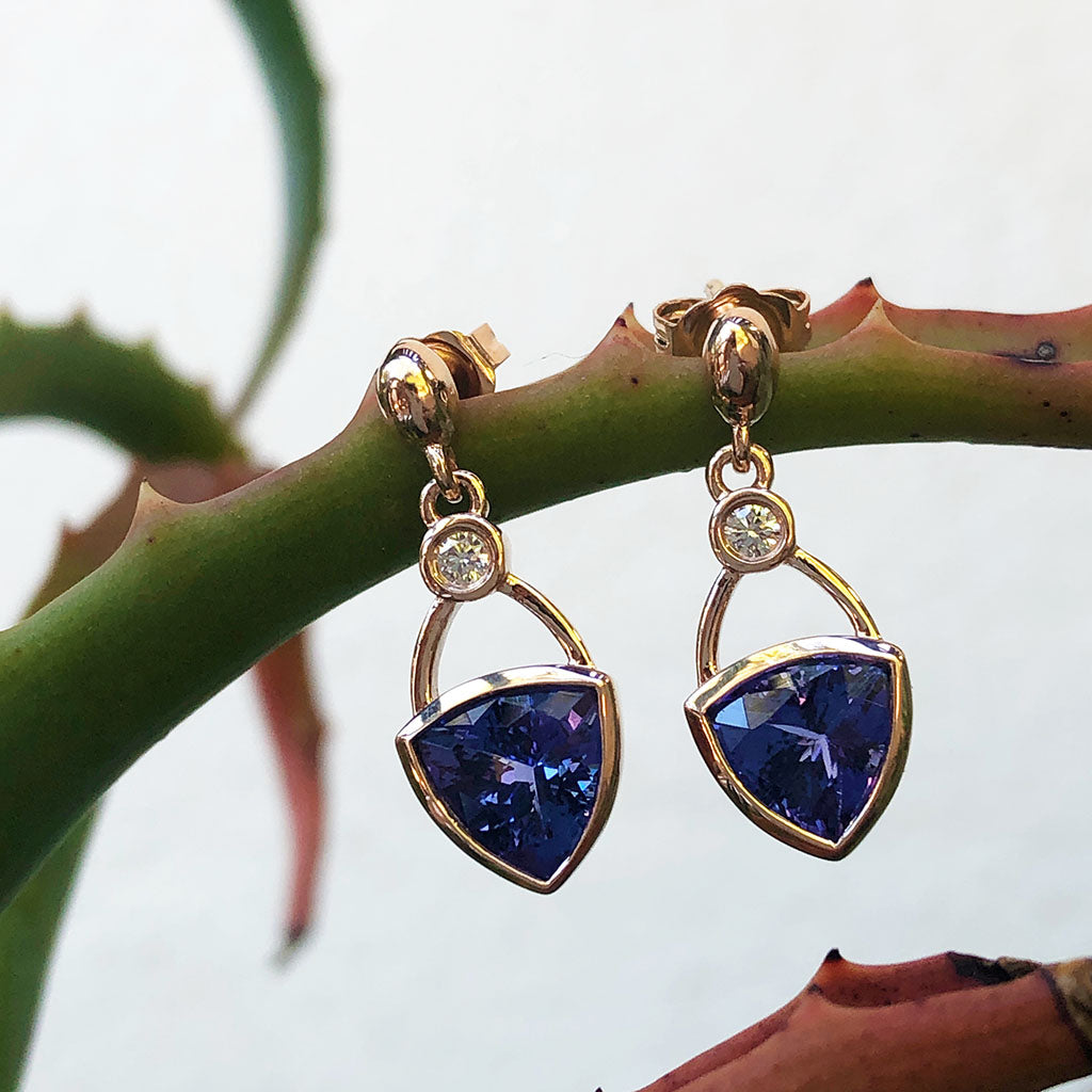 The exquisite clarity of the tanzanites, rarely emphasised with such flair, comes from the expert trilliant cut of the stones. A rose gold bezel plays with light and shadow, creating exquisite dimensions in each blue-violet tanzanite. Bezel set diamonds sit at the apex of an open design, which mirrors the cut of the stones. The elegant artistry of these earrings has all the show-stopping power of a baroque opera without being OTT.