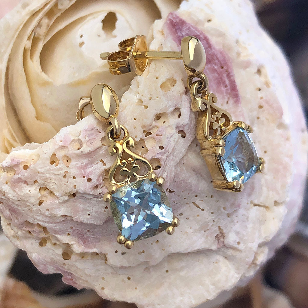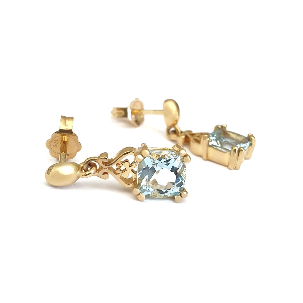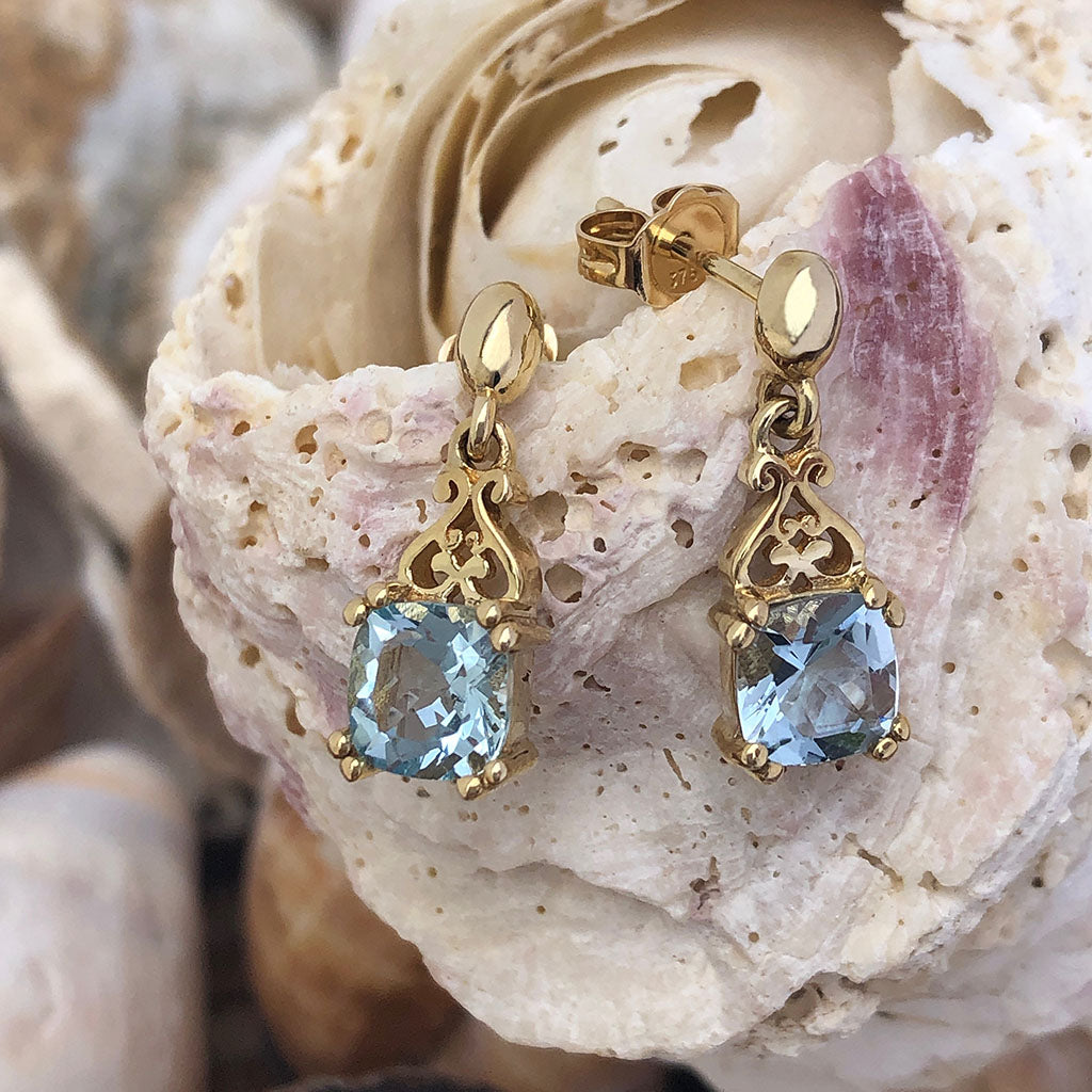 Filigree Bale Aquamarine Yellow Gold Drop Earrings