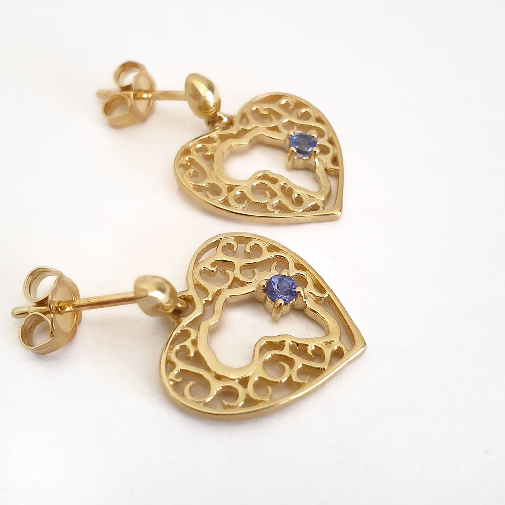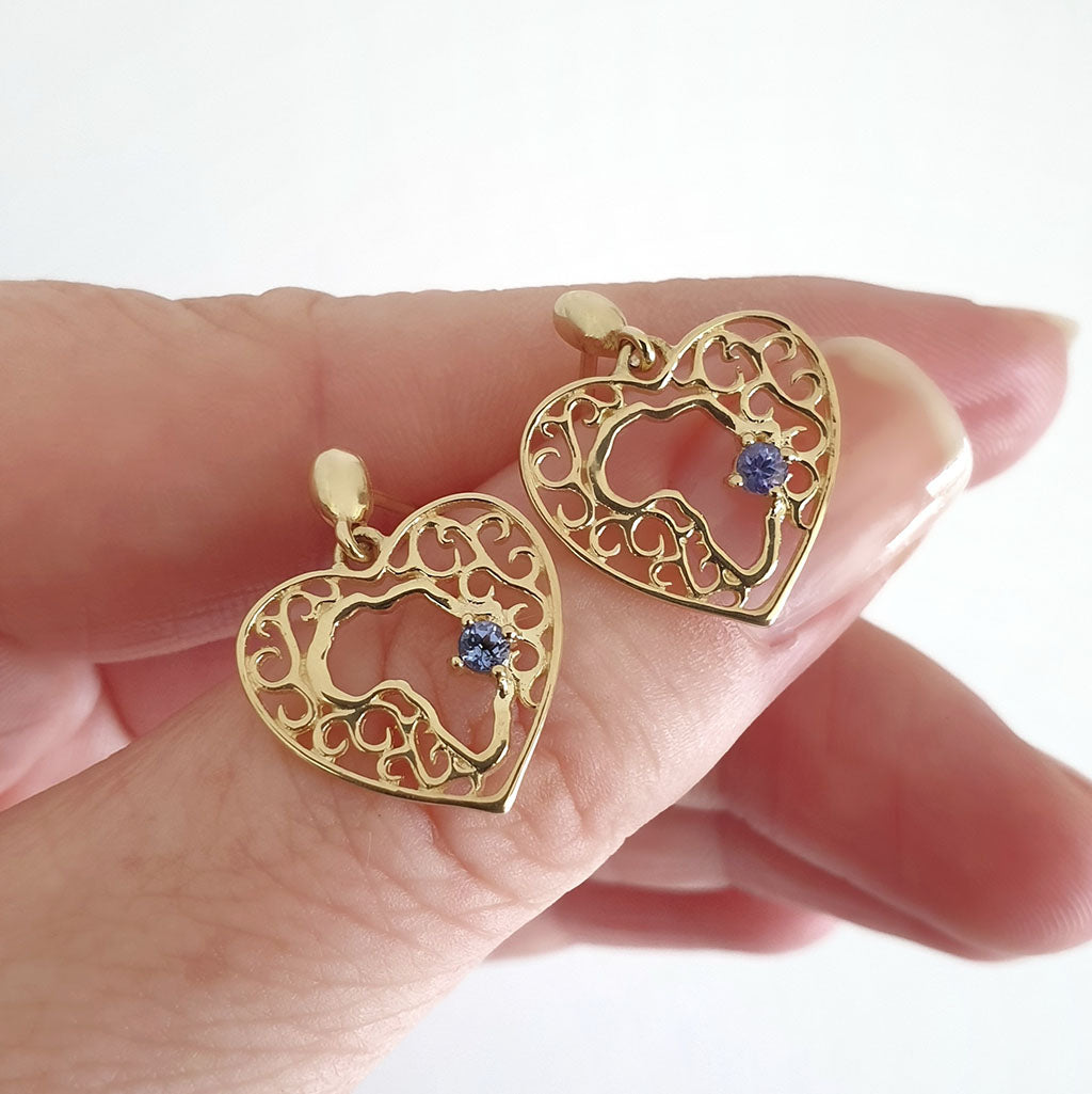 Intricate filigree brings an aura of romance to these unusual "I love Africa" earrings. A map of Africa is created by the negative space at the centre of the filigree detailing.  Africa's rarest gemstone, tanzanite, adds a pop of intense blue against the gold. A  heart border holds the elements, and expresses your love of our continent.
