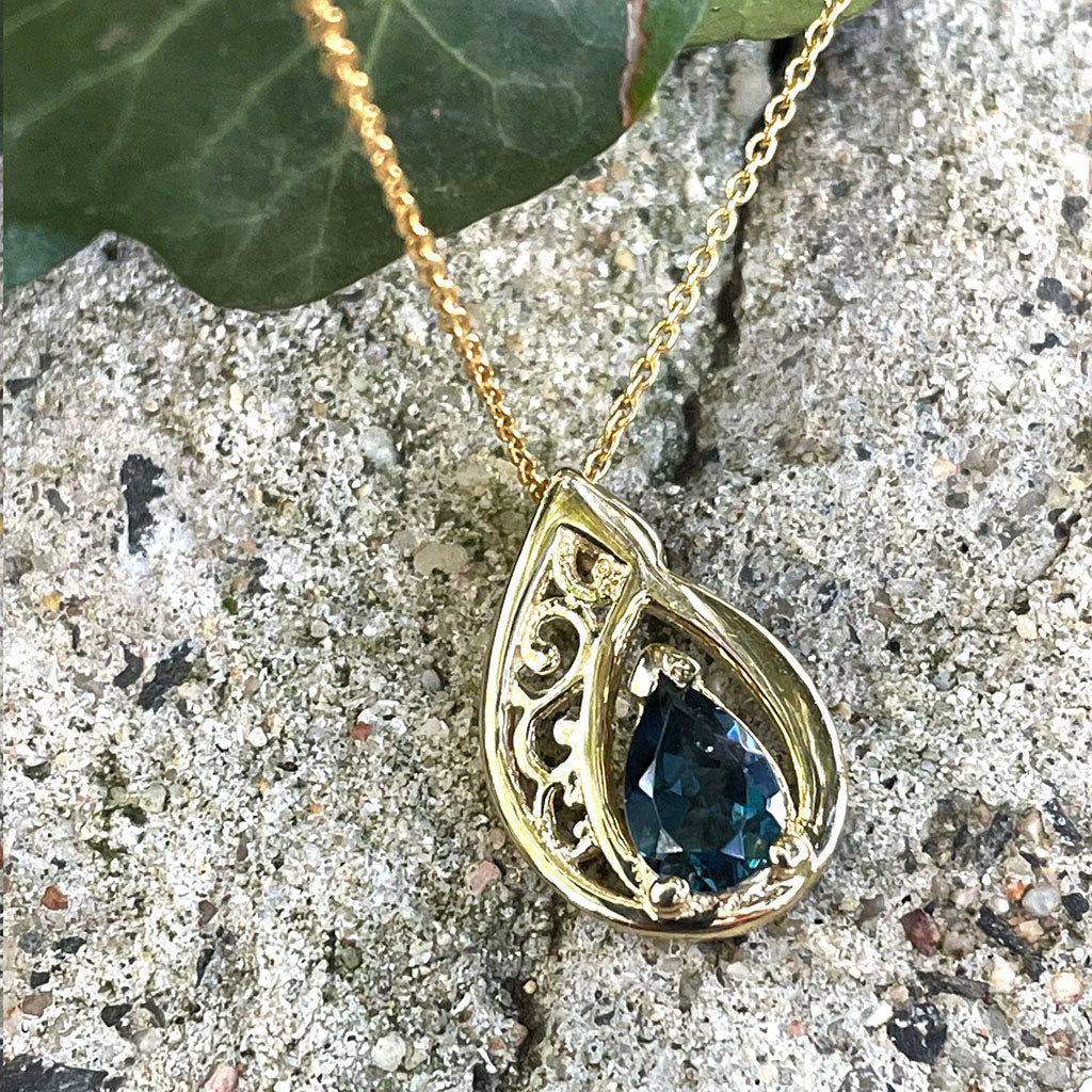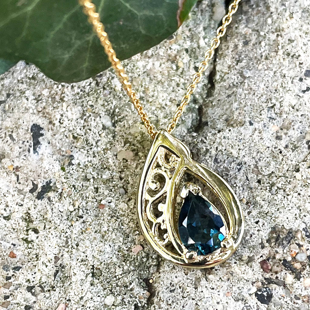 Filigree Yellow Gold London Blue Topaz Droplet Pendant