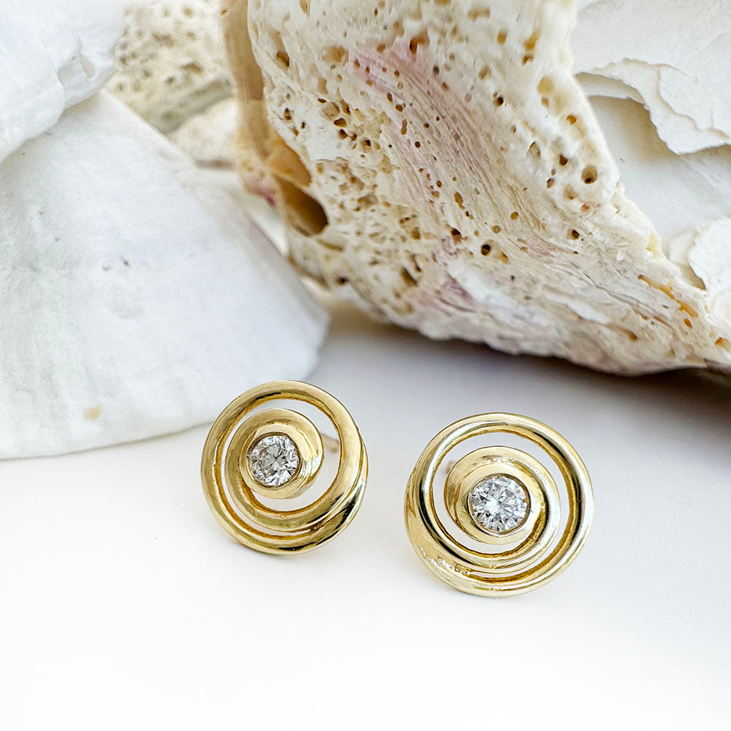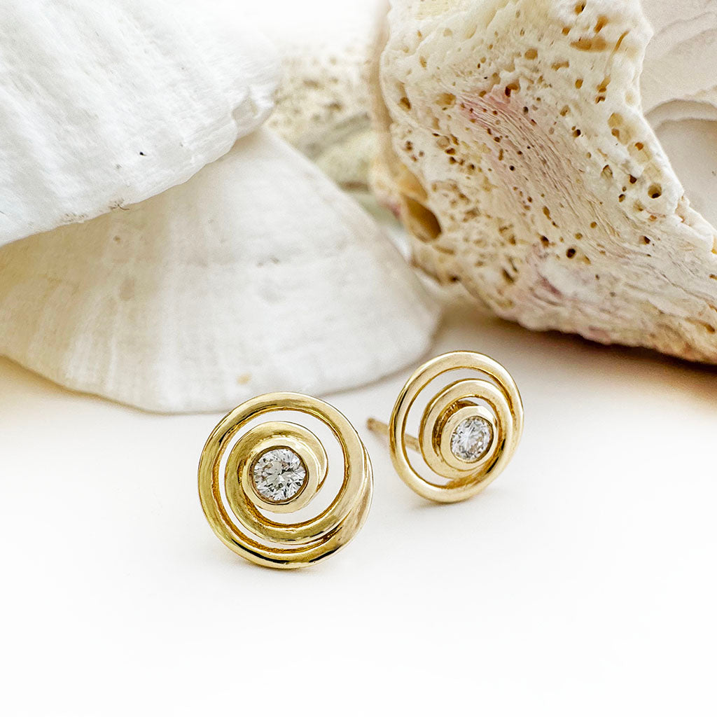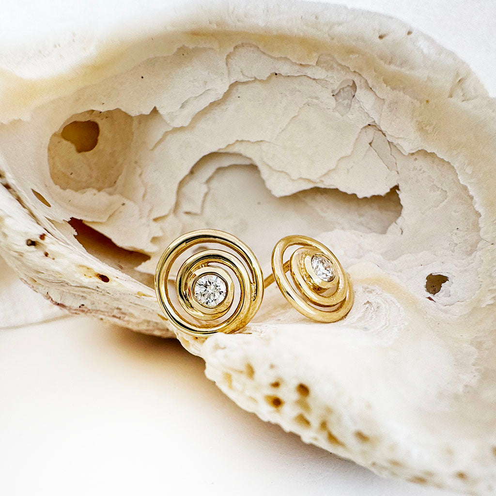 Fun and flirty and a nod to forever love, swirling yellow gold surrounds brilliant round diamonds in these luxurious studs. The swirl creates an infinite loop that symbolises the undying nature of true love around white diamonds that flash brilliance in the light; a playful wink that reminds us that the best kind of lover should make us laugh.