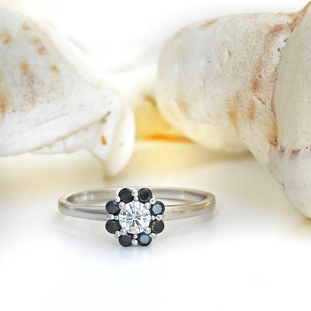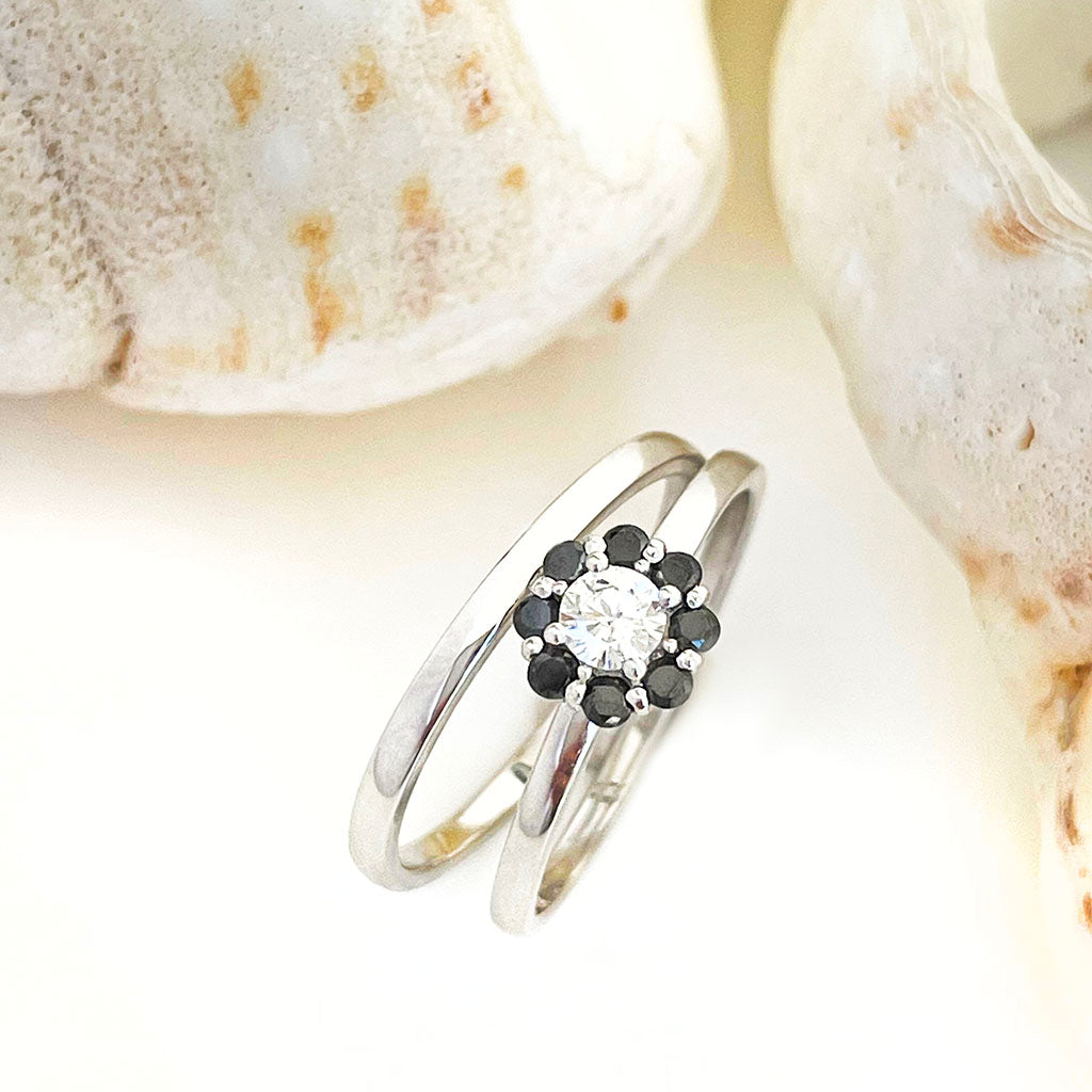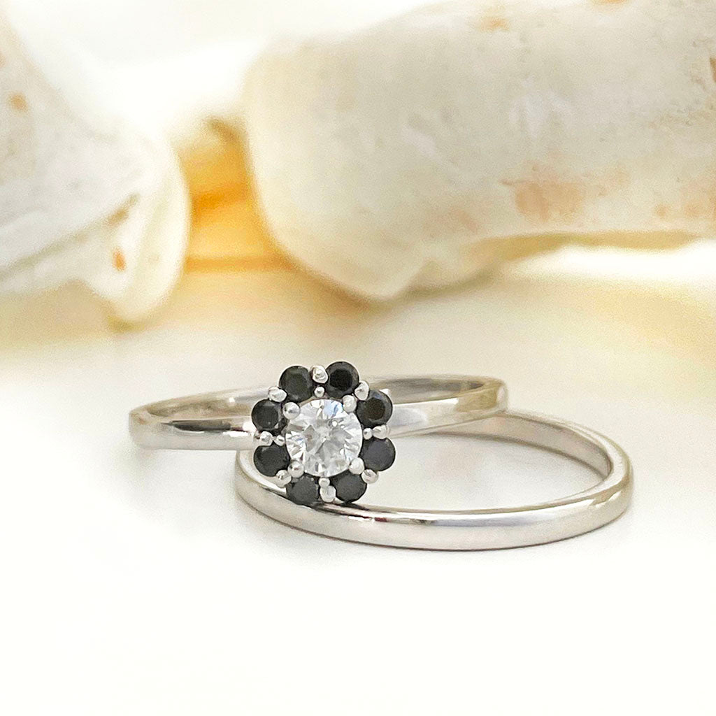 Floral Inspired Black Diamond With White Diamond Halo Wedding Set