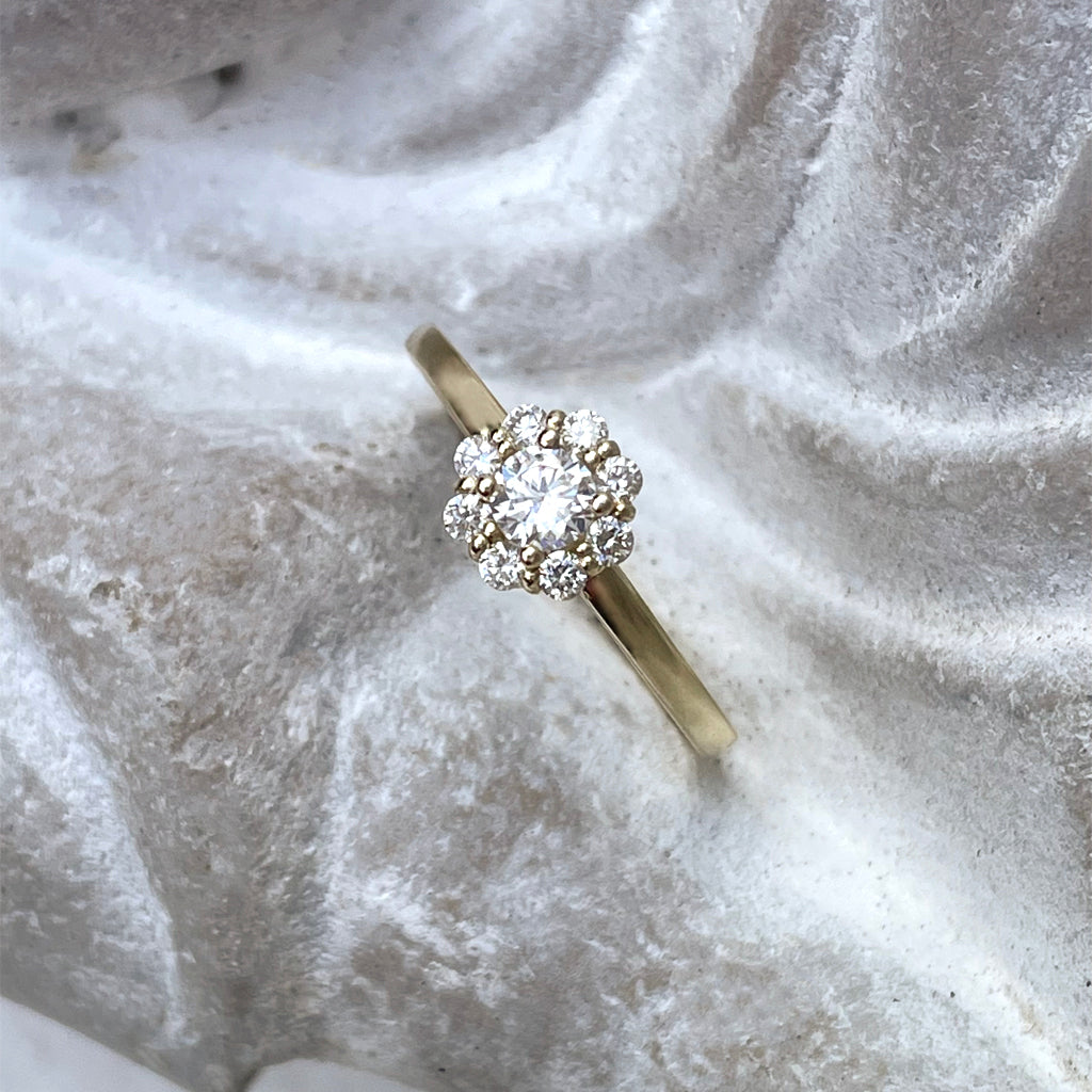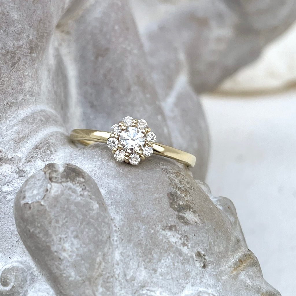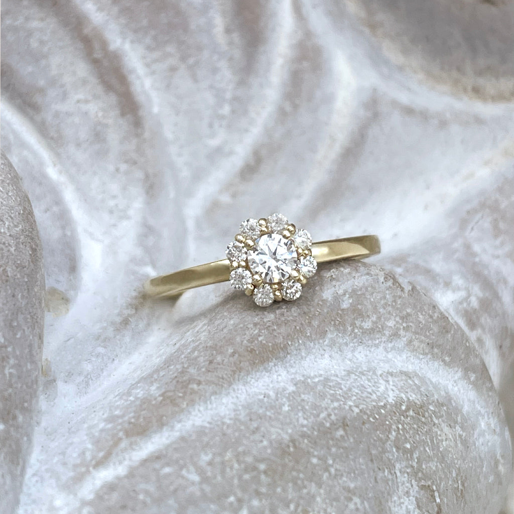 A glittering diamond flower, featuring a larger central diamond surrounded by a diamond halo on a yellow gold mount, make this ring transcendently beautiful.  It would make an exquisite engagement ring for your nature goddess, or a charming ring for a blossoming daughter.