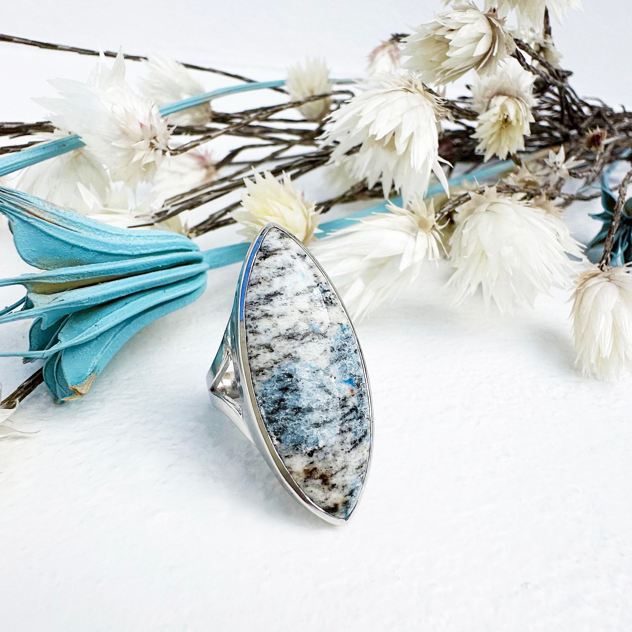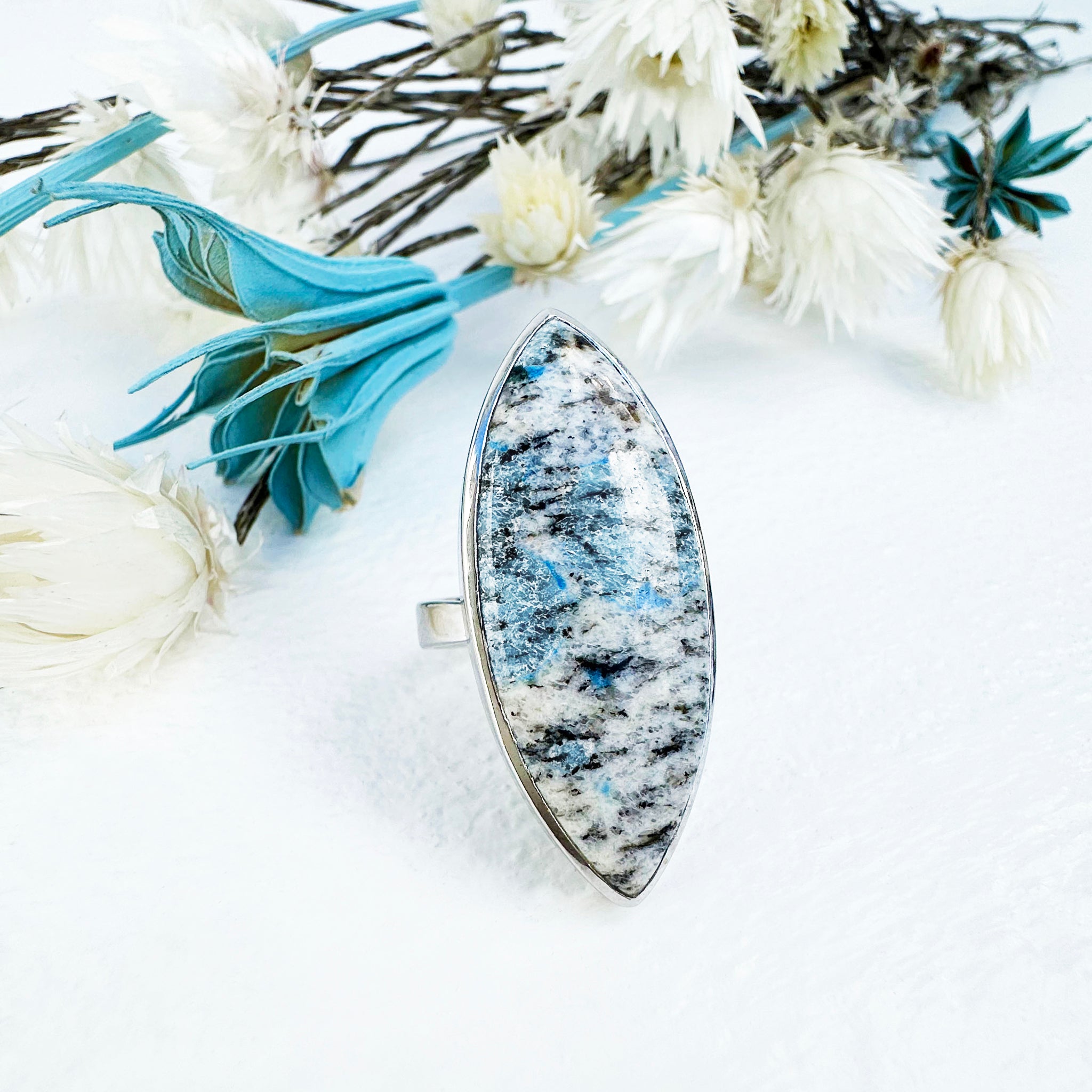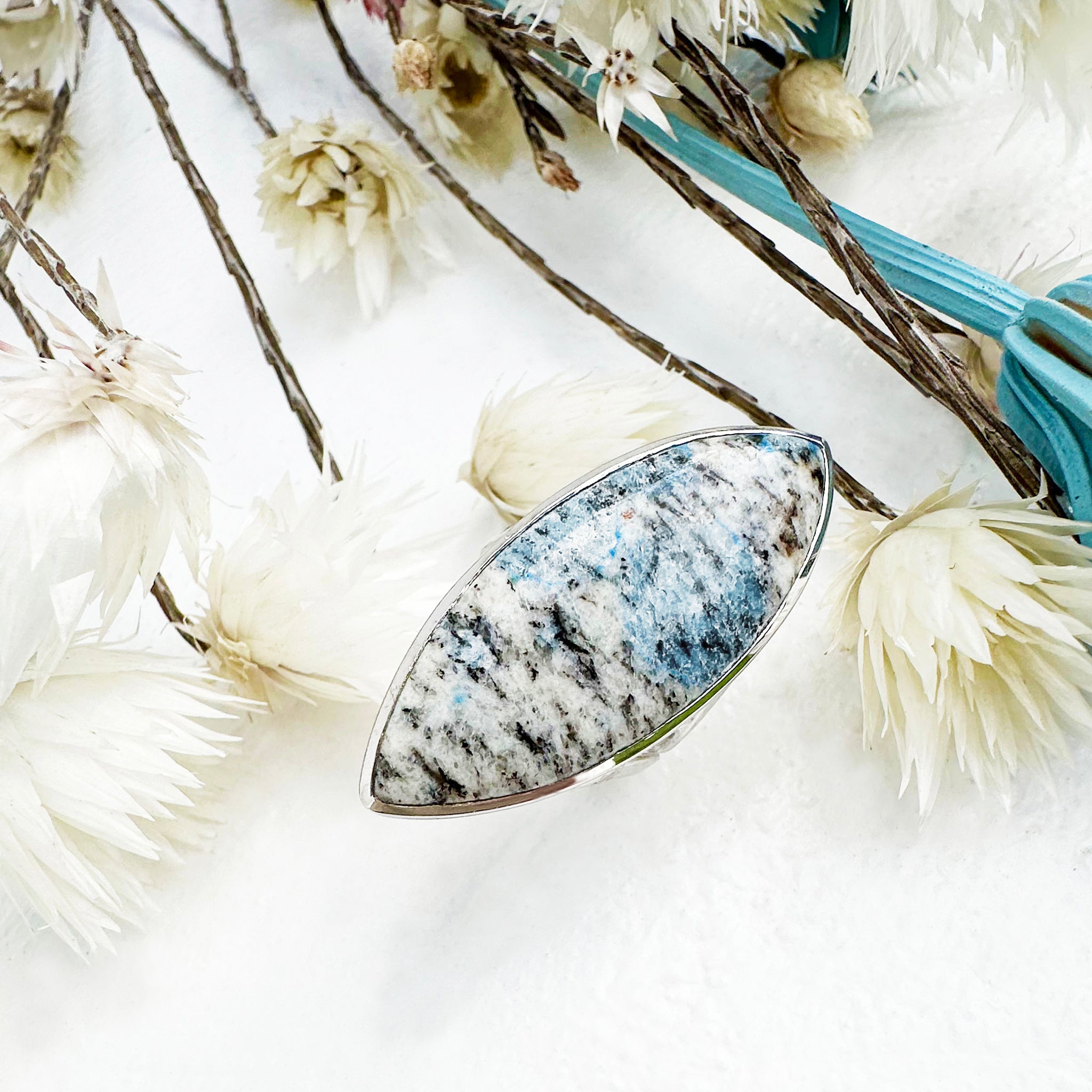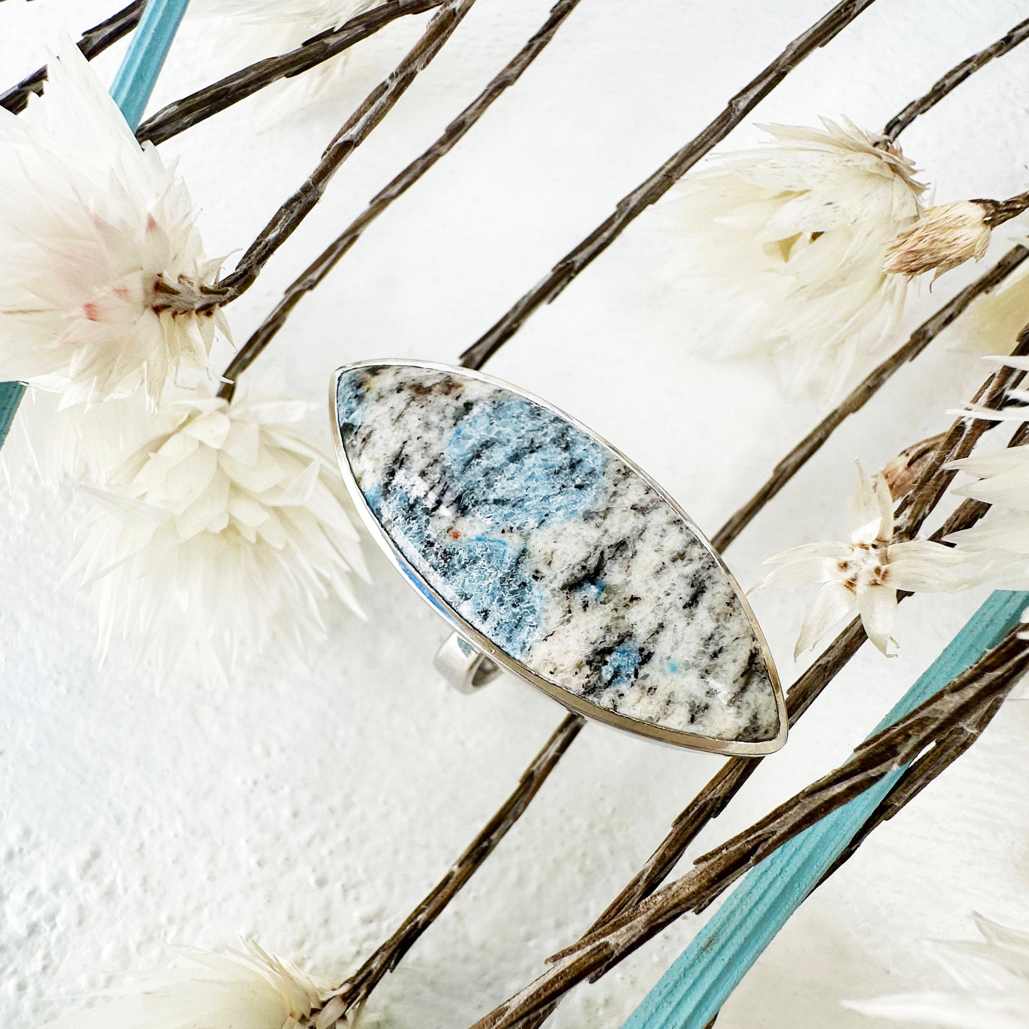 Freeform Natural Elongated Oval K2 Granite with Azurite Silver Ring