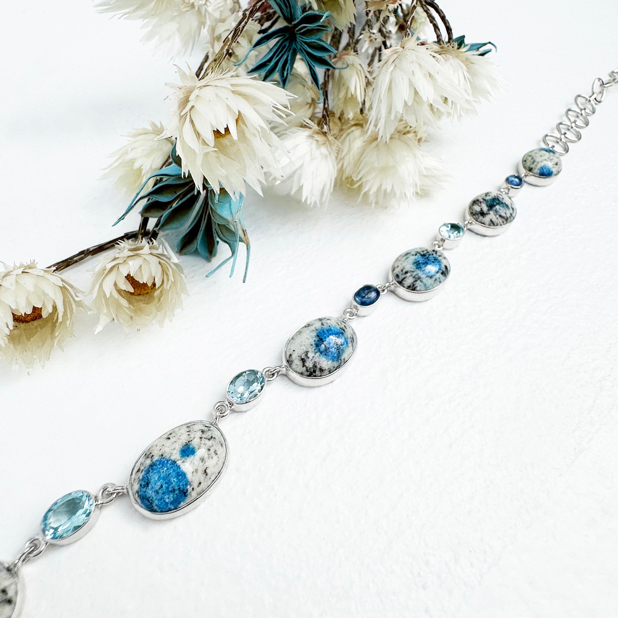 Freeform Natural Large Pear K2 Granite with Azurite and Topaz Silver Necklace