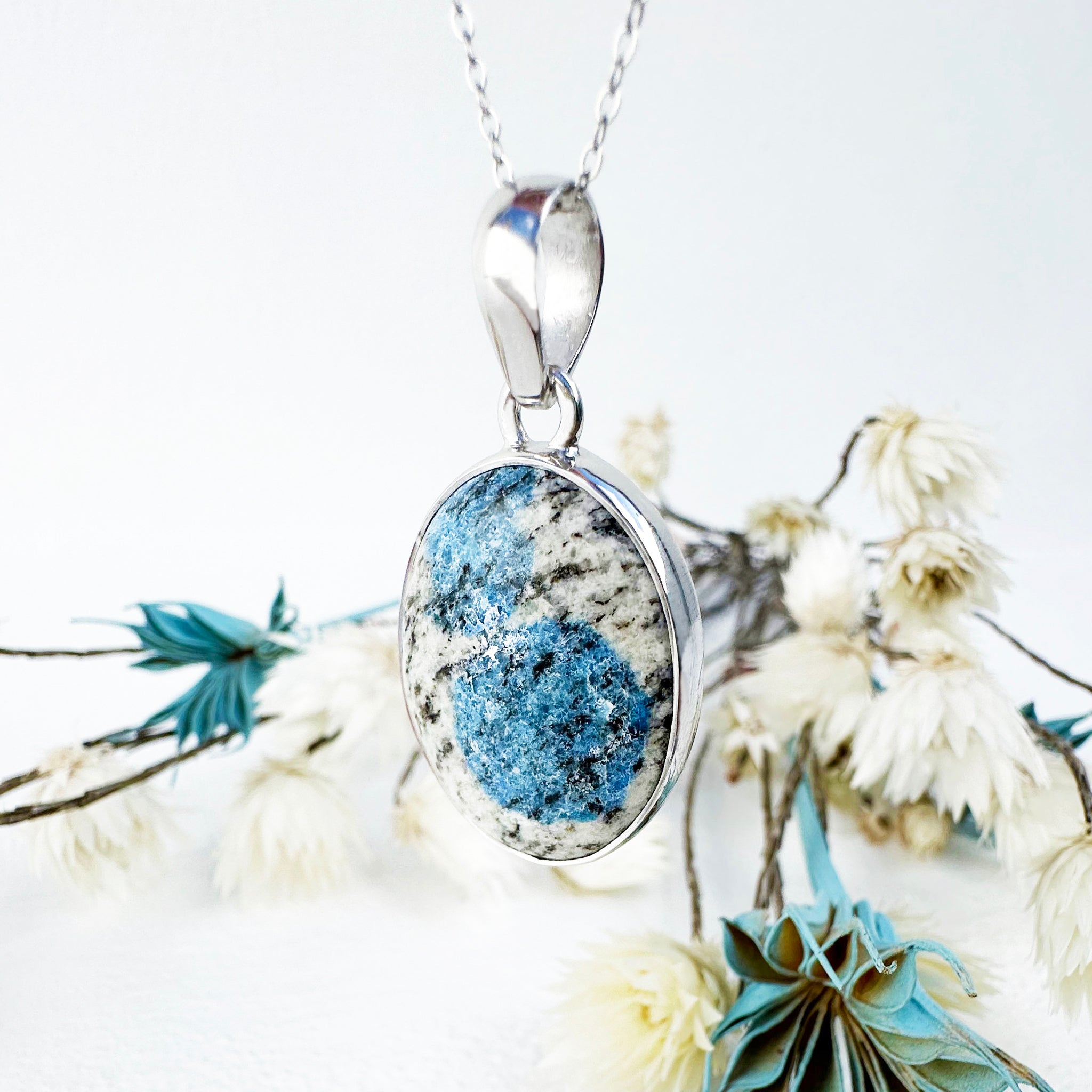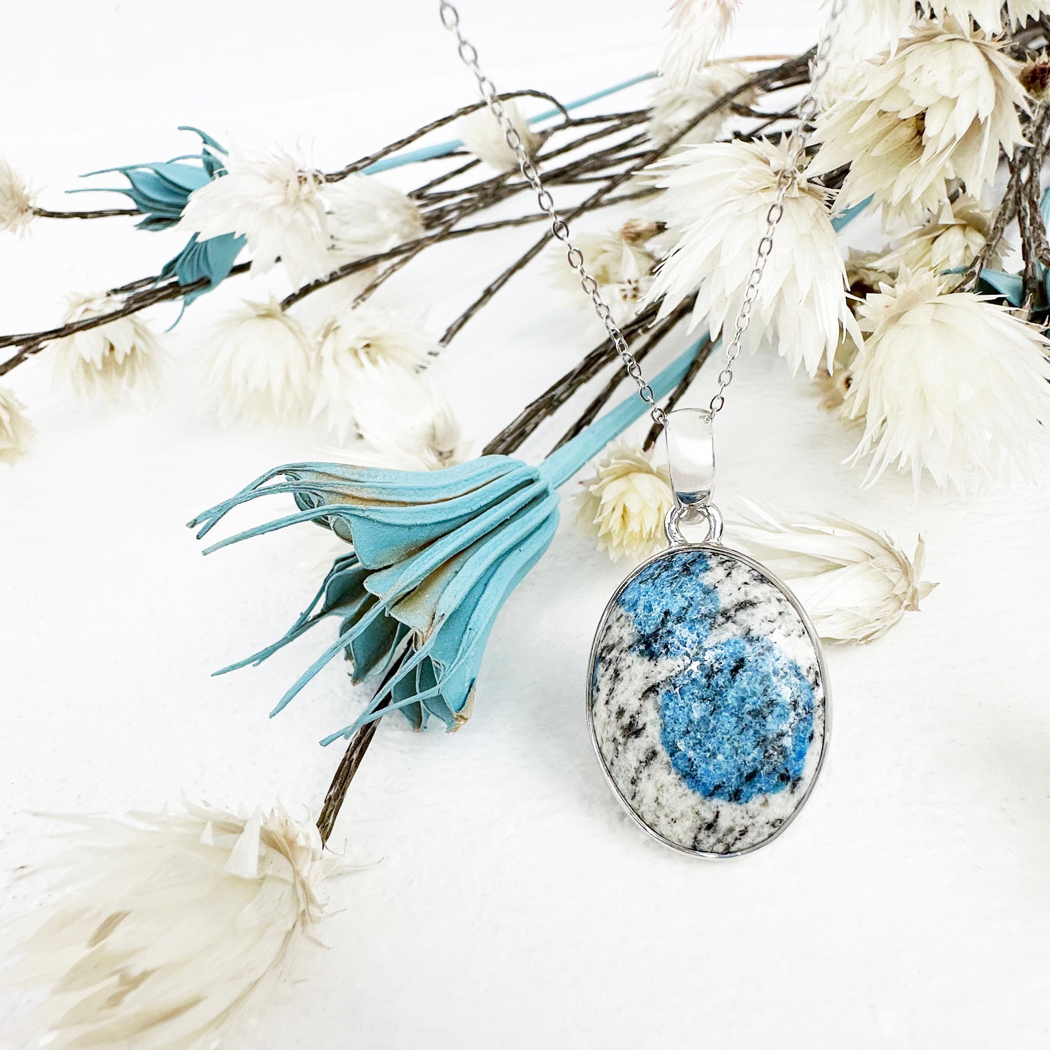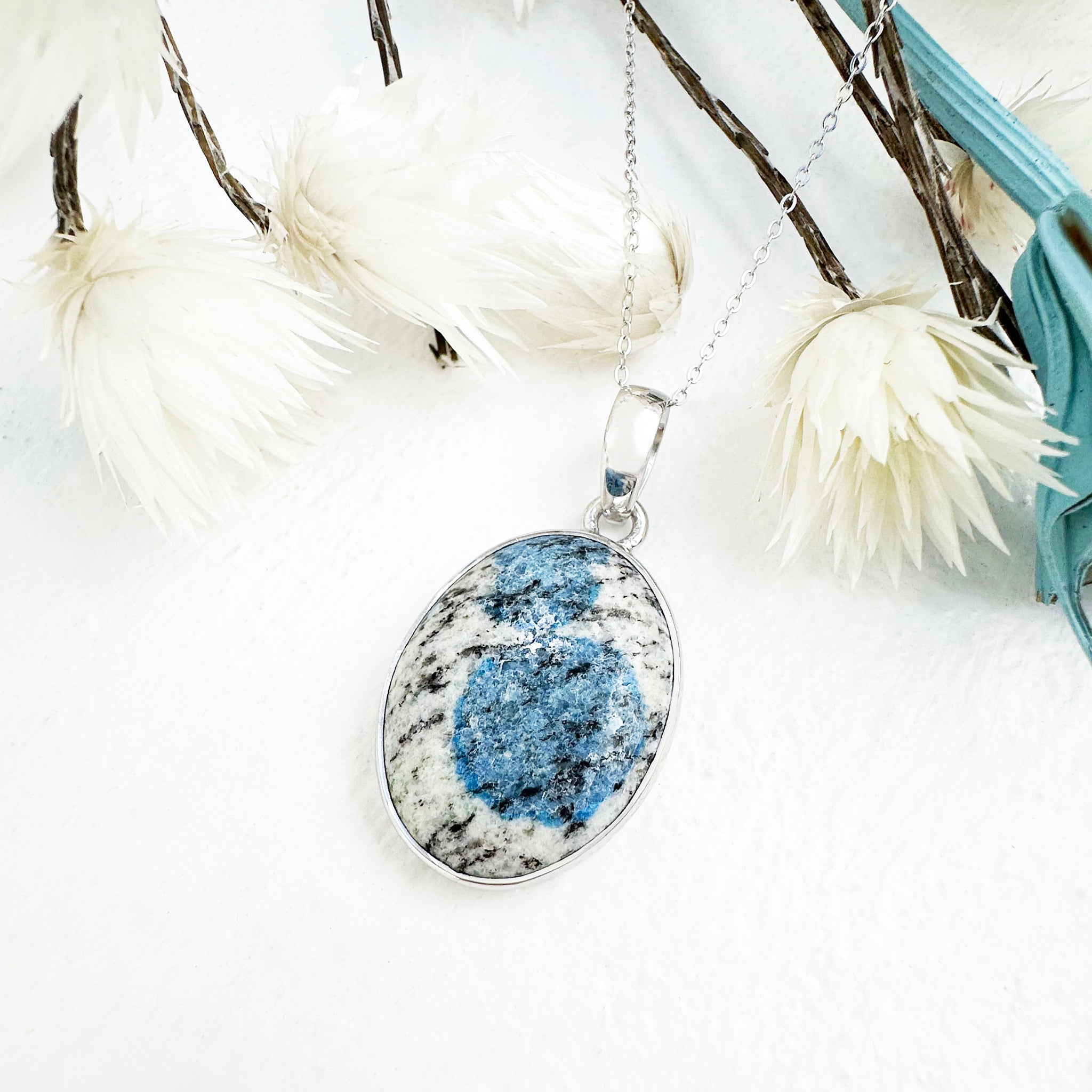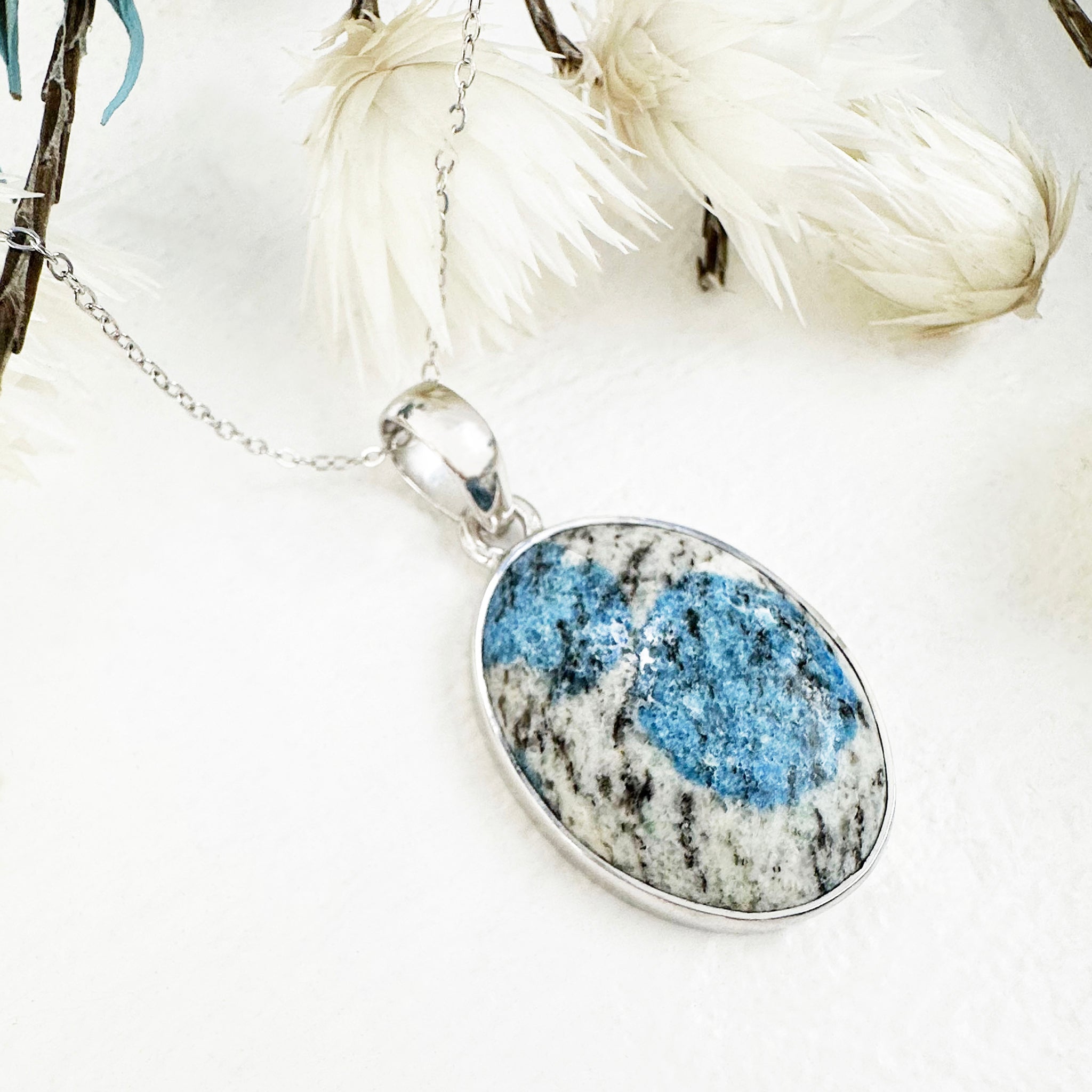 Freeform Natural Oval K2 Granite with Azurite Silver Pendant