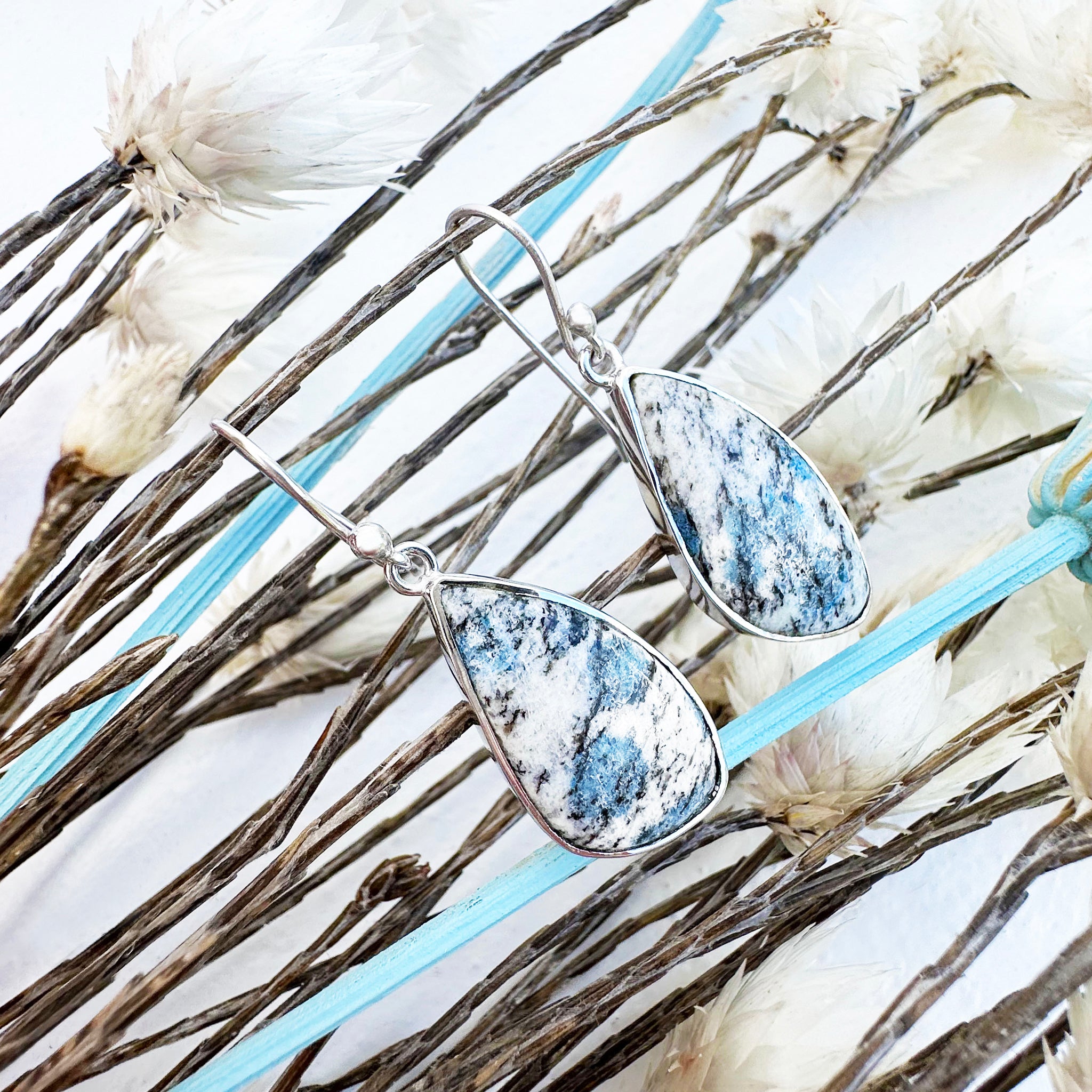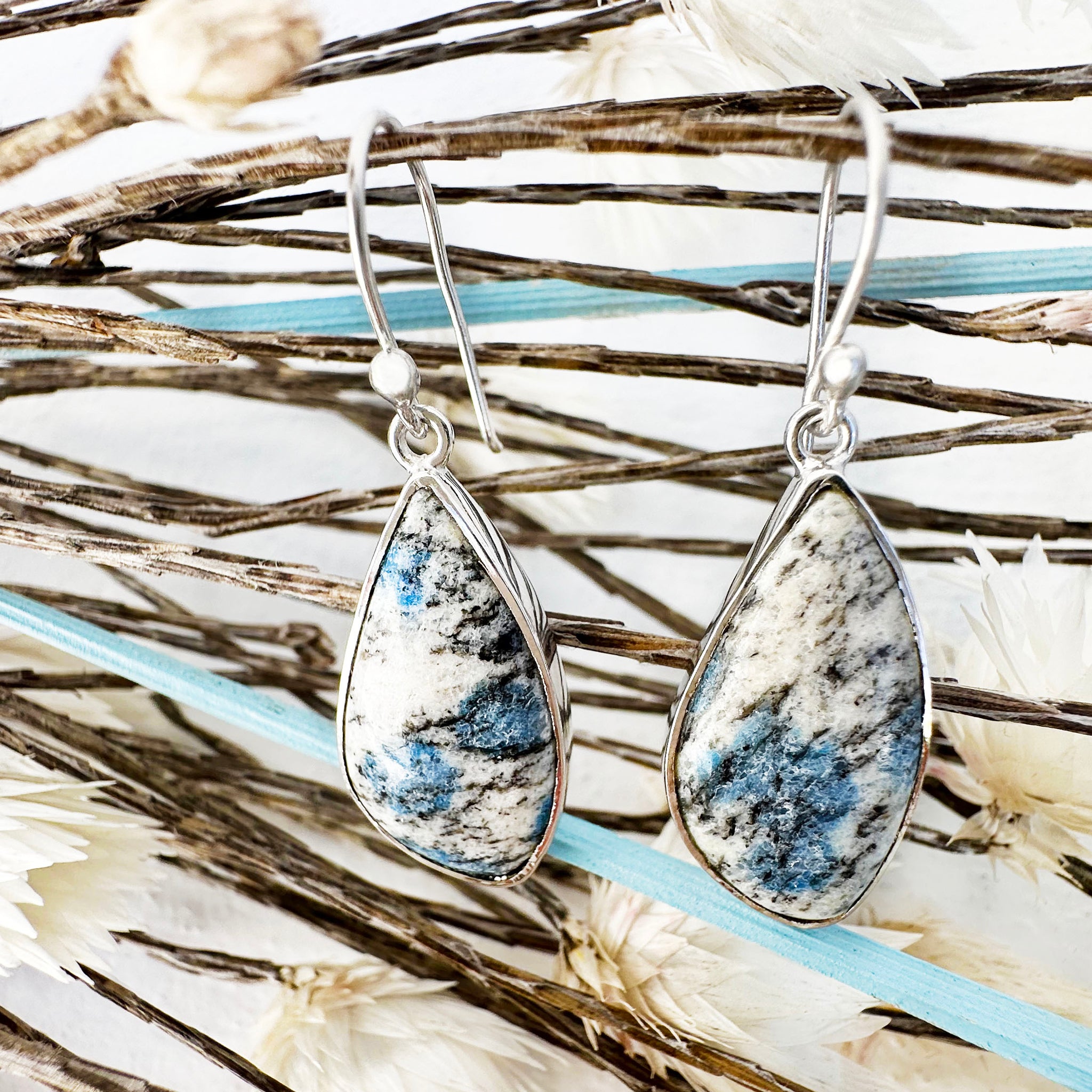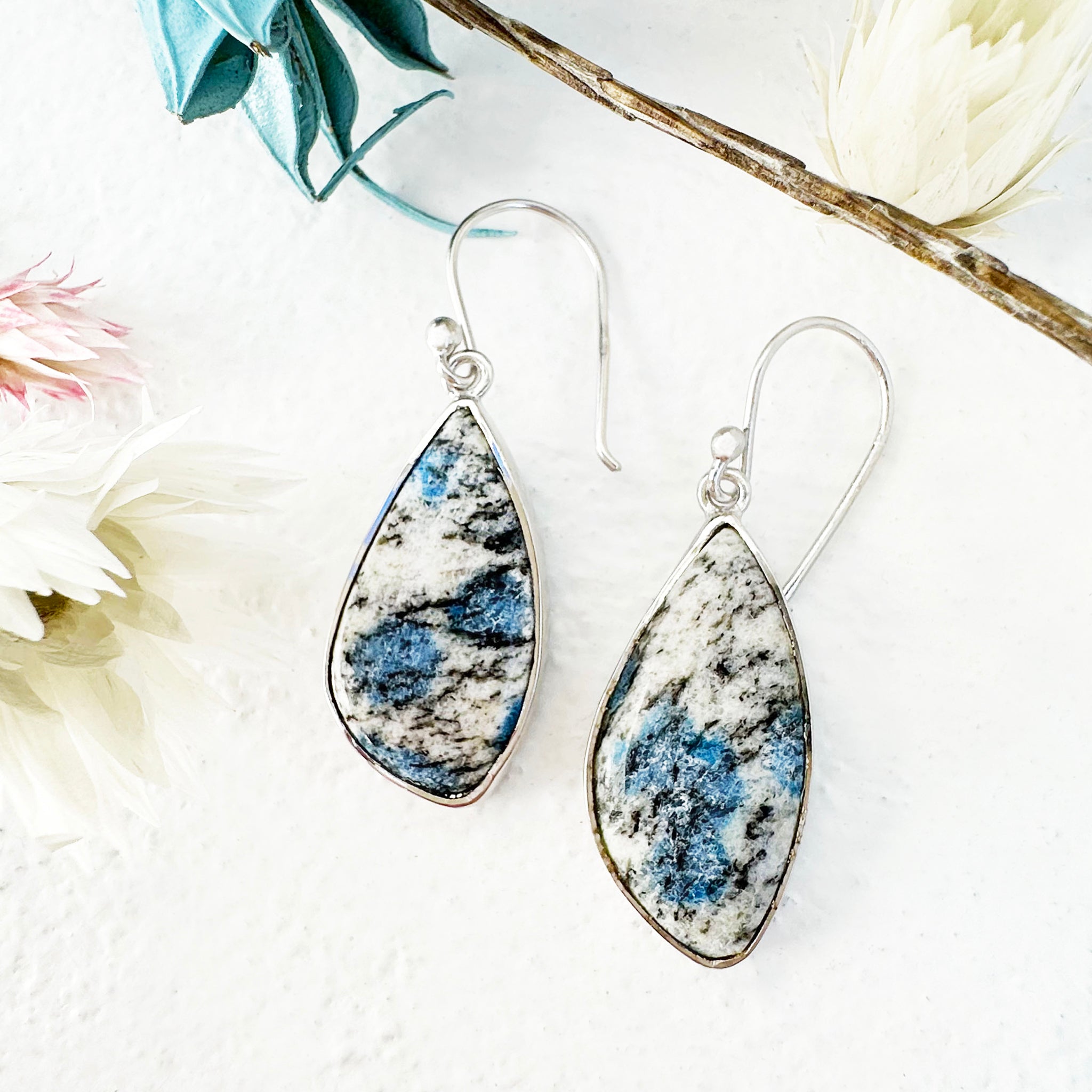 Freeform Natural Triangular K2 Granite with Azurite Silver Drop Earrings No.2