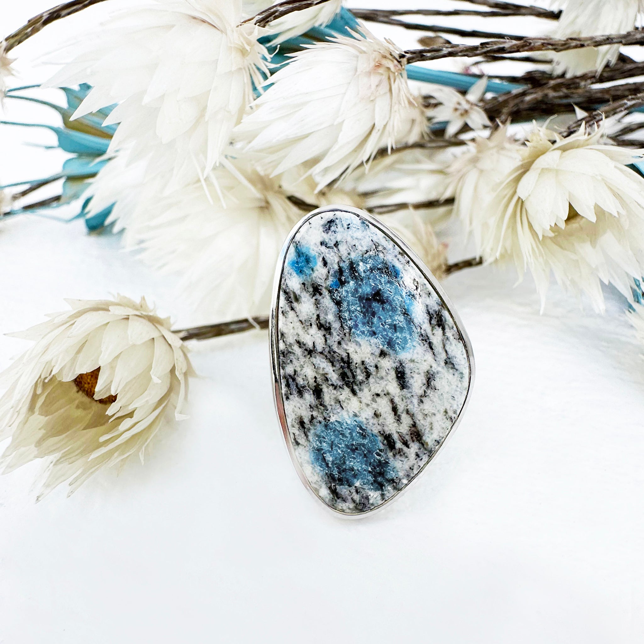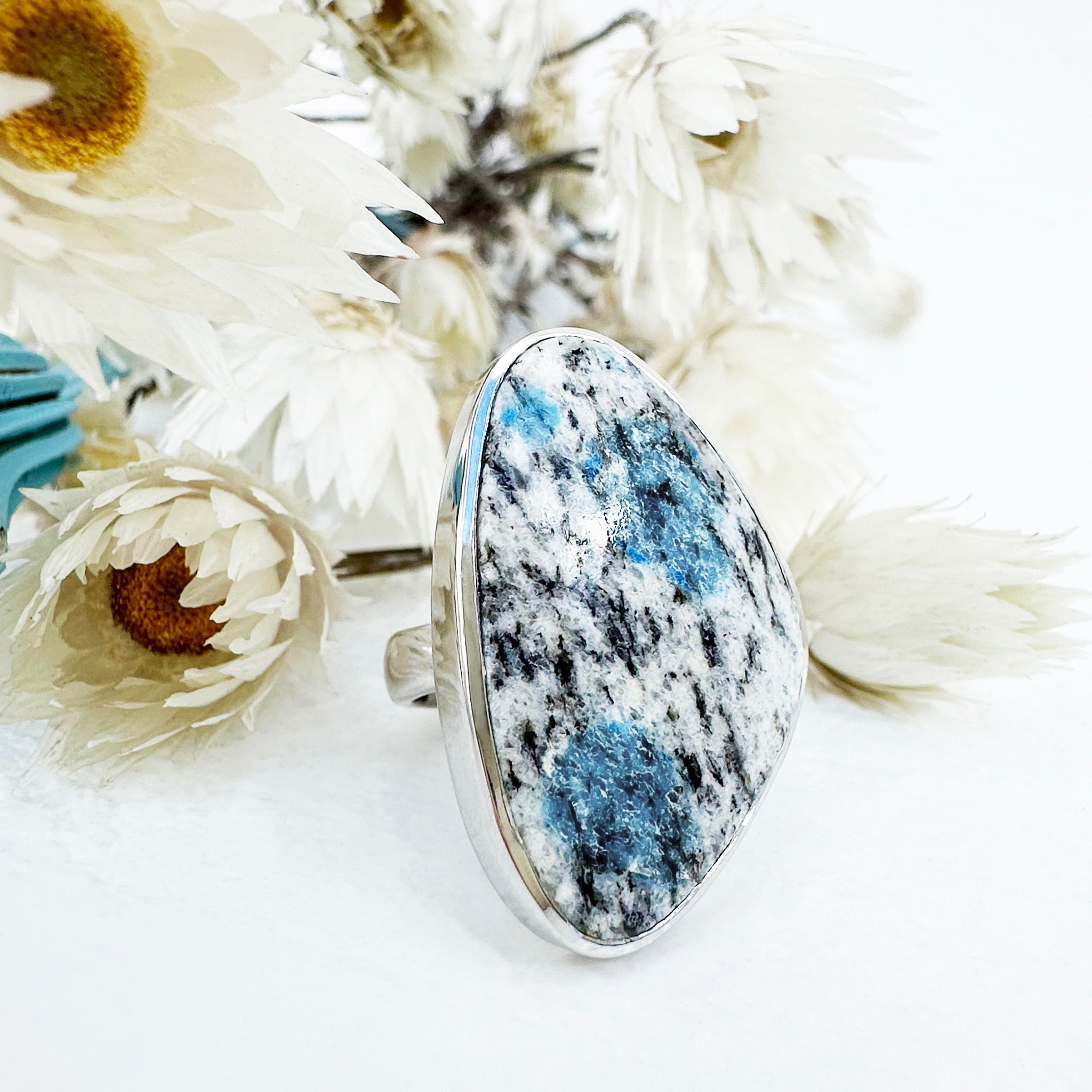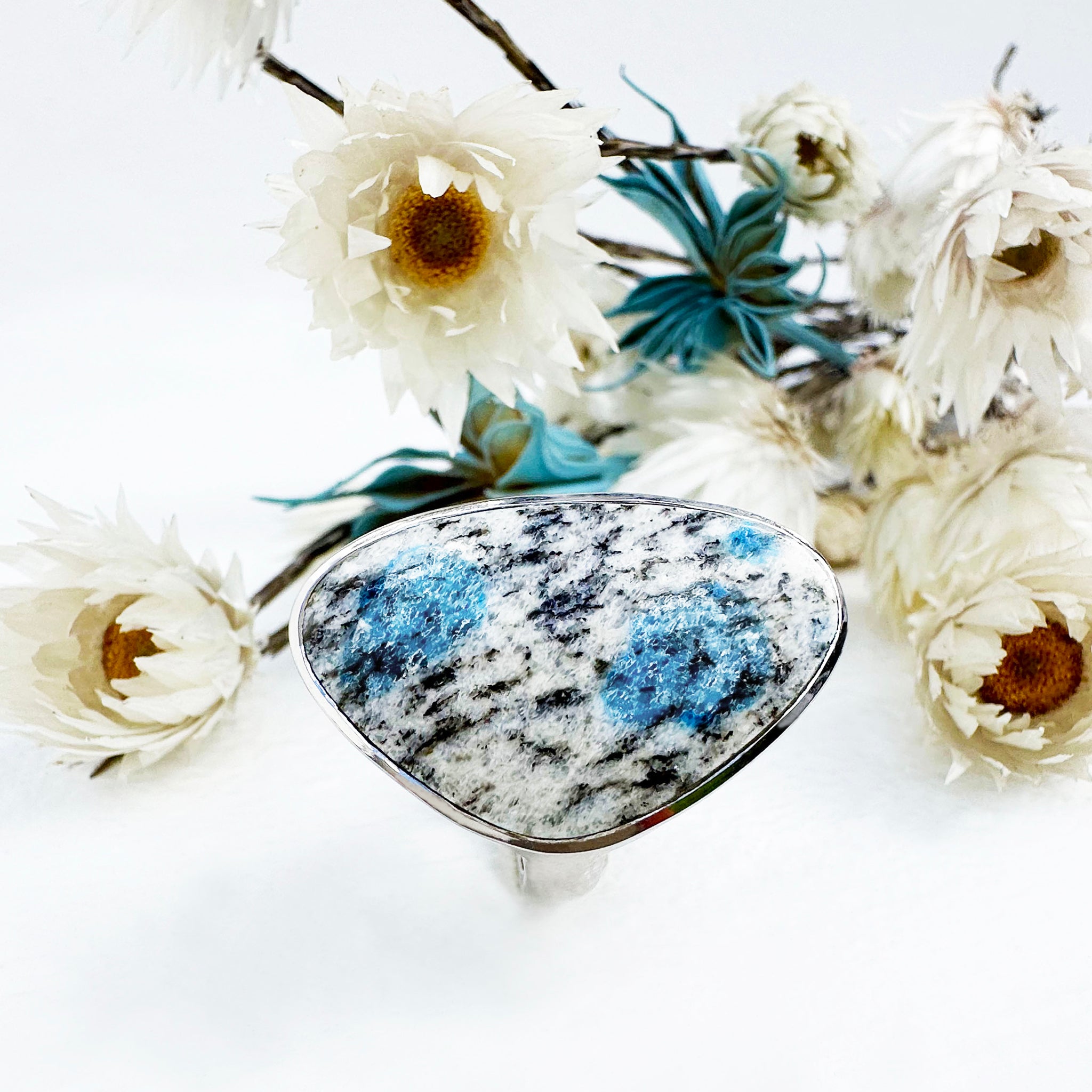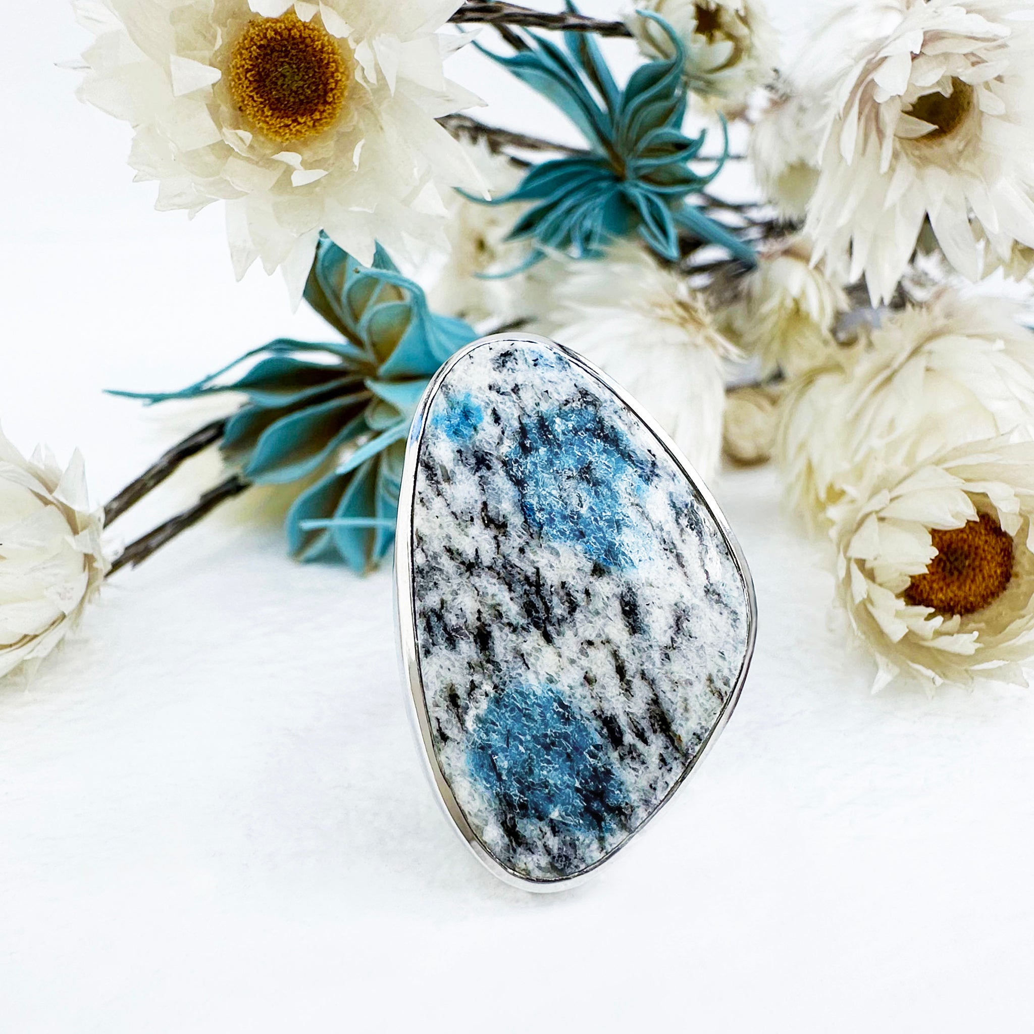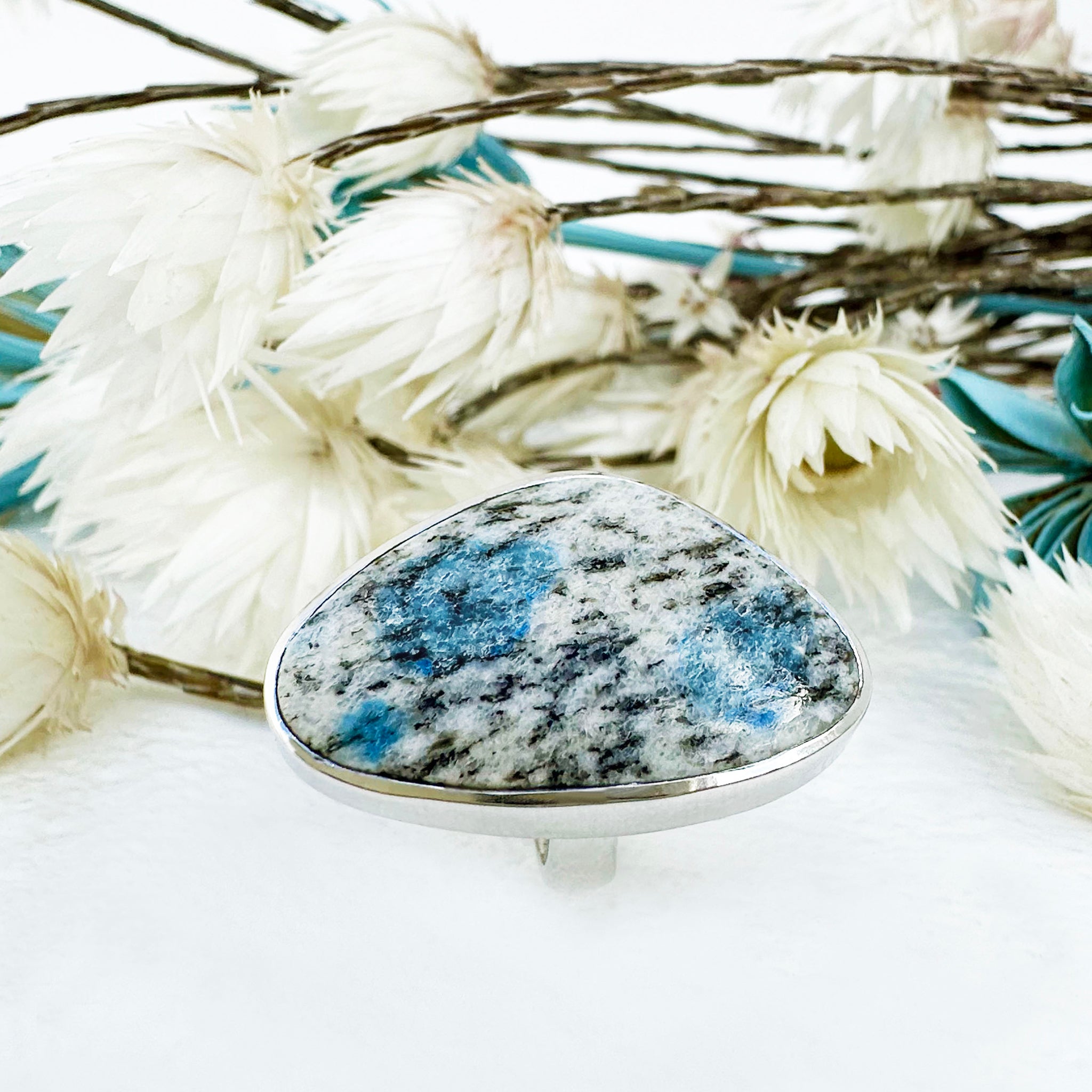 Freeform Natural Triangular K2 Granite with Azurite Silver Ring