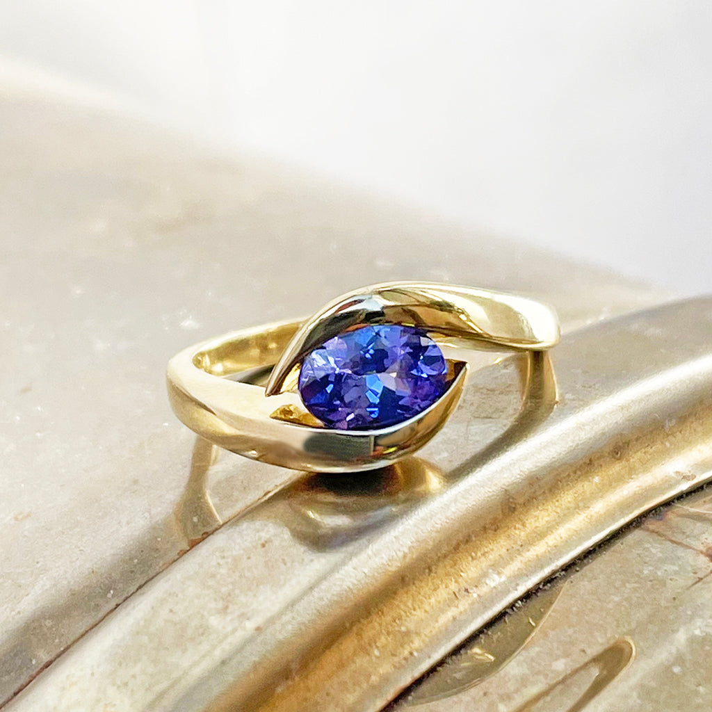 Gently Embraced Oval Tanzanite Yellow Gold Ring