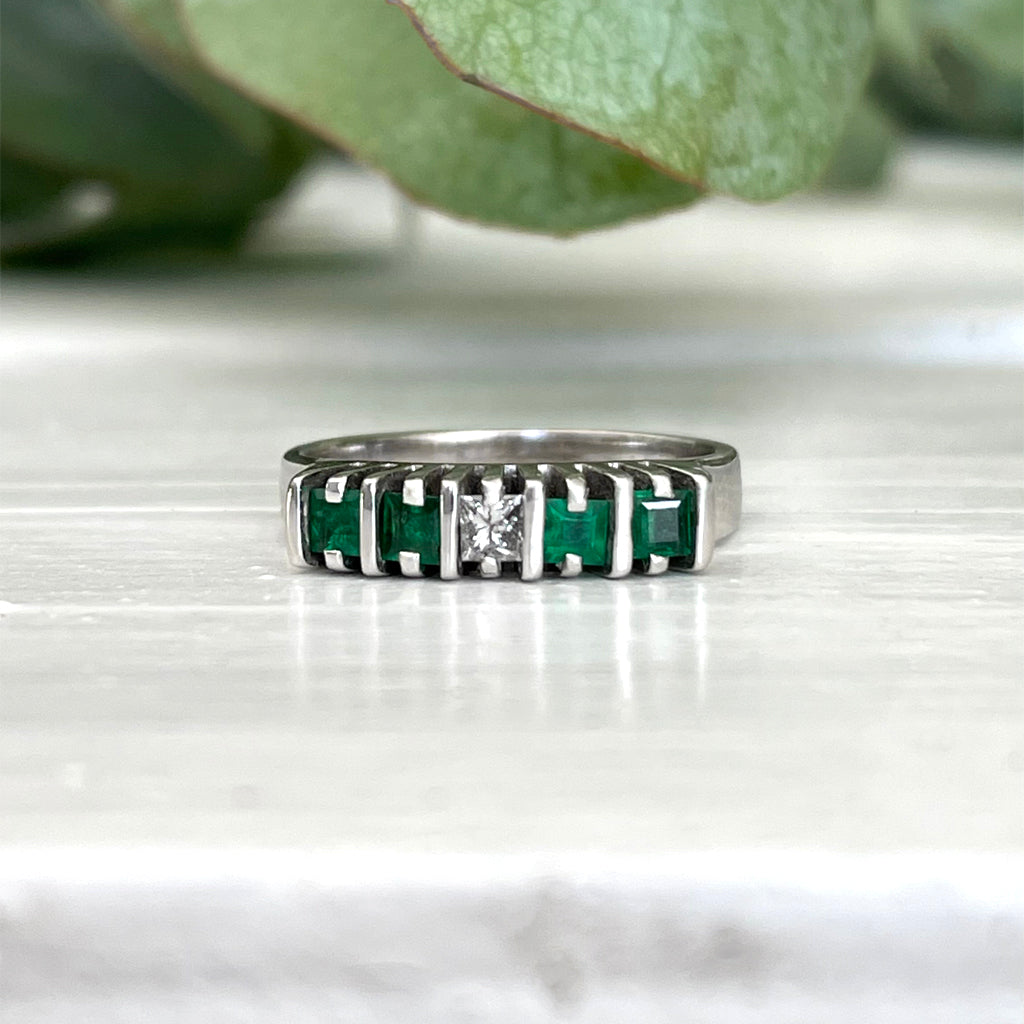 Geometric White Gold Bar Four Emerald, White Diamond Ring