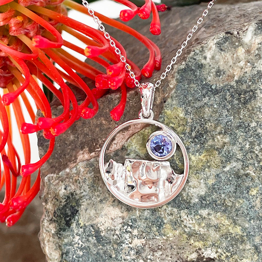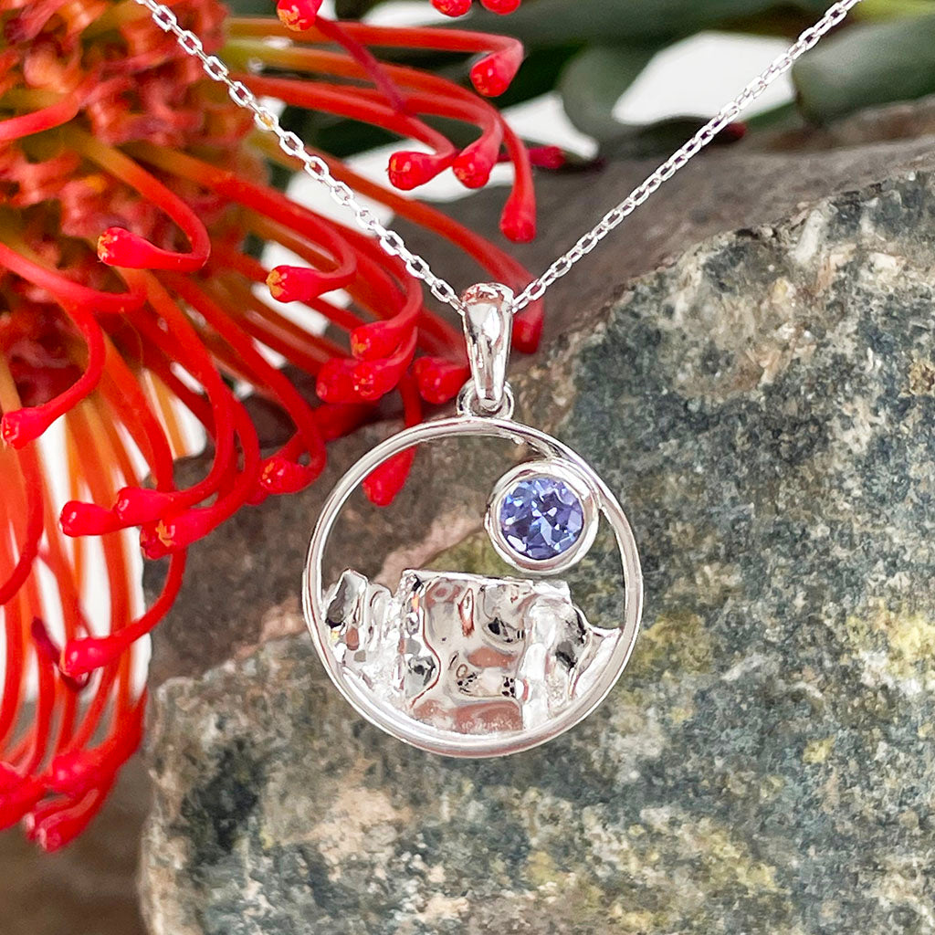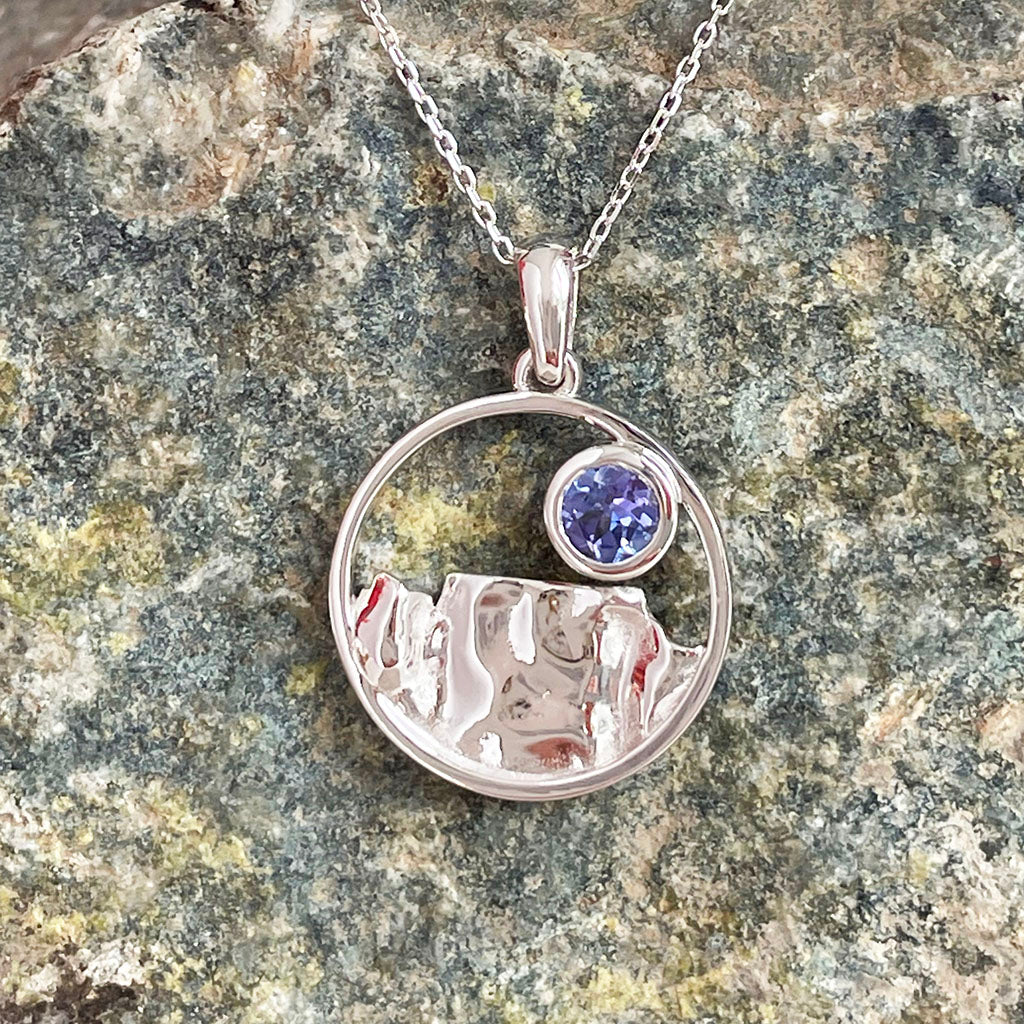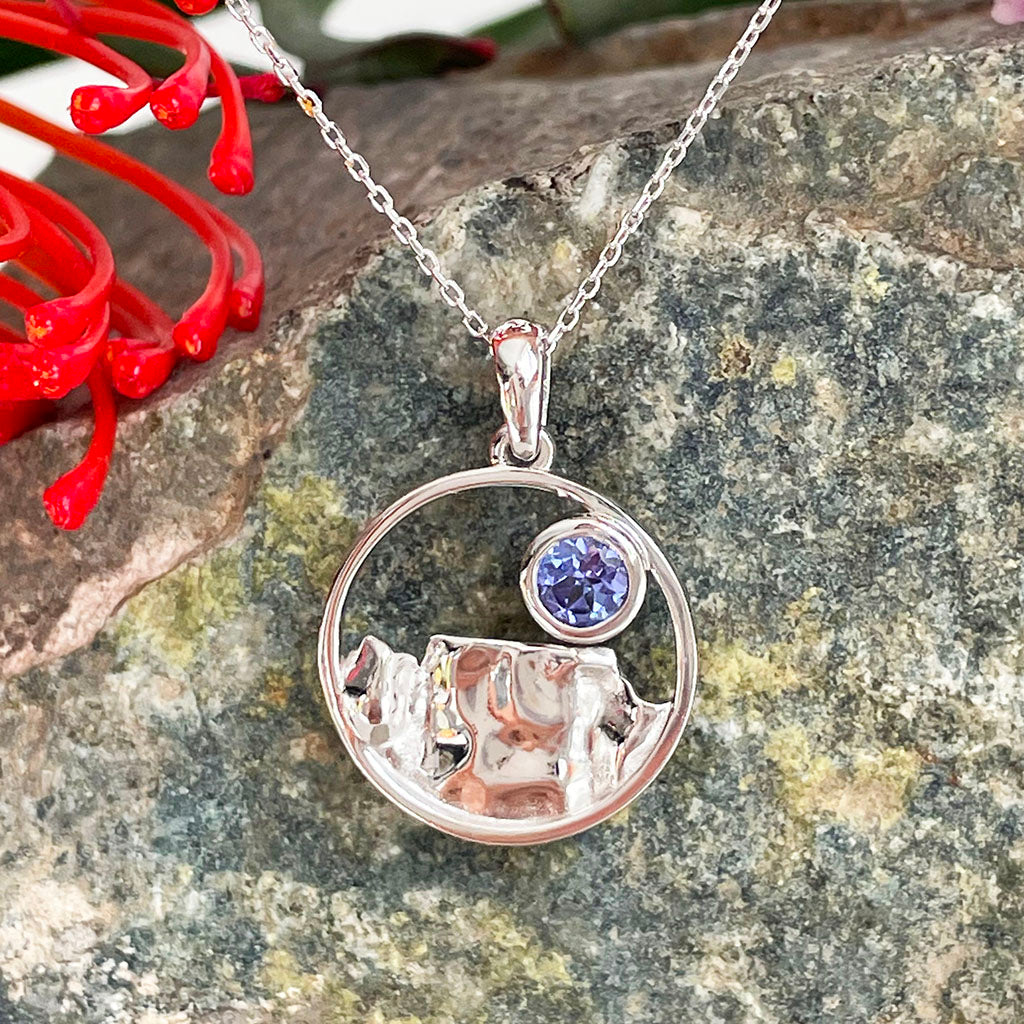 Gold Circular Table Mountain pendant with Tanzanite Highlight in White Gold