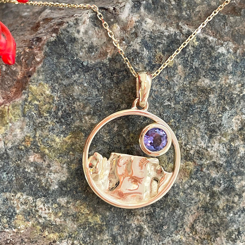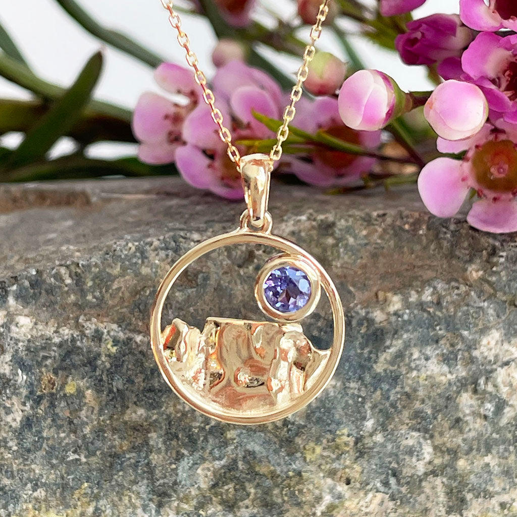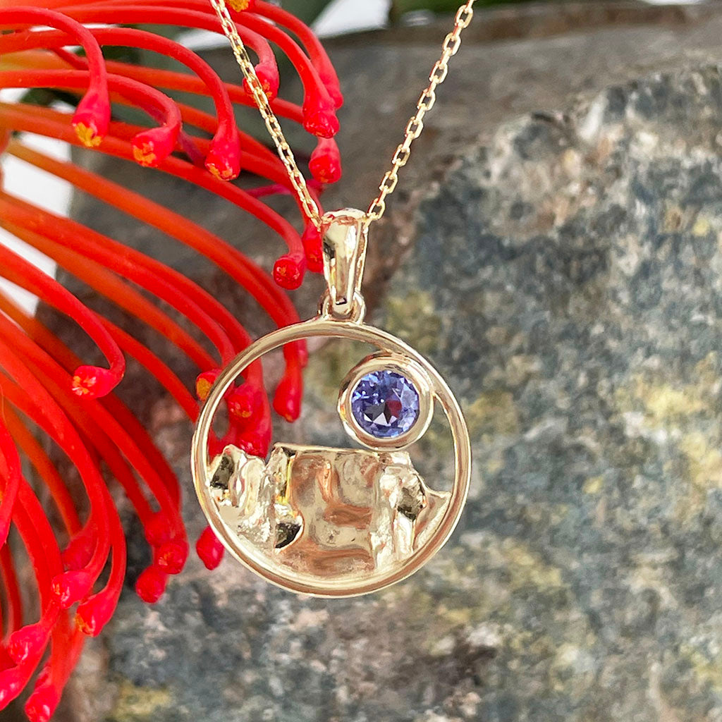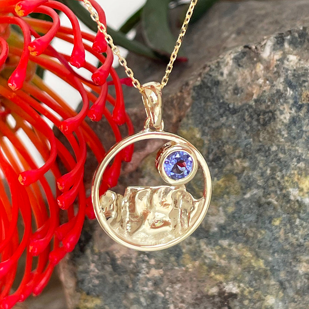 Gold Circular Table Mountain pendant with Tanzanite Highlight in Yellow Gold
