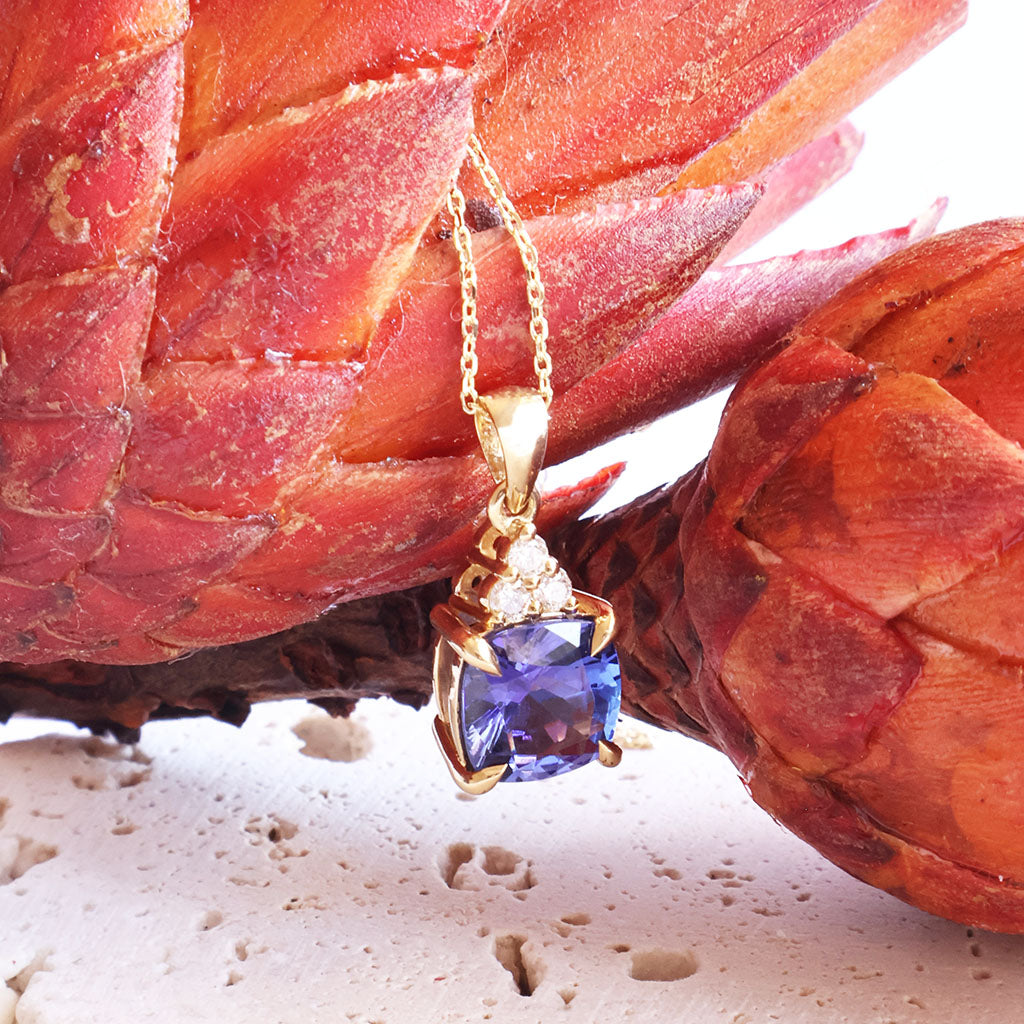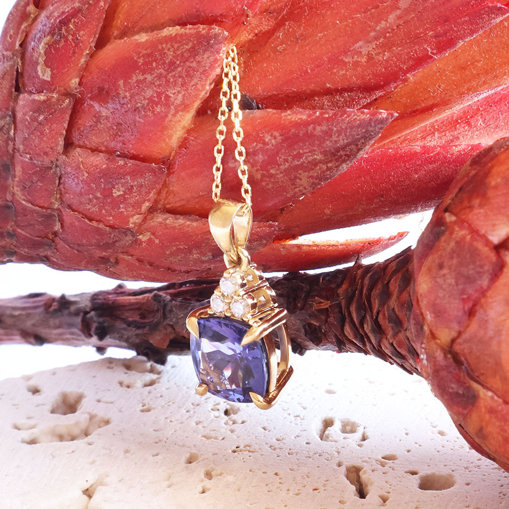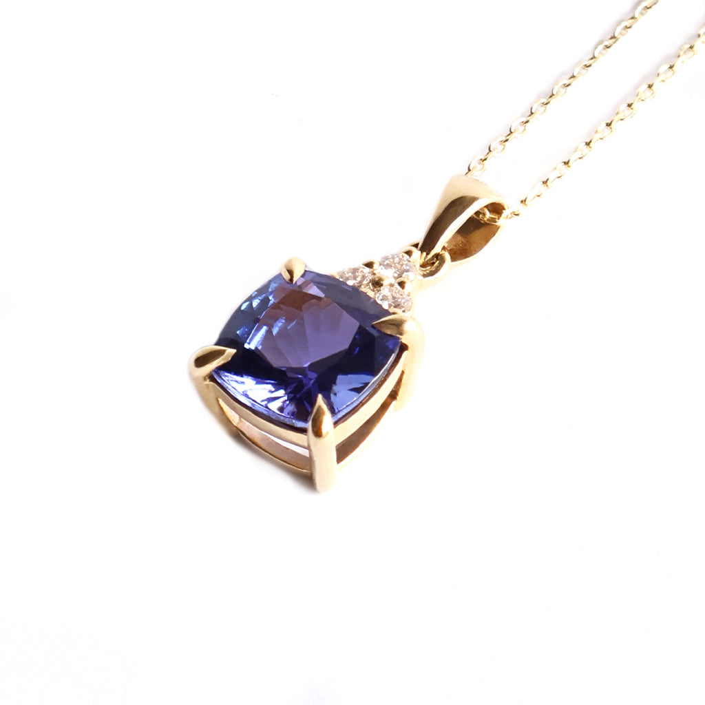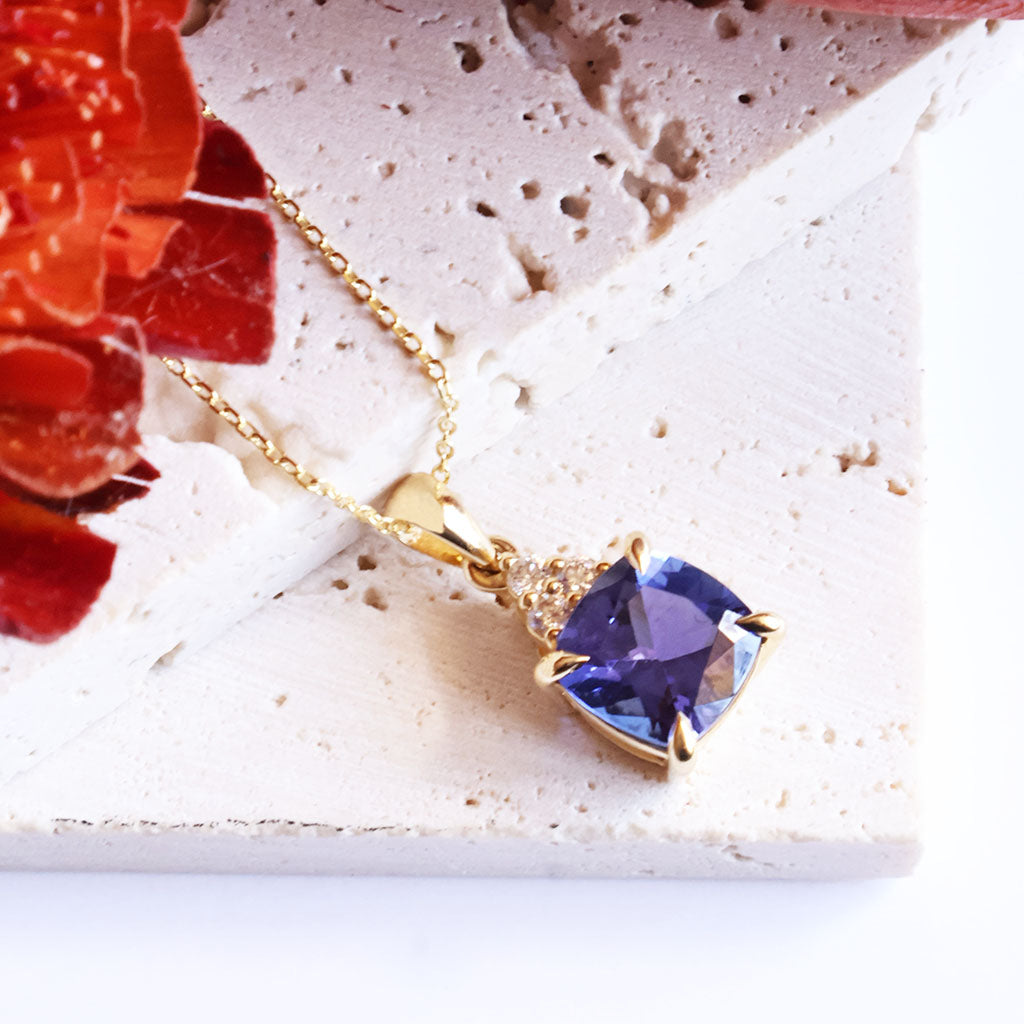 Gorgeous Cushion Cut Tanzanite And Trilogy Diamond Accent Yellow Gold Pendant