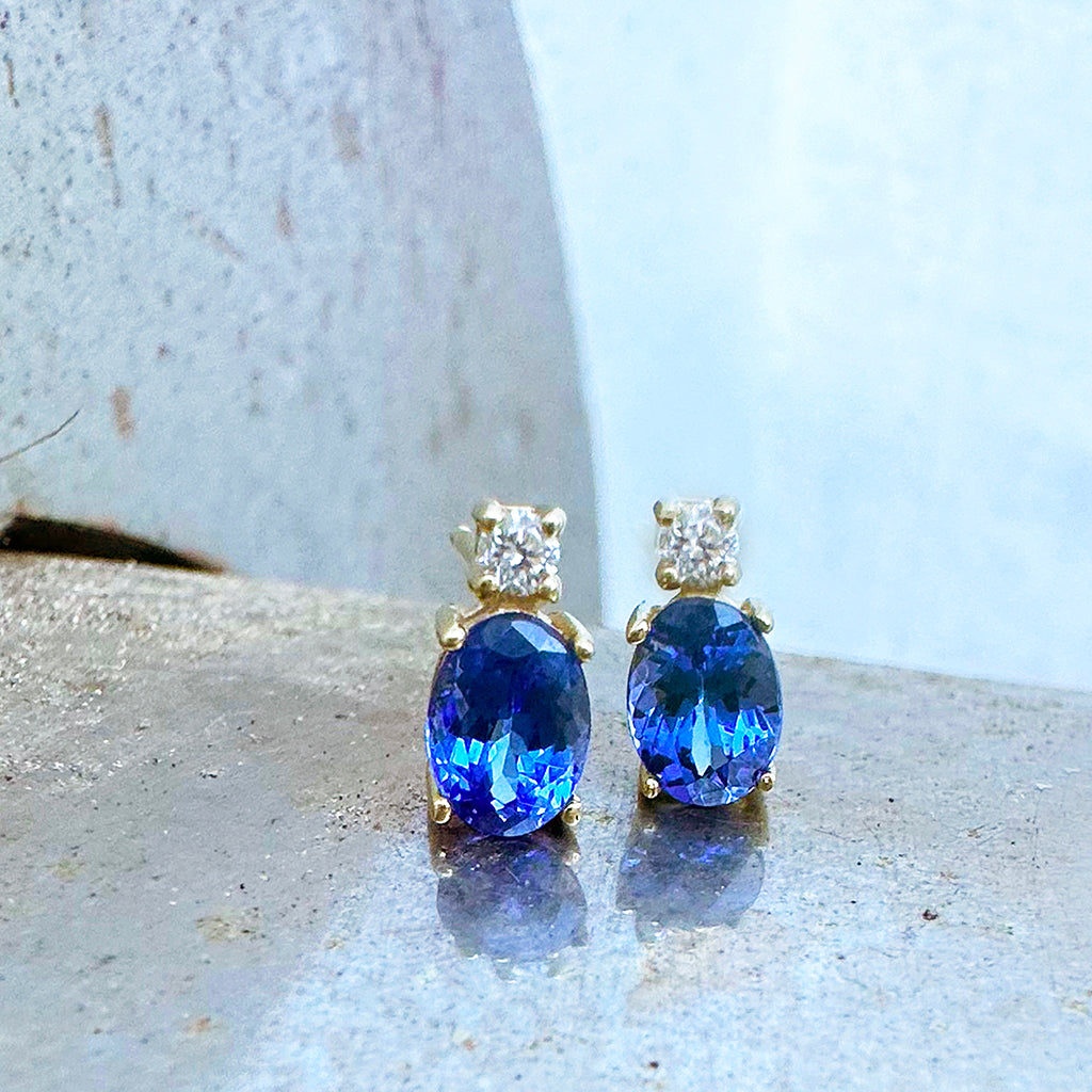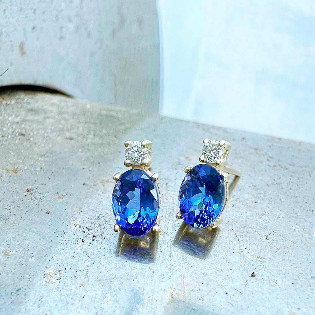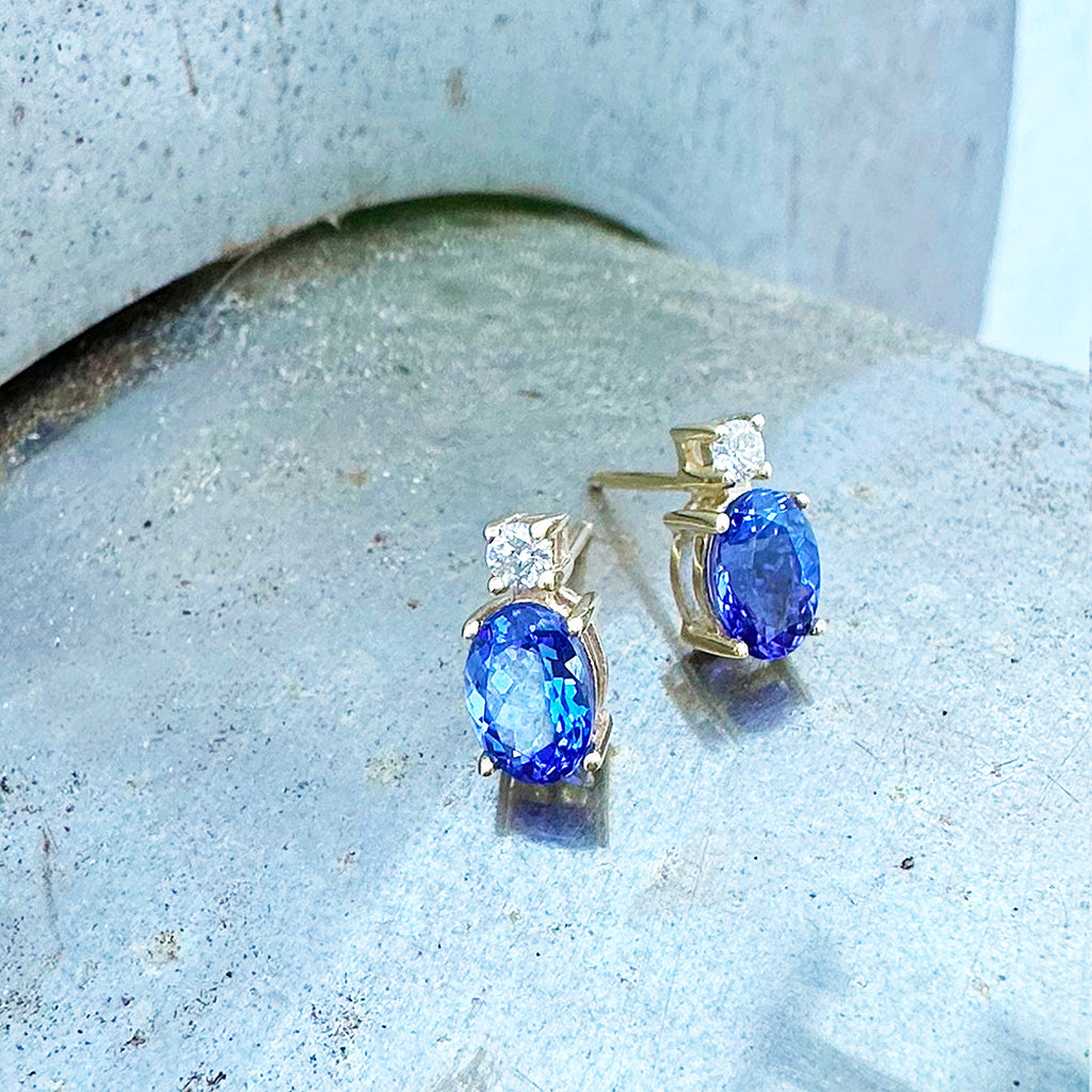 Gorgeous Oval Tanzanite and White Highlight Yellow Gold Studs