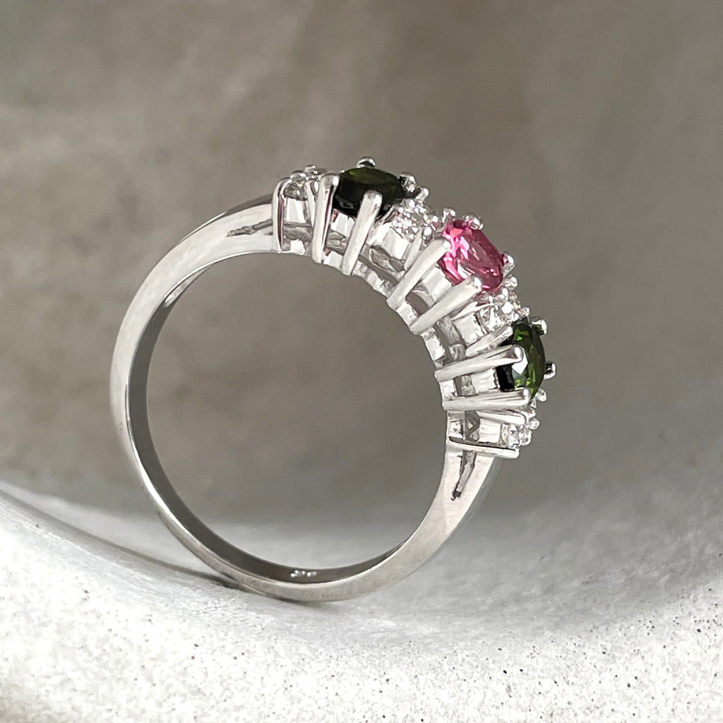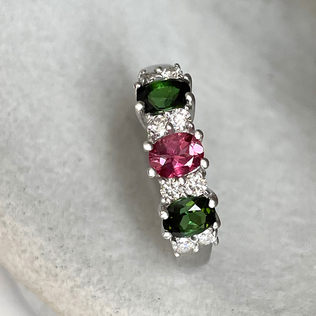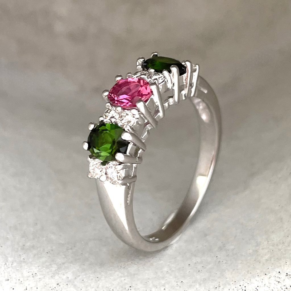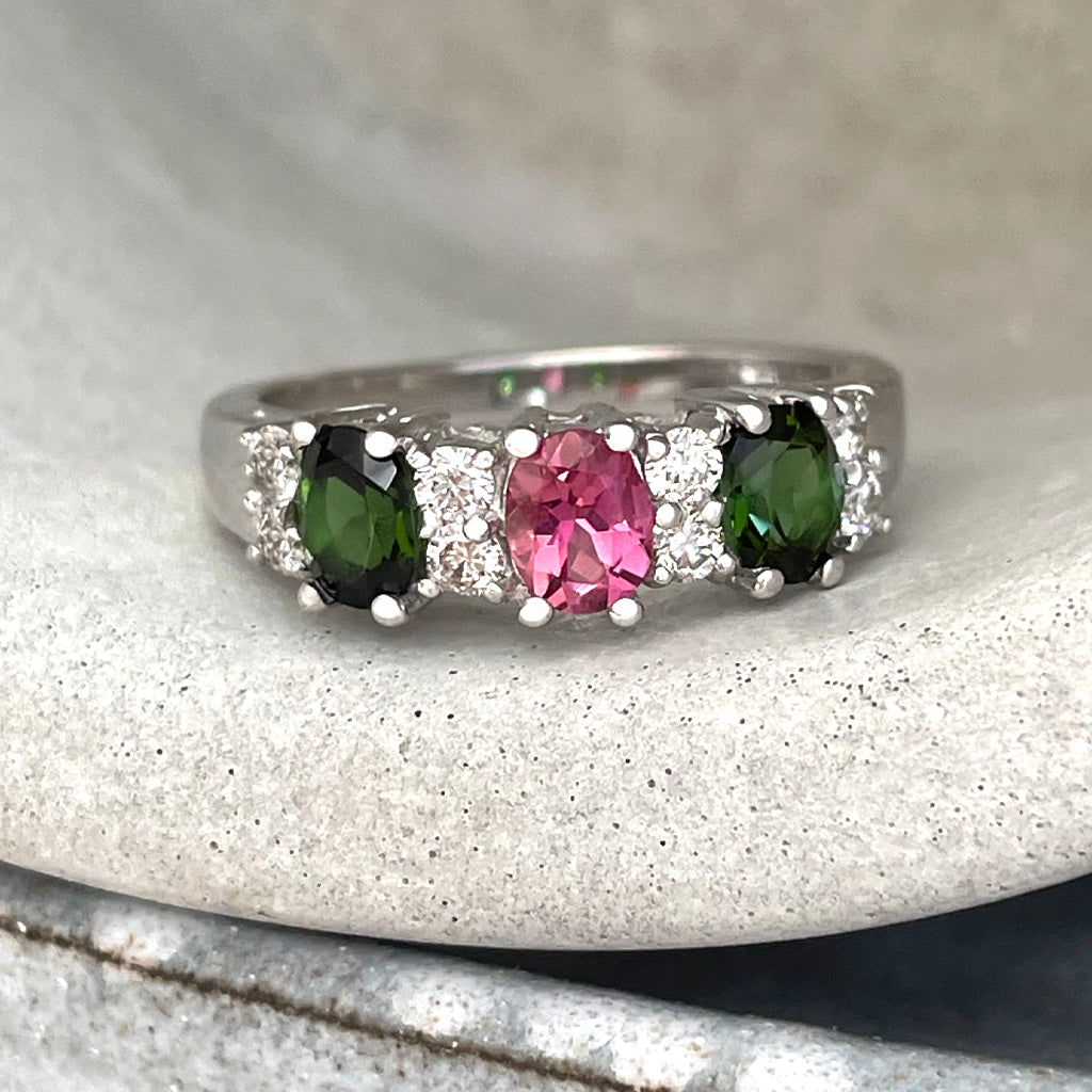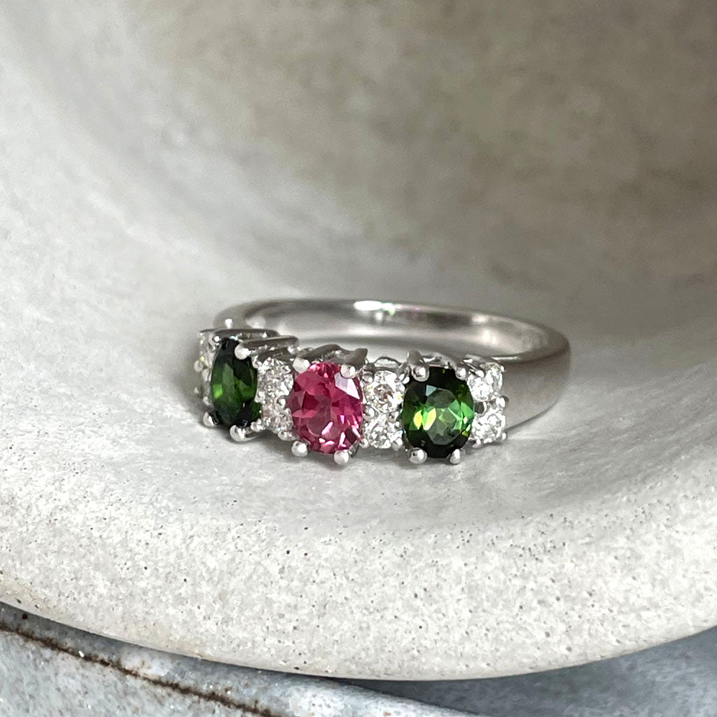 Gorgeous Trilogy Oval Green and Pink Tourmaline and Double Diamond Accent Ring
