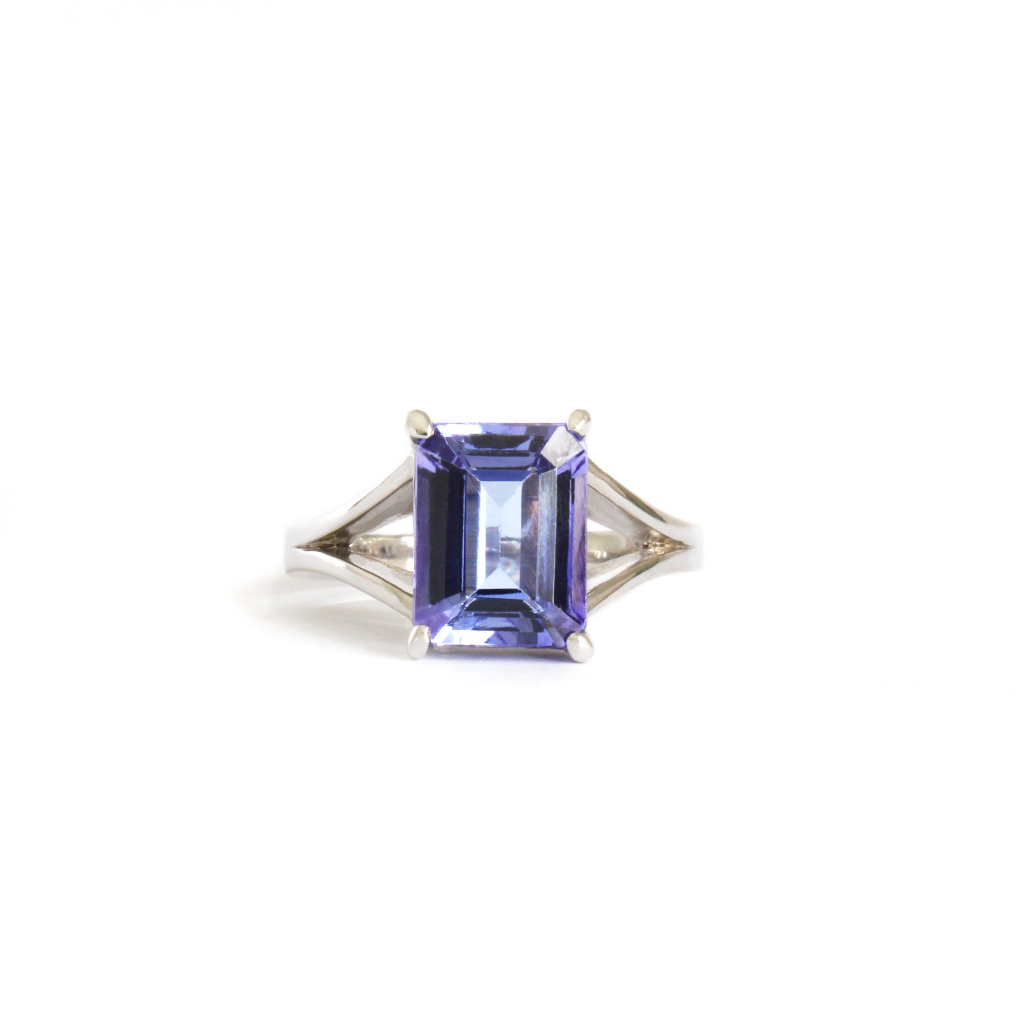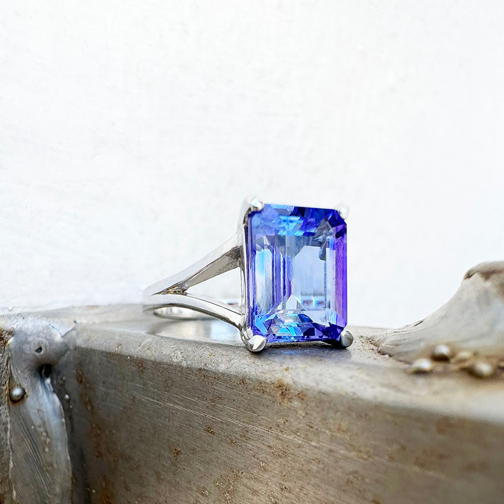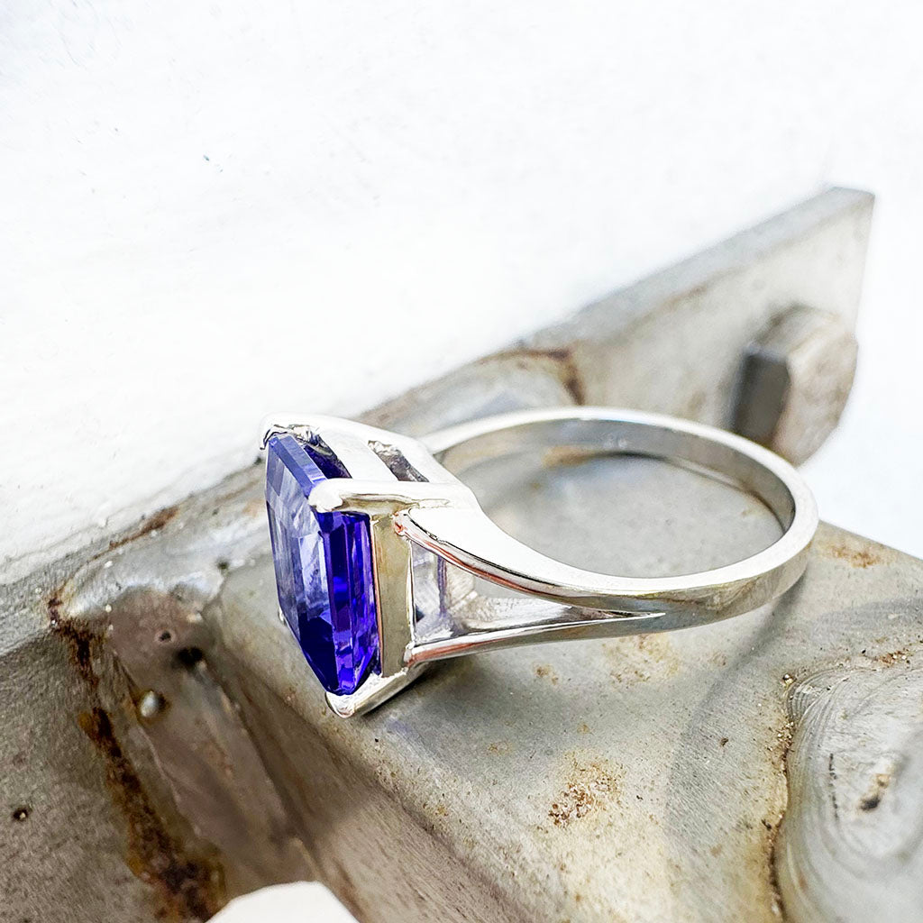 Regal Elevated Emerald Cut Tanzanite Solitaire White Gold Ring