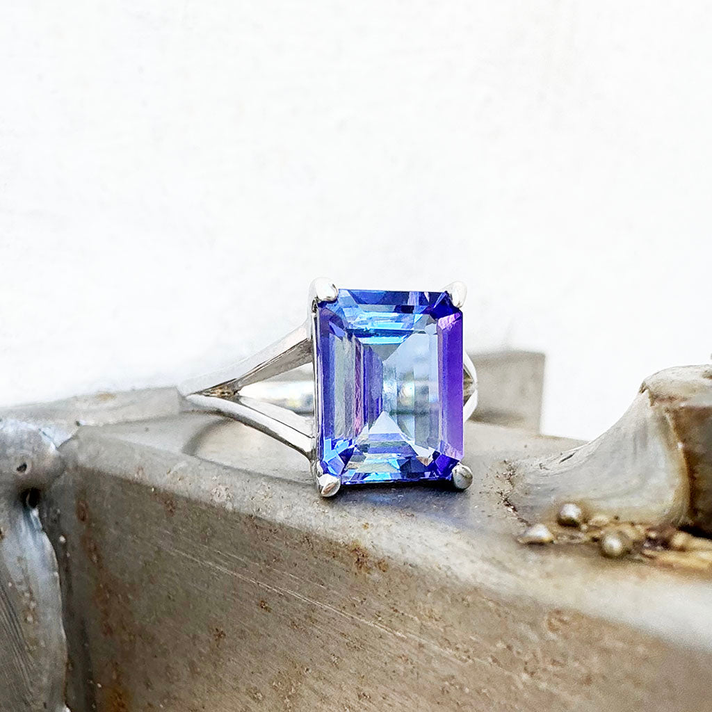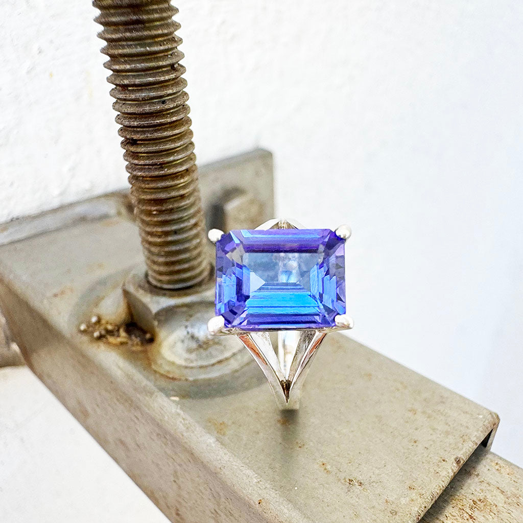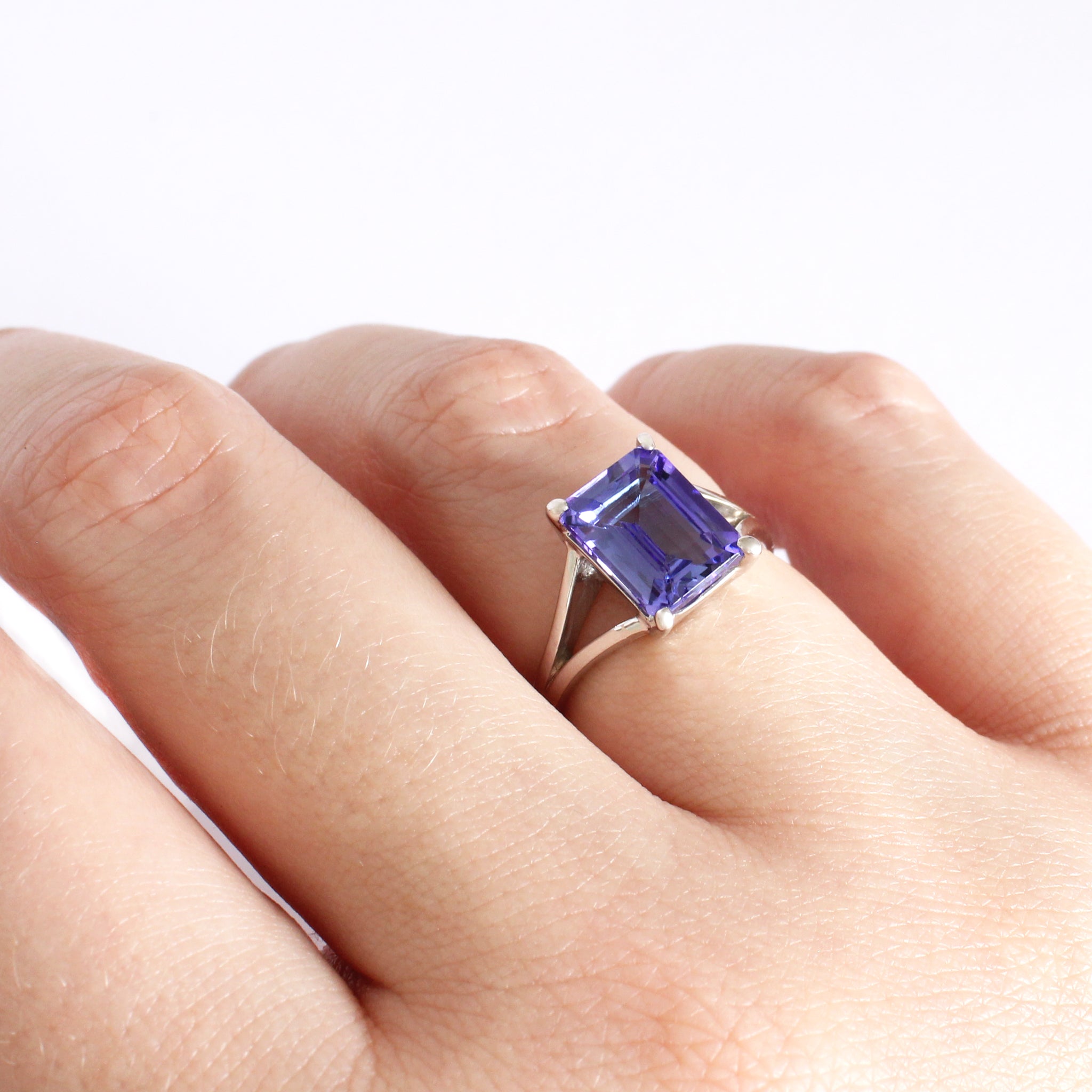 Regal Elevated Emerald Cut Tanzanite Solitaire White Gold Ring