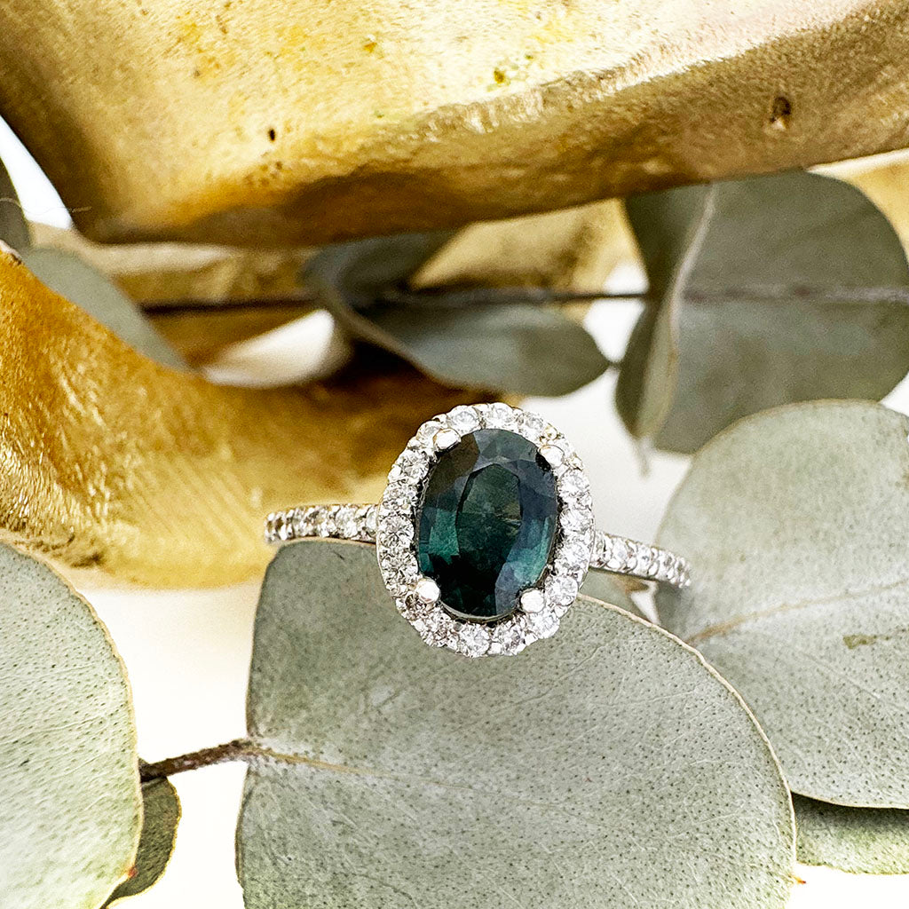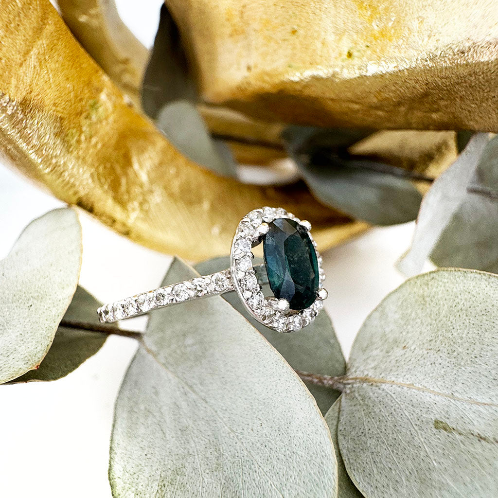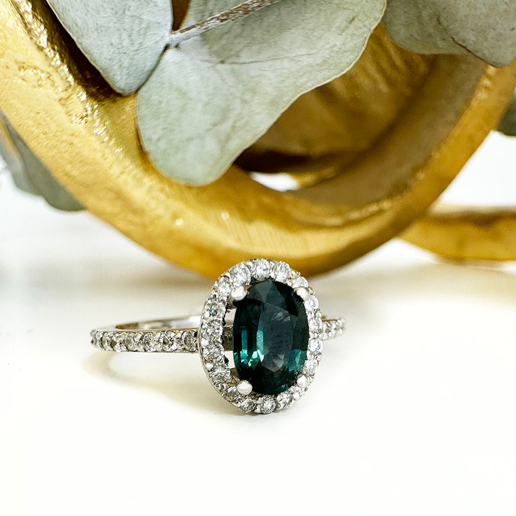 Green Hued Teal Sapphire and Diamond Halo White Gold Ring