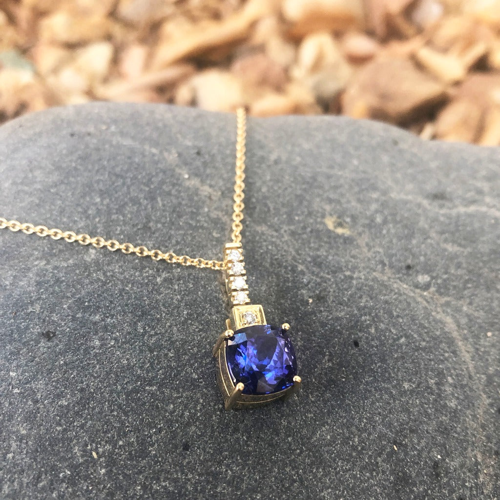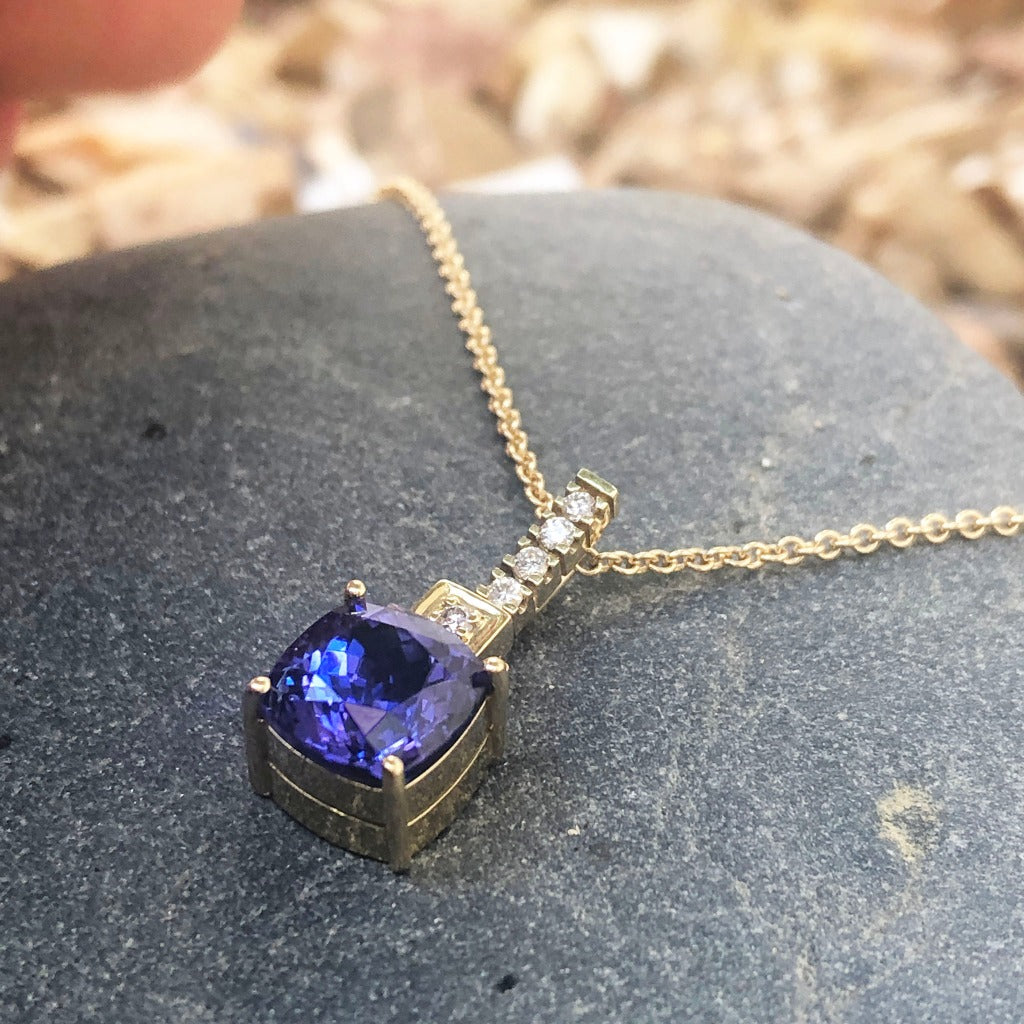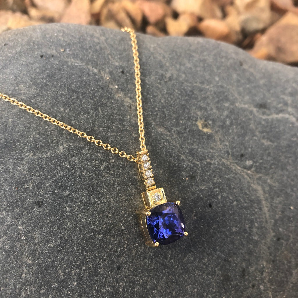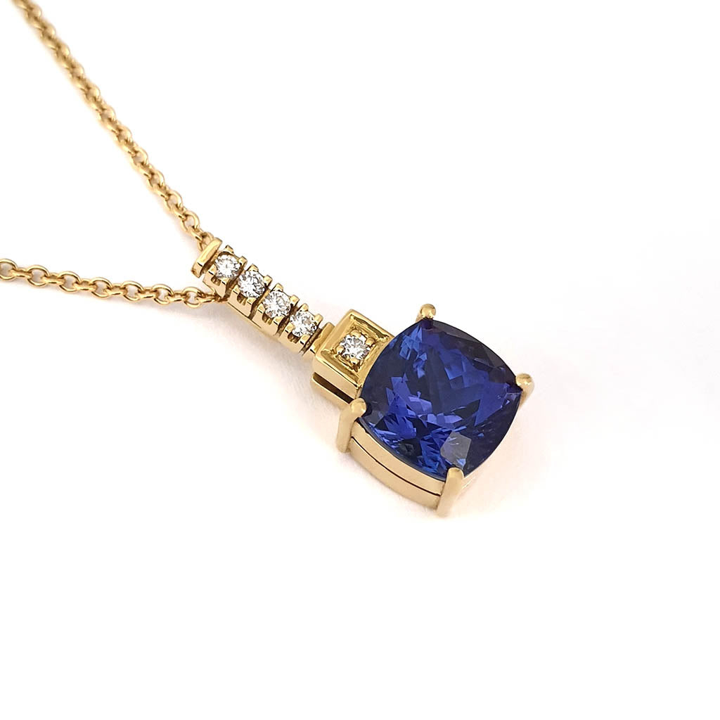 Handcrafted Cushion Cut Tanzanite Yellow Gold Pendant with Diamond Bale Detail