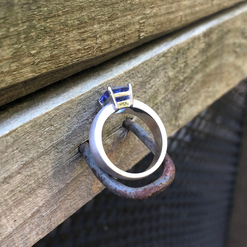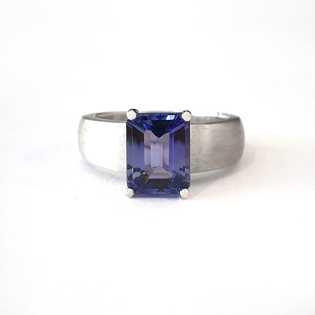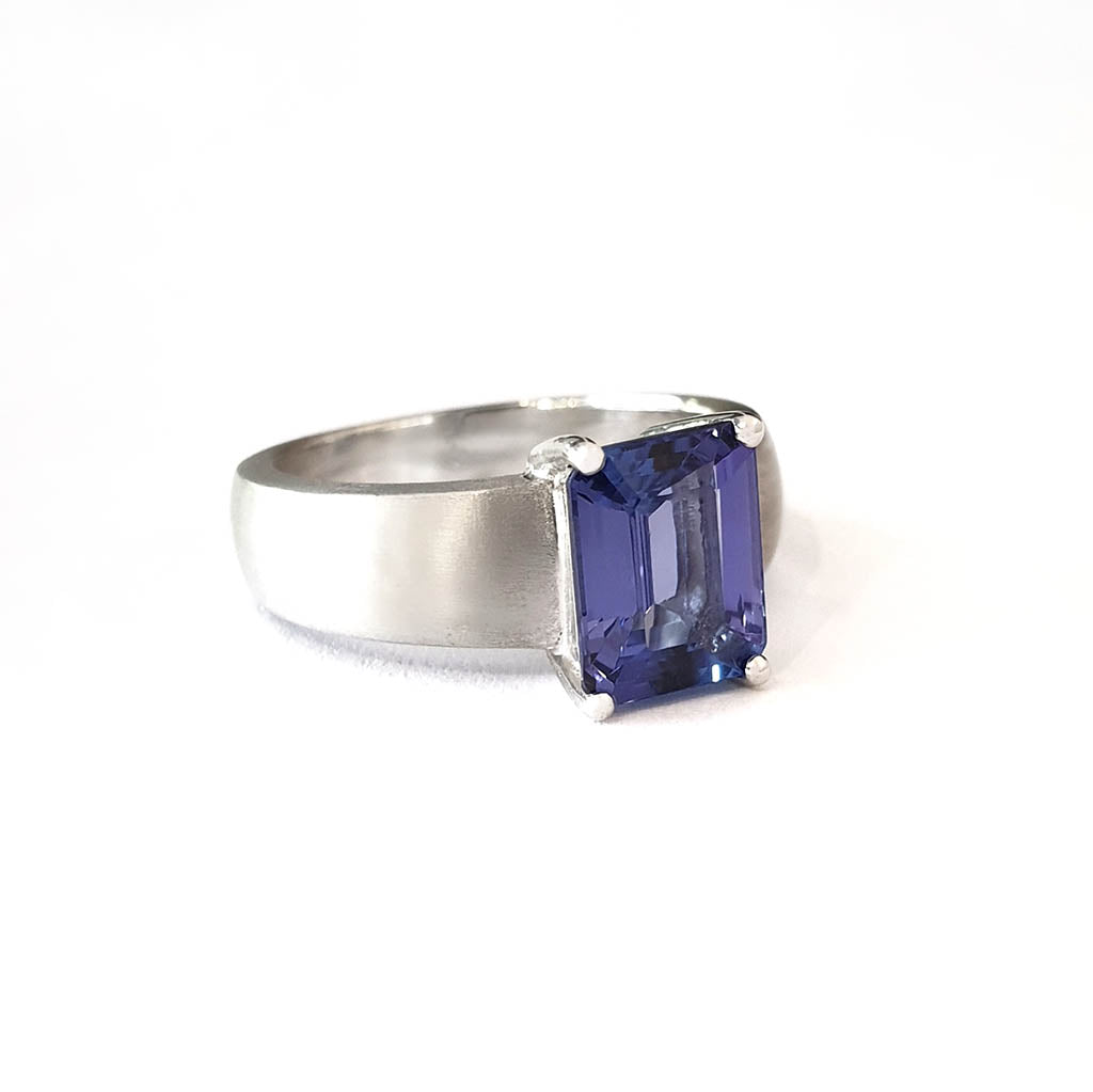 An stunning blue-violet emerald cut tanzanite is set in a brushed nine-carat white gold band in this handcrafted ring. The piece has a bold architectural feel that will suit both feminine and masculine styles.