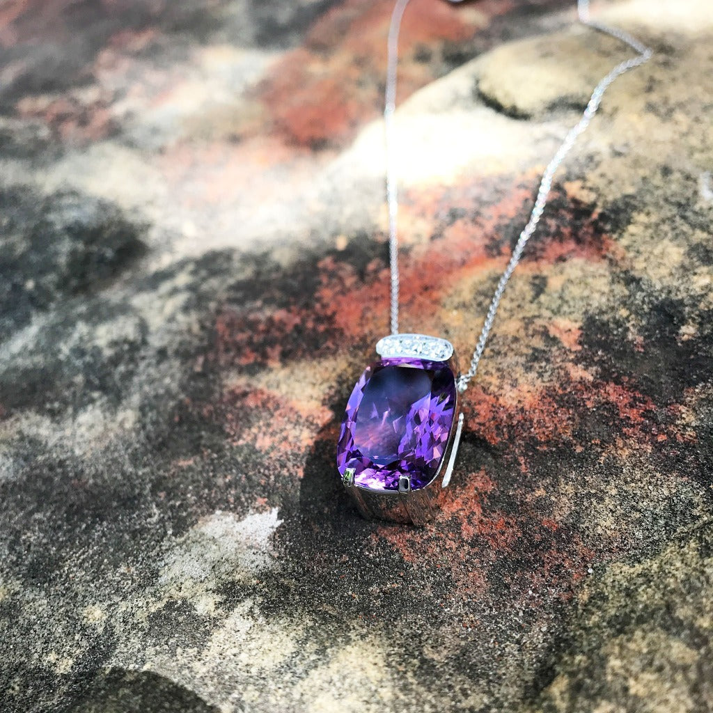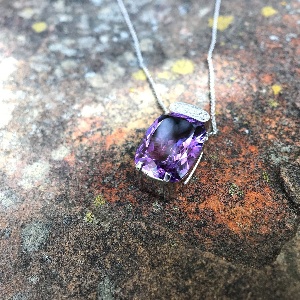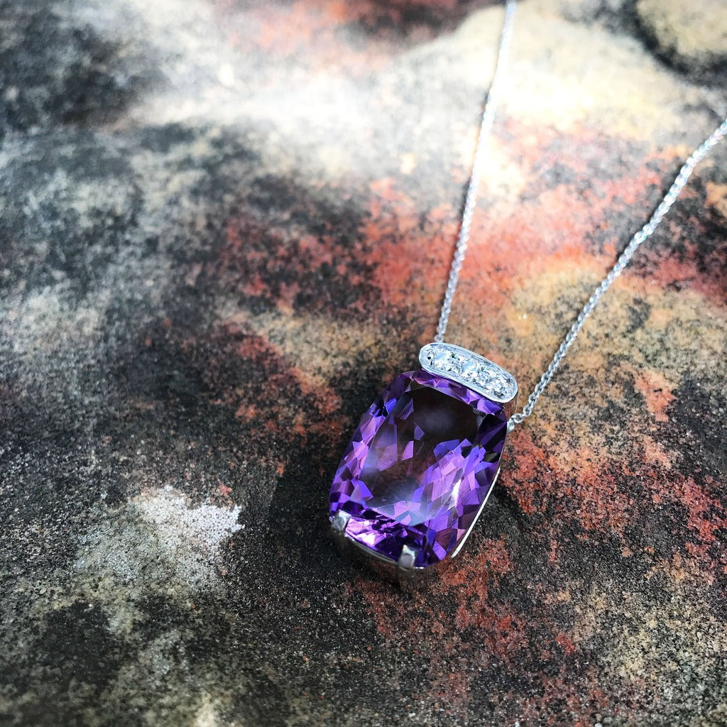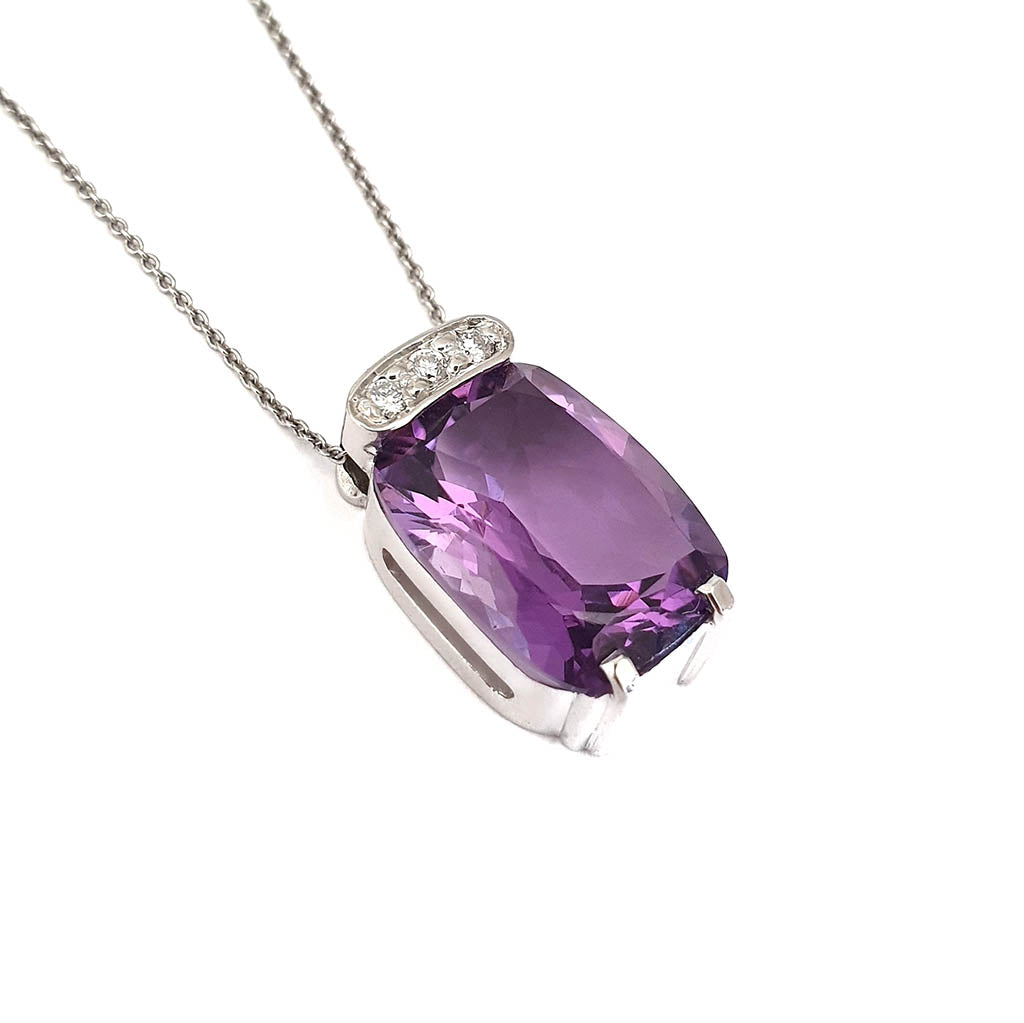 Handcrafted Cushion Cut Amethyst and Diamond Pendant and Chain
