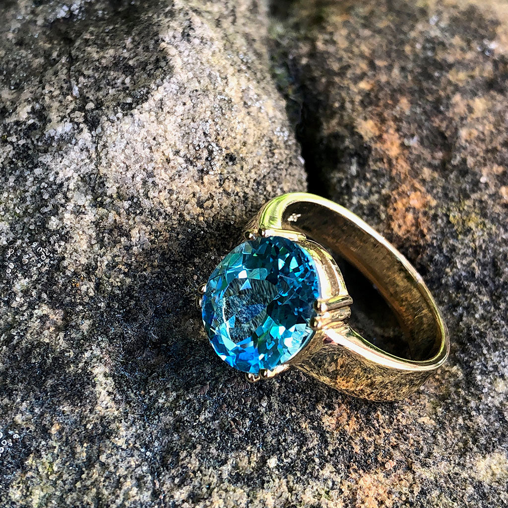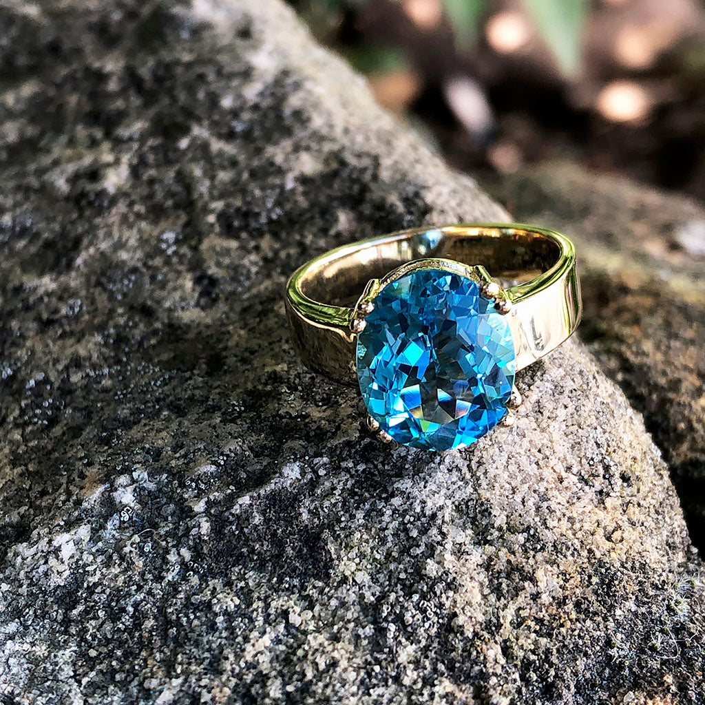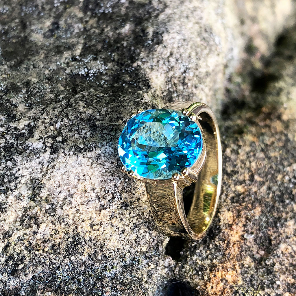 Bold and luxurious, a ring to celebrate your daring soul and adventurous spirit. The intense five carat blue topaz is set in a contrasting yellow gold mount, further enhancing the stone's spectacular colour. This sensational piece encapsulates sumptuous style
