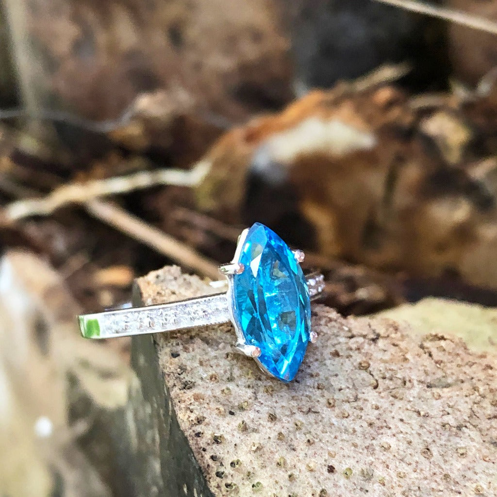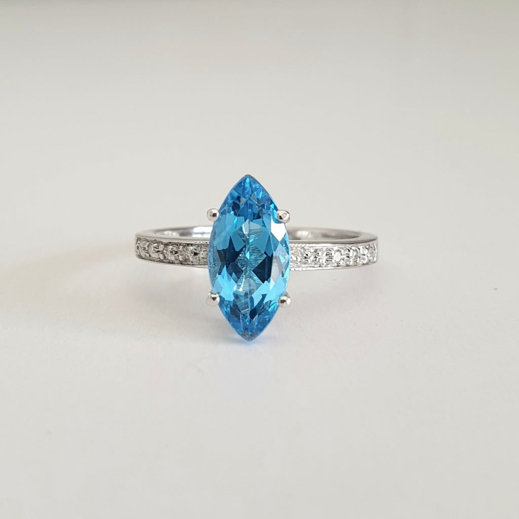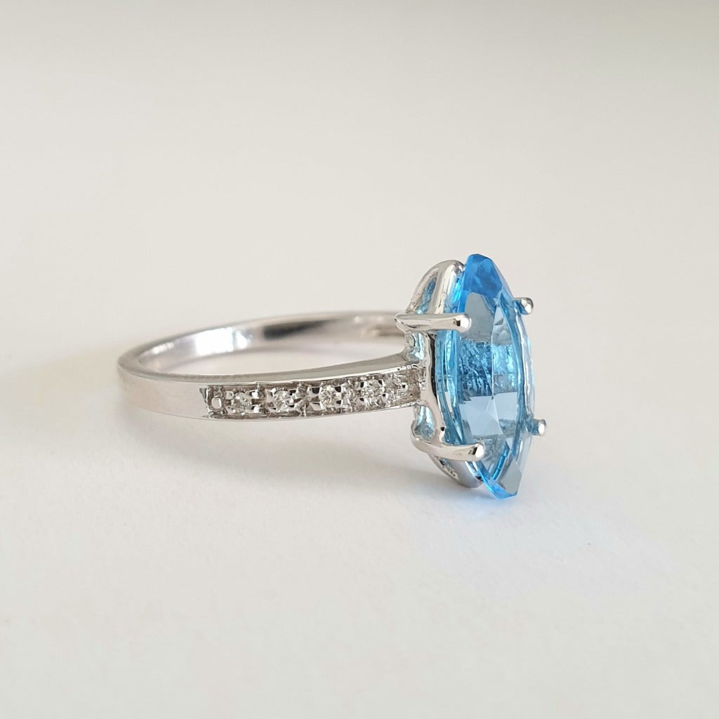 Marquise Cut Blue Topaz White Gold Ring with Diamond Accented Band
